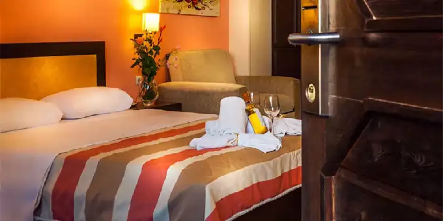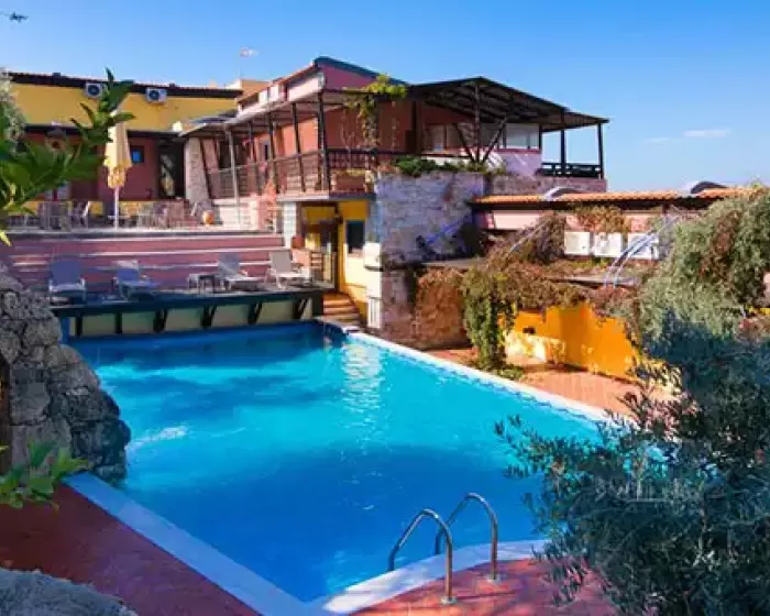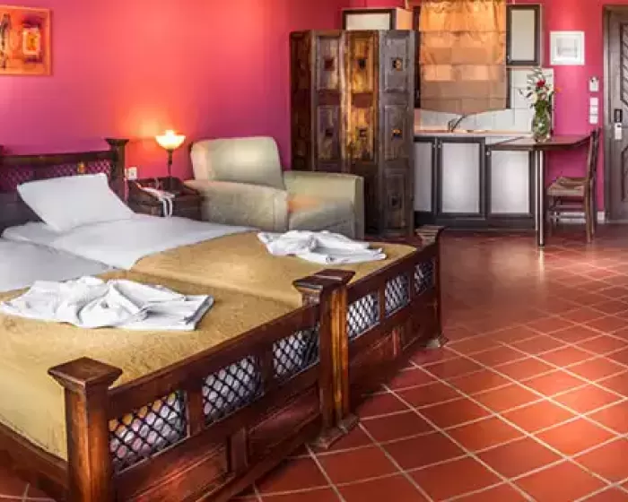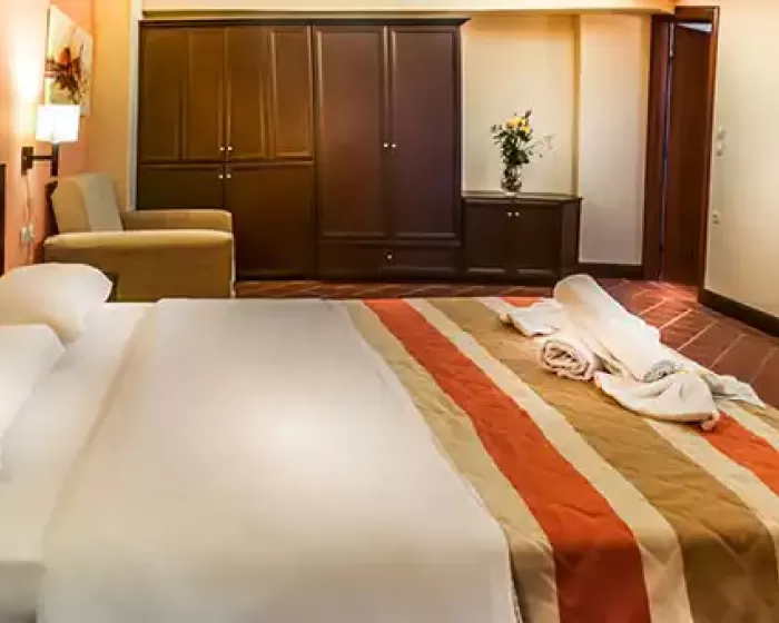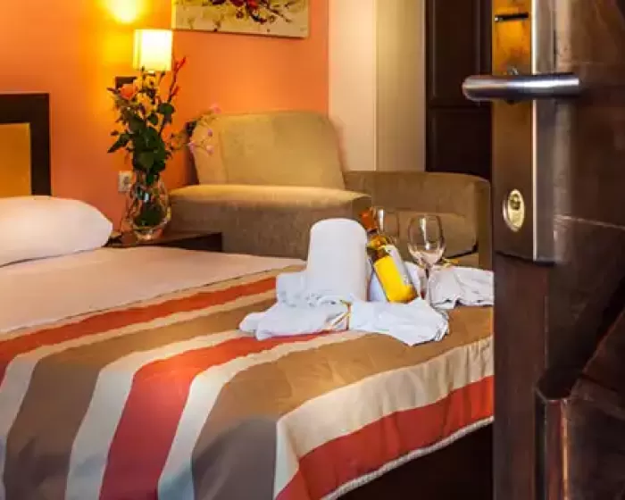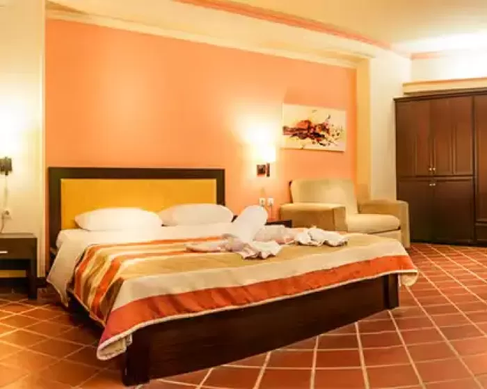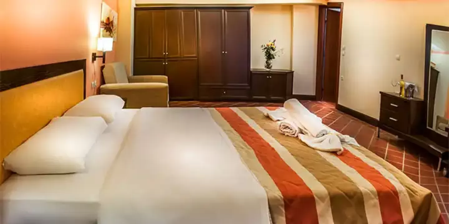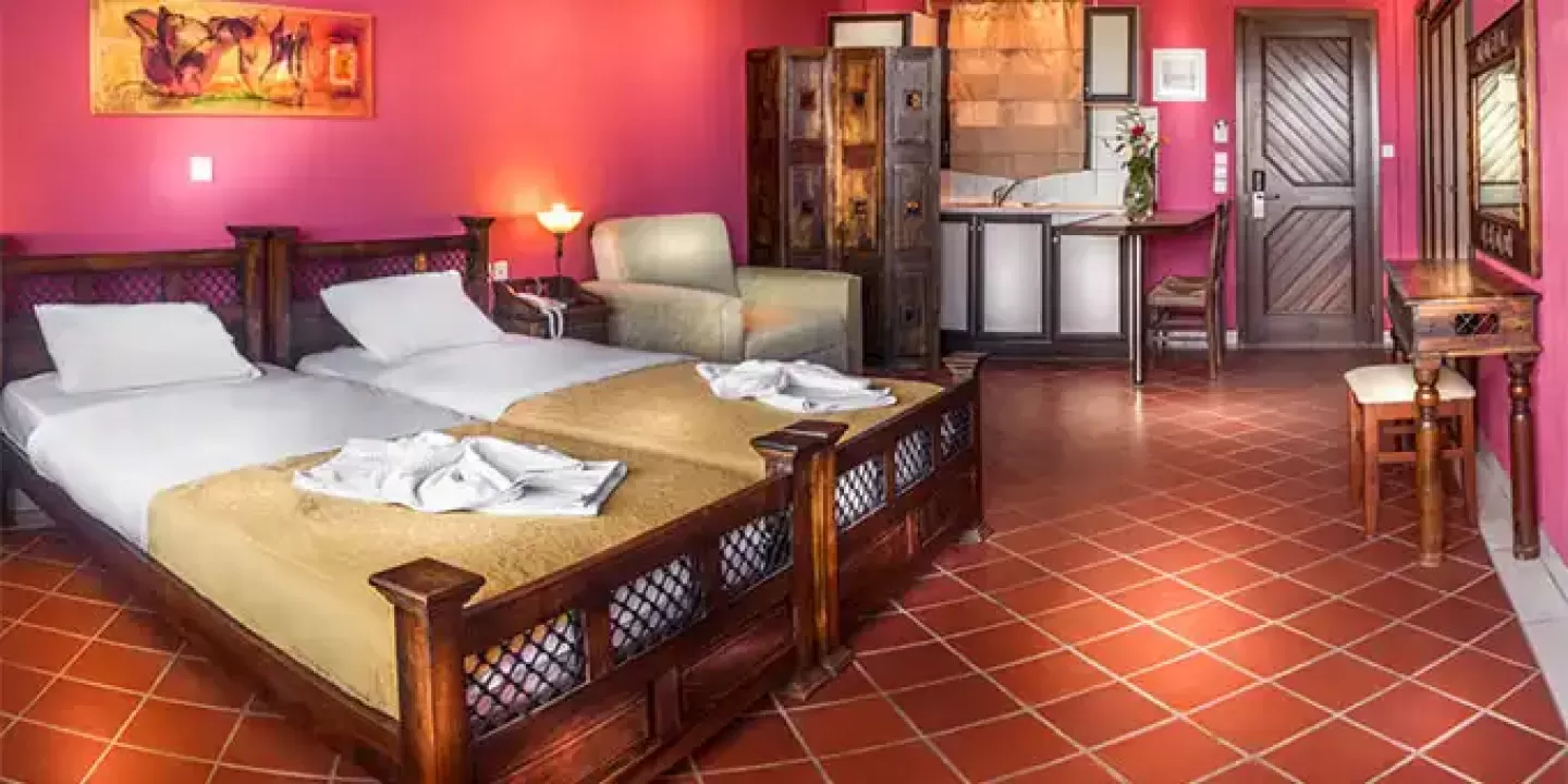 Standard studioje prostrana i opremljena sa stilom, a u nju se mogu smestiti dva gosta. U zavisnosti od sobe, svaka ima ili jedan francuski krevet ili dva odvojena kreveta. Svaka soba ima fotelju i sto sa velikim ogledalom. Svaka soba ima i kupatilo i direktan pristup nameštenom balkonu sa prelepim pogledom.Superior studioje prostrana i opremljena sa stilom, a u nju se mogu smestiti dva gosta. Svaka soba ima francuski krevet. Svaka soba ima fotelju i sto sa velikim ogledalom kao i orman i mali odeljak za kuhinju. Svaka soba ima i kupatilo sa tuš kabinom i direktan pristup nameštenom balkonu sa prelepim pogledom.Deluxe soba je moderna i sa stilom dekorisana soba u koju se mogu smestiti do dva gosta. Spavaći deo čini okrugli krevet. Soba ima i mali kuhinjski deo, kupatilo sa tuš kabinom i privatni balkon sa prelepim pogledom.Apartmanje moderna i sa stilom dekorisana soba u koju se mogu smestiti do četiri gosta. Spavaći deo se sastoji od francuskog kreveta i dvostroukog sofa kreveta u dnevnoj sobi. Suite ima i mali kuhinjski deo, kupatilo sa tuš kabinom i direktan pristup balkonu sa prelepim pogledom.U apartmanu maximum 3 odrasle osobe i 1 dete do 9.99 godina, minimum 3 odrasle osobe.