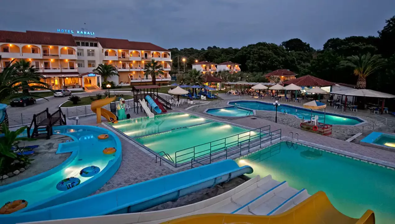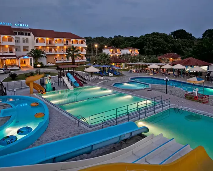 Hotel Kanali Beach Preveza se nalazi na oko osam kilometara udaljenosti od grada i trgovačkog centra regije - Preveze, 17 kilometara od istoimenog aerodroma, u malom i mirnom mestu Kanali, pozicioniran iznad uredjene peščane plaže. Hotel Kanali Beach je u potpunosti okružen zelenilom, i od plaže i najboljeg beach bara u regiji (Mango Beach Bar) udaljen oko 400 metara, a sa kojim je povezan podzemnim prolazom (ne prelazi se ulica). U sklopu hotela je i dečiji aqua park, sa 5 velikih tobogana, 4 mala, 4 bazena, lazy rekom i jacuzzi-jem (besplatno za goste hotela tokom sezone 2019). Hotel je kompletno renoviran 2013. godine, i delimično osvežen 2016. godine.