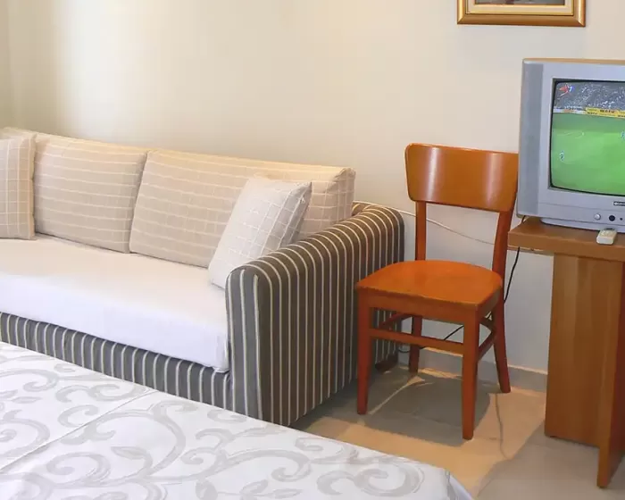 Salon sa sofom i odvojena spavaća soba sa francuskim ležajem.
