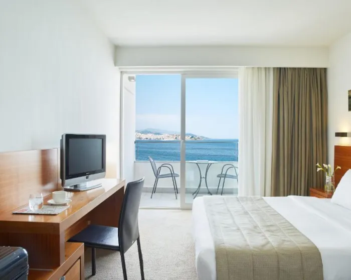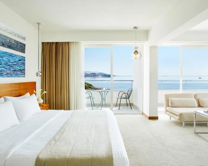 Executive Suite - pogled na more. Izuzetan dizajn i nameštaj. LCD TV, 3 balkona, kada. Francuski ležaj ili 2 odvojena ležaja, dodatni ležaj - sofa. Max. do 3 odrasle osobe ili 2 odrasle osobe i 2 deteta.