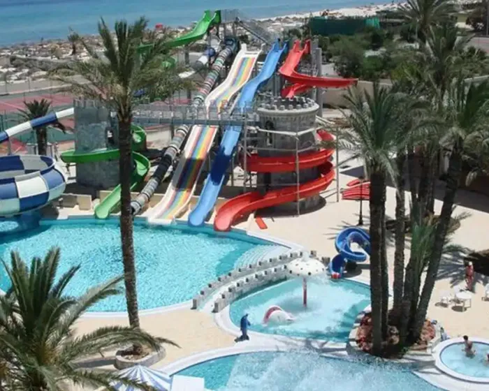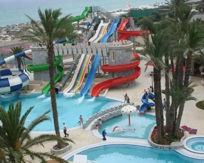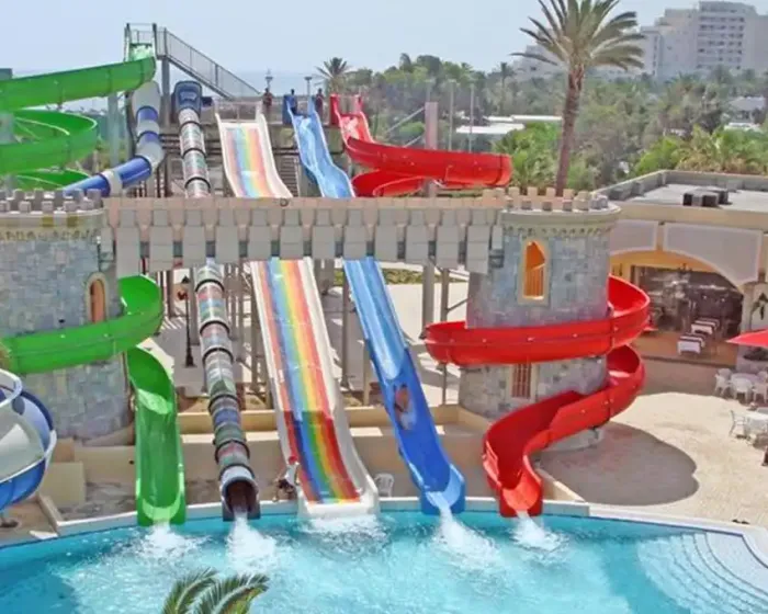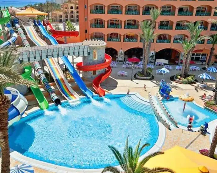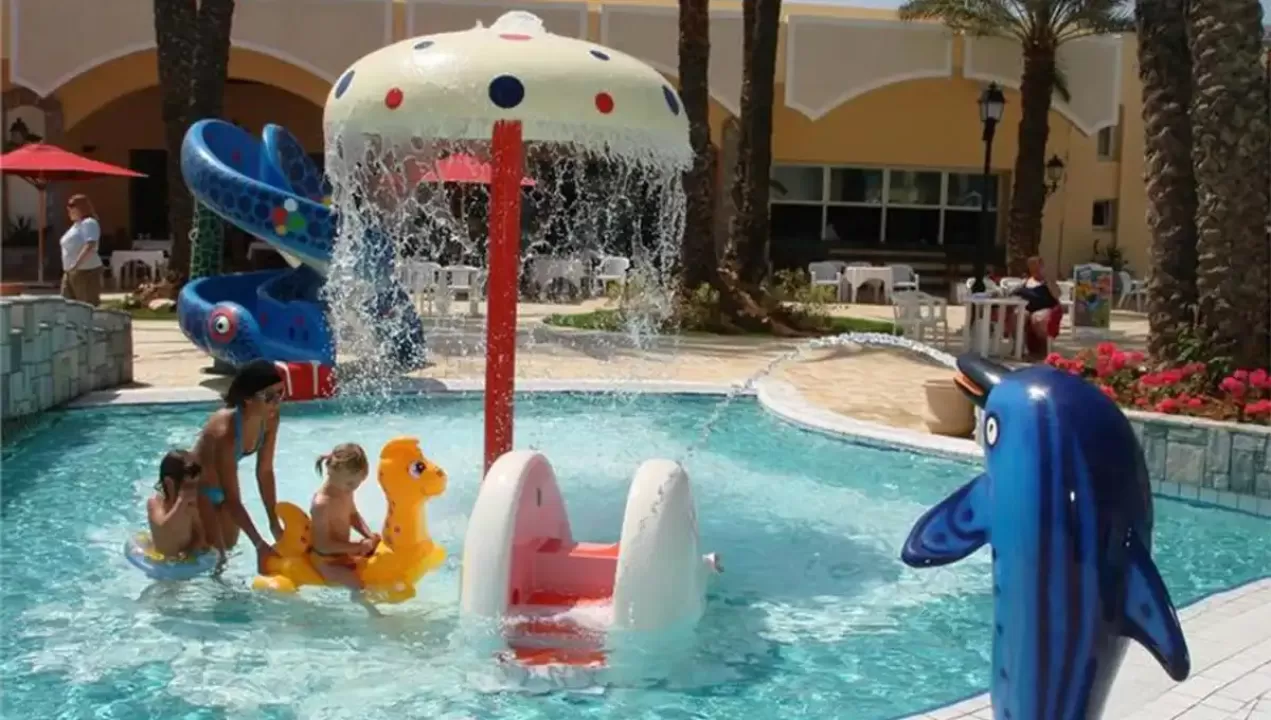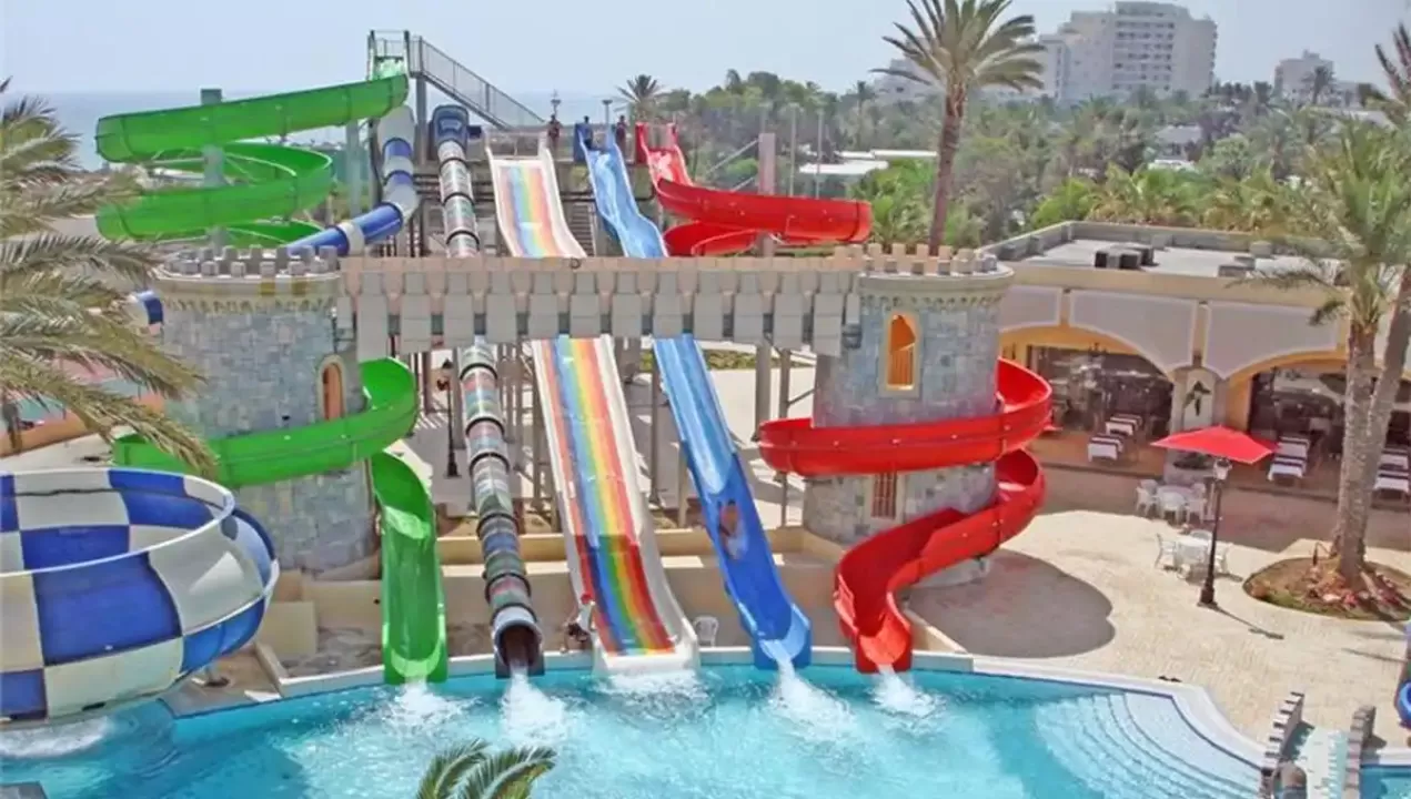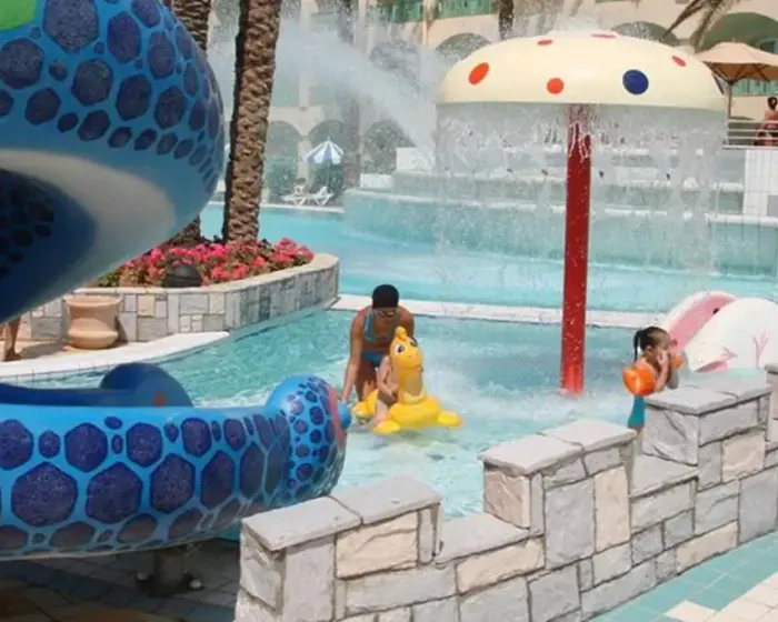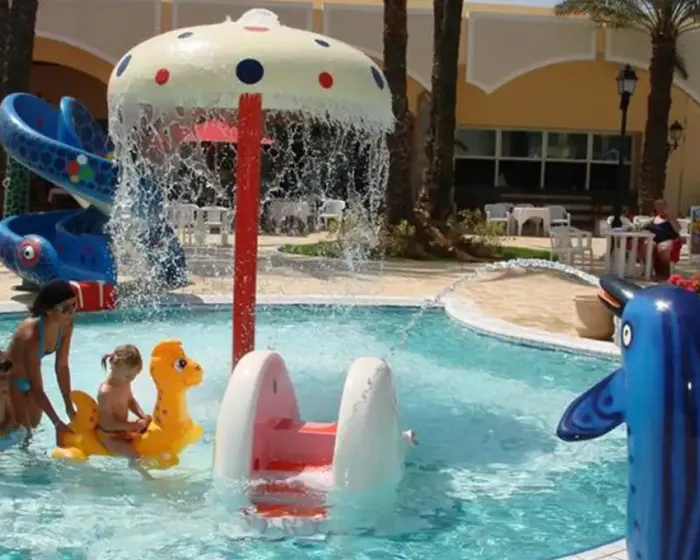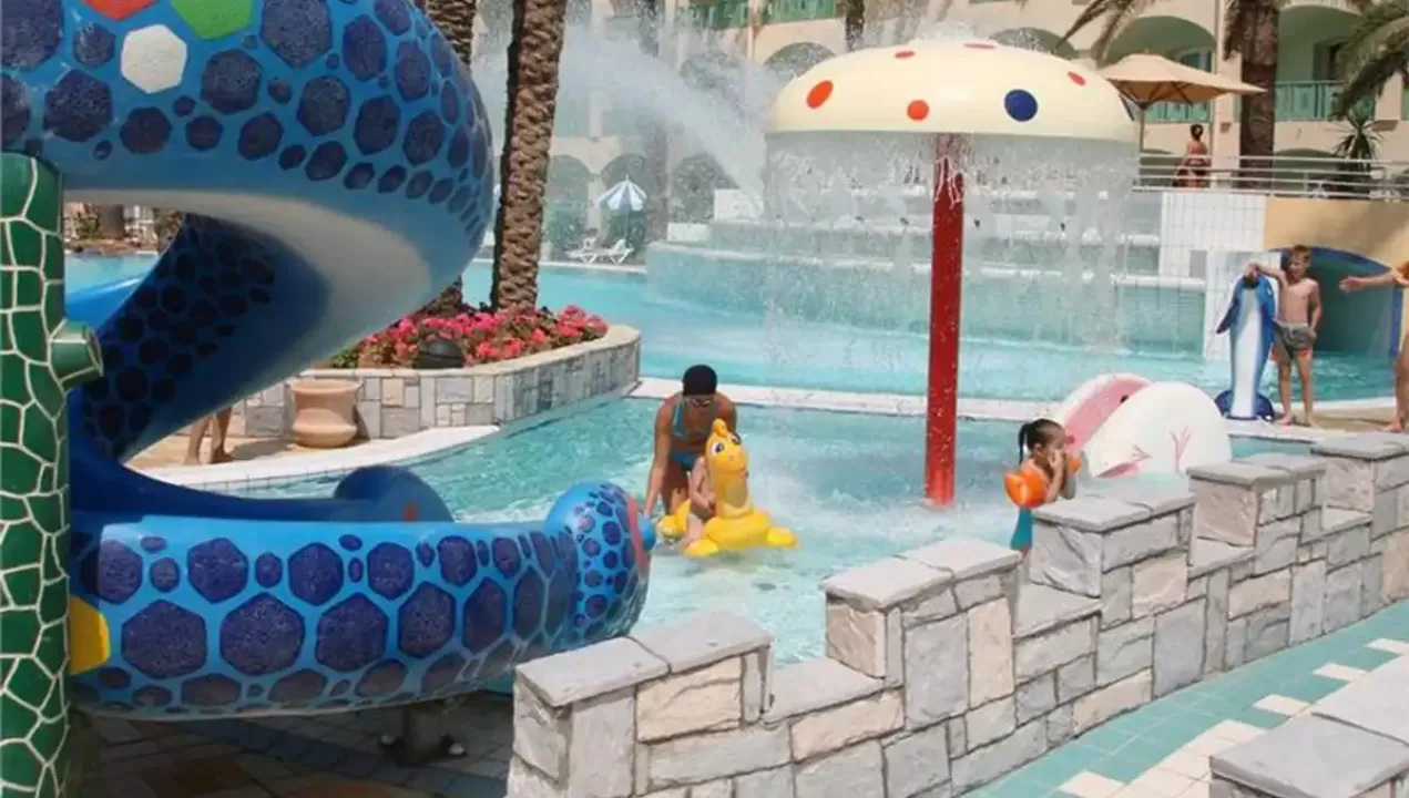 recepcija, veliki spoljašnji bazen podeljen na bazen sa akva parkom koji ima 6 tobogana, bazen za odrasle i dečiji bazen, unutrašnji bazen, tri lifta, dva restorana i dva bara, dečije stolice u restoranu, igralište, bazen za decu, akva park, mini disko i crtani filmoviSadržaji i aktivnosti uključene u cenu:Bežični internet na zajedničkim površinama, fitness, stoni tenis, aqua gym, odbojka na plaži, vaterpolo, fudbal, rukomet, đakuzi u bazenu.Sadržaji i aktivnosti koje se doplaćuju:Sef na recepciji, peškiri za plažu, masaža, hamam, teniski teren, uvozna i luksuzna pića i sve usluge koje nisu obuhvaćene all inclusive konceptom.