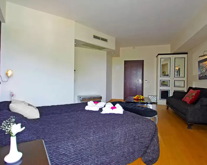 Superior soba - spavaća soba sa bračnim krevetom, pogled na more i vrt hotela.