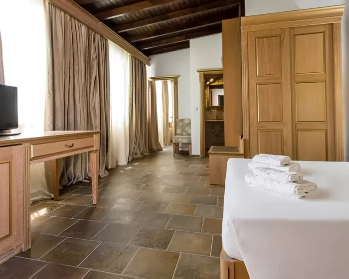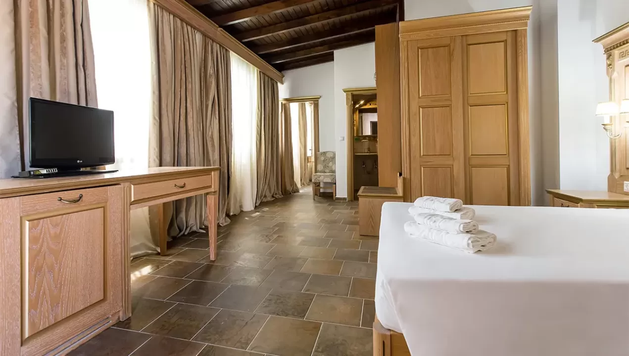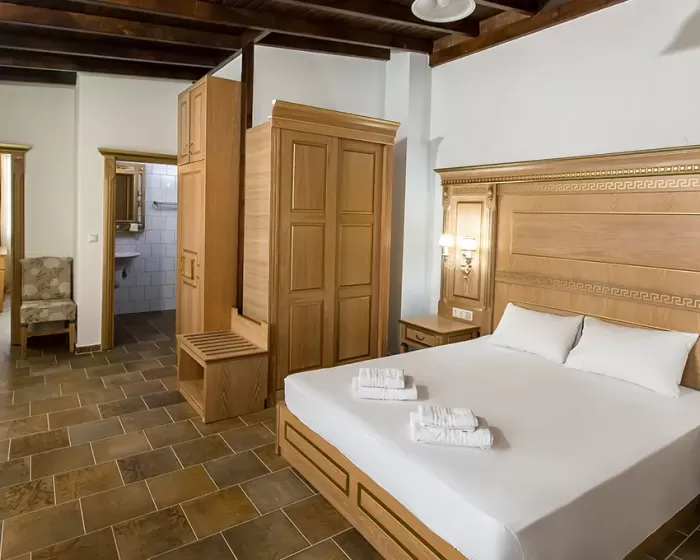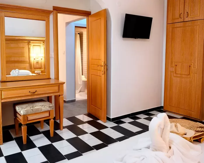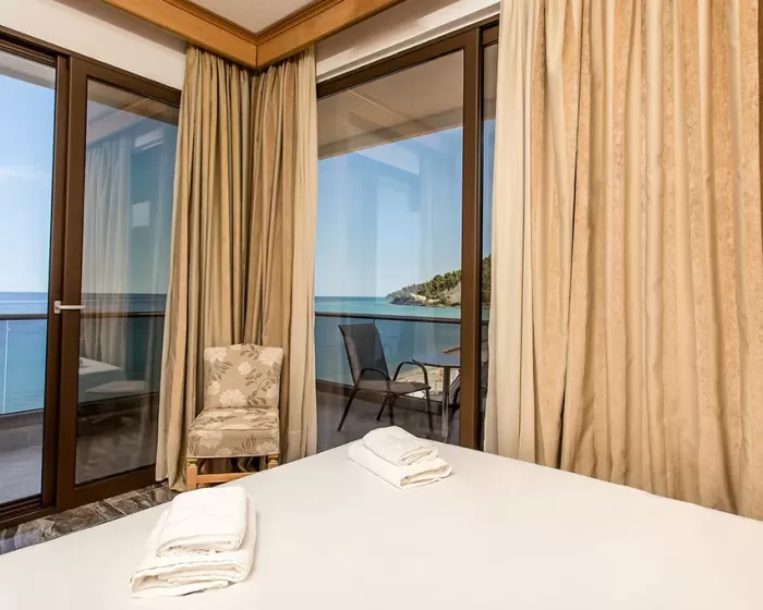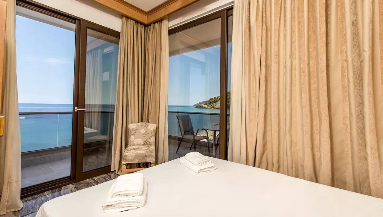 Porodična soba sa jednom odvojenom spavaćomm sobom i bočnim pogledom na more. Ove klimatizovane porodične sobe od 38m² imaju dva bračna kreveta i jedan udoban pomoćni ležaj, frižider, TV, sef, kupatilo sa tušem kao i privatni balkon sa bočnim pogledom na more sa stolićem i stolicama. Porodične sobe mogu da prime do 5 osoba.
