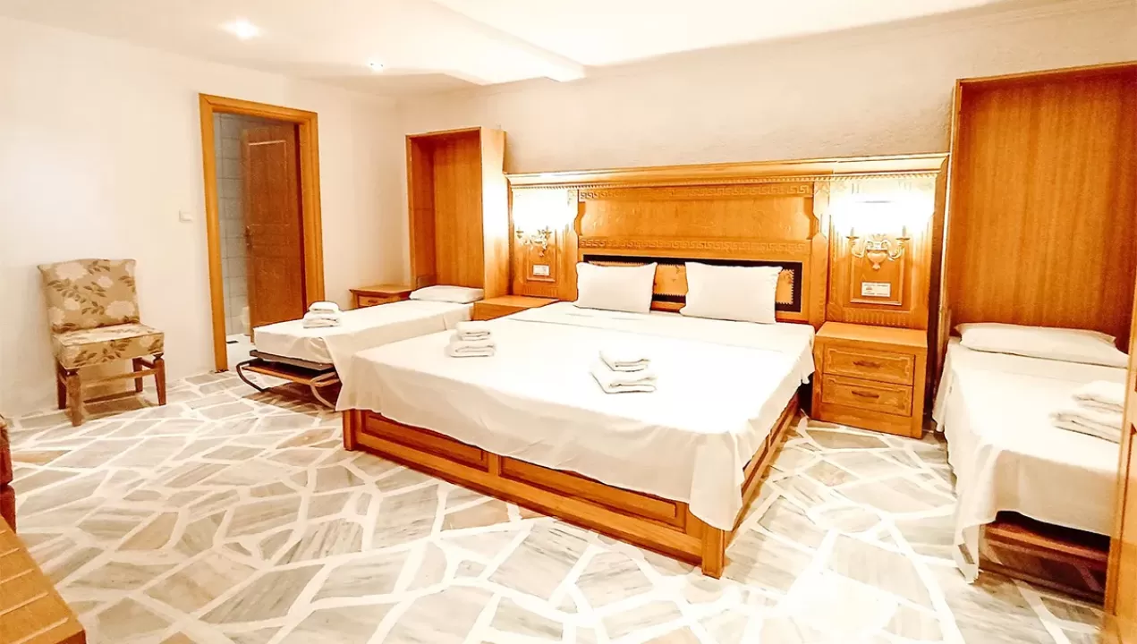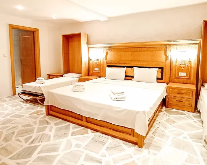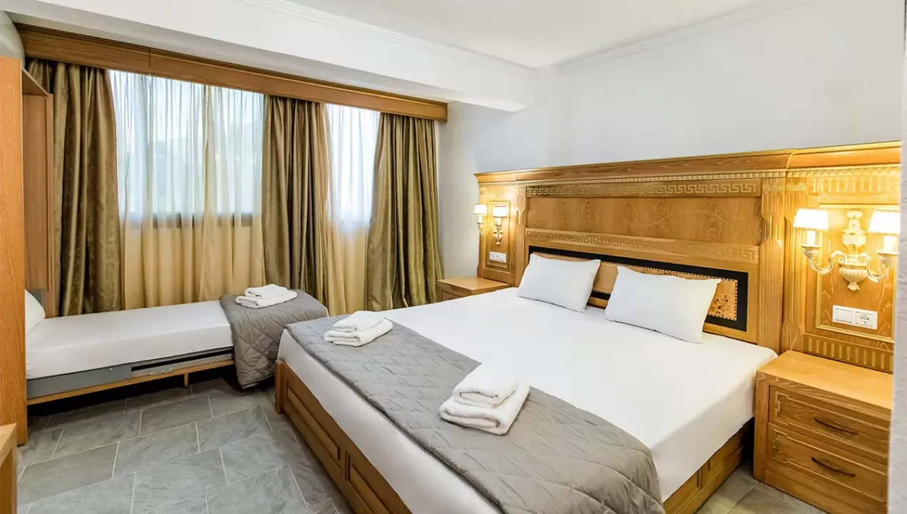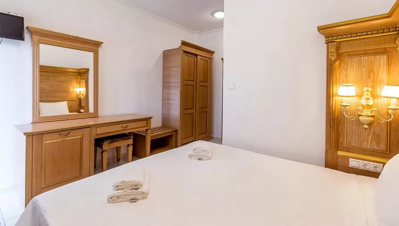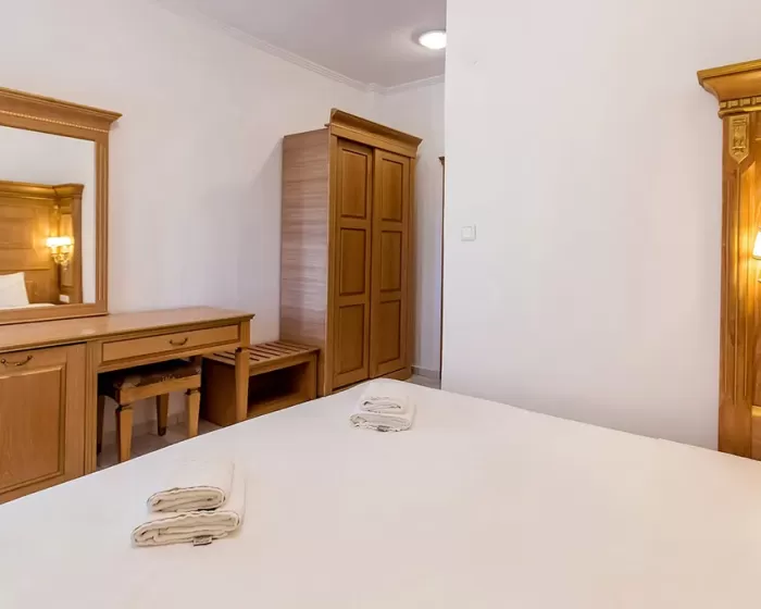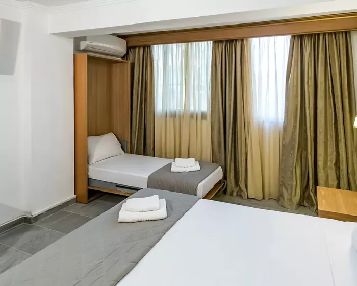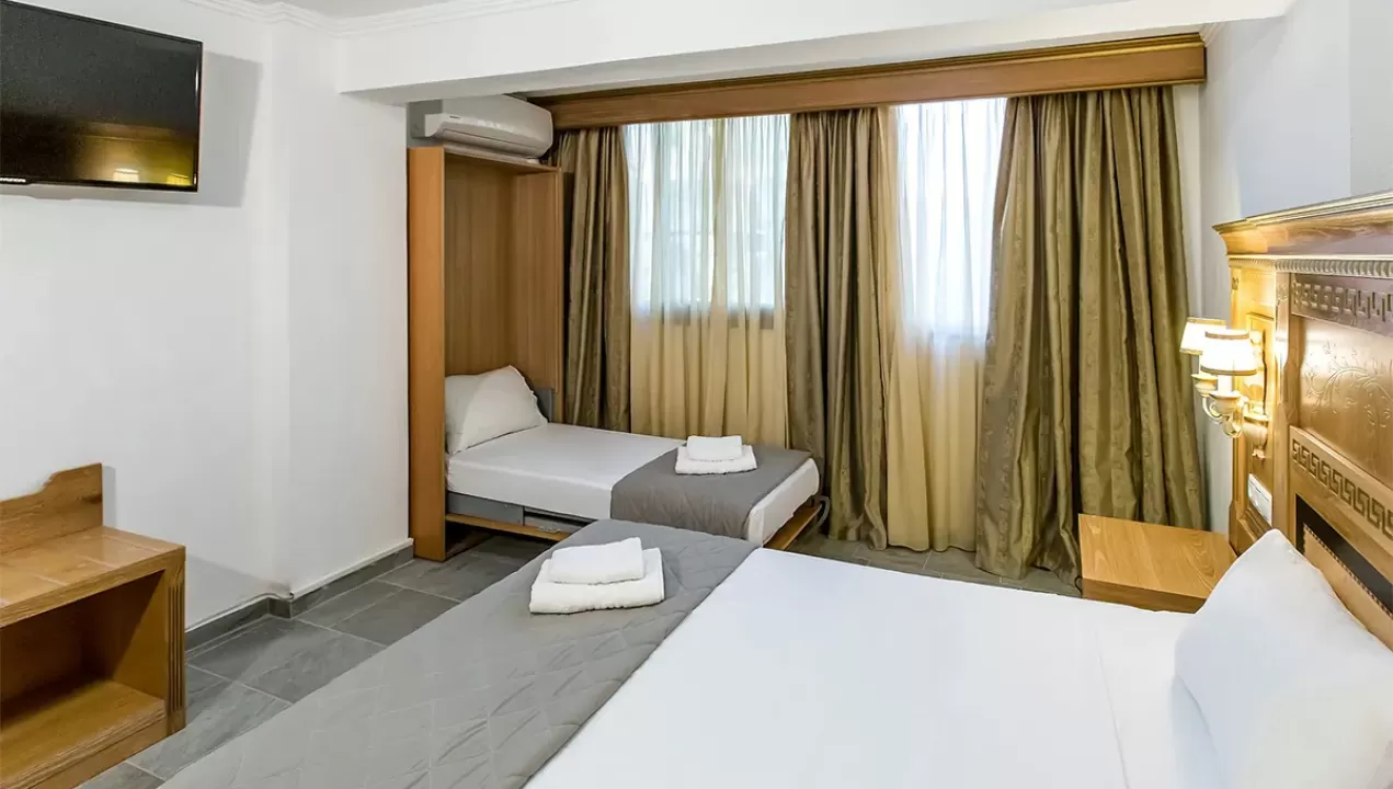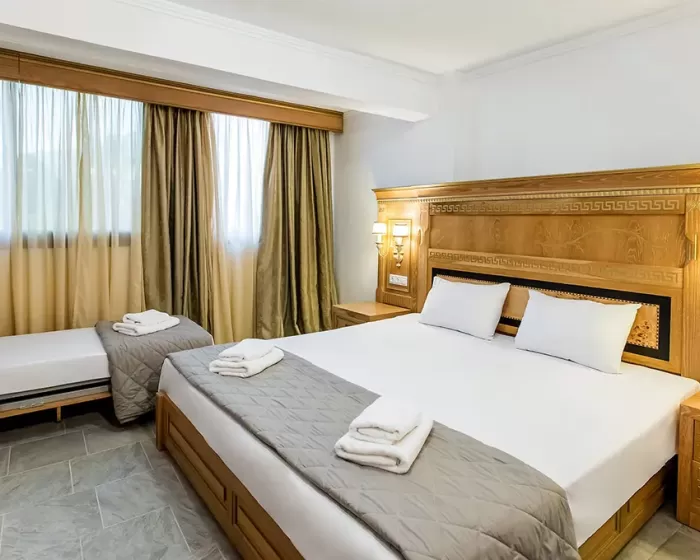 Standardna soba trokrevetna sa bočnim pogledom na more. Ove klimatizovane sobe od 20m² imaju frižider, TV i udobno kupatilo. Trokrevetne sobe mogu da prime do 3 osobe.