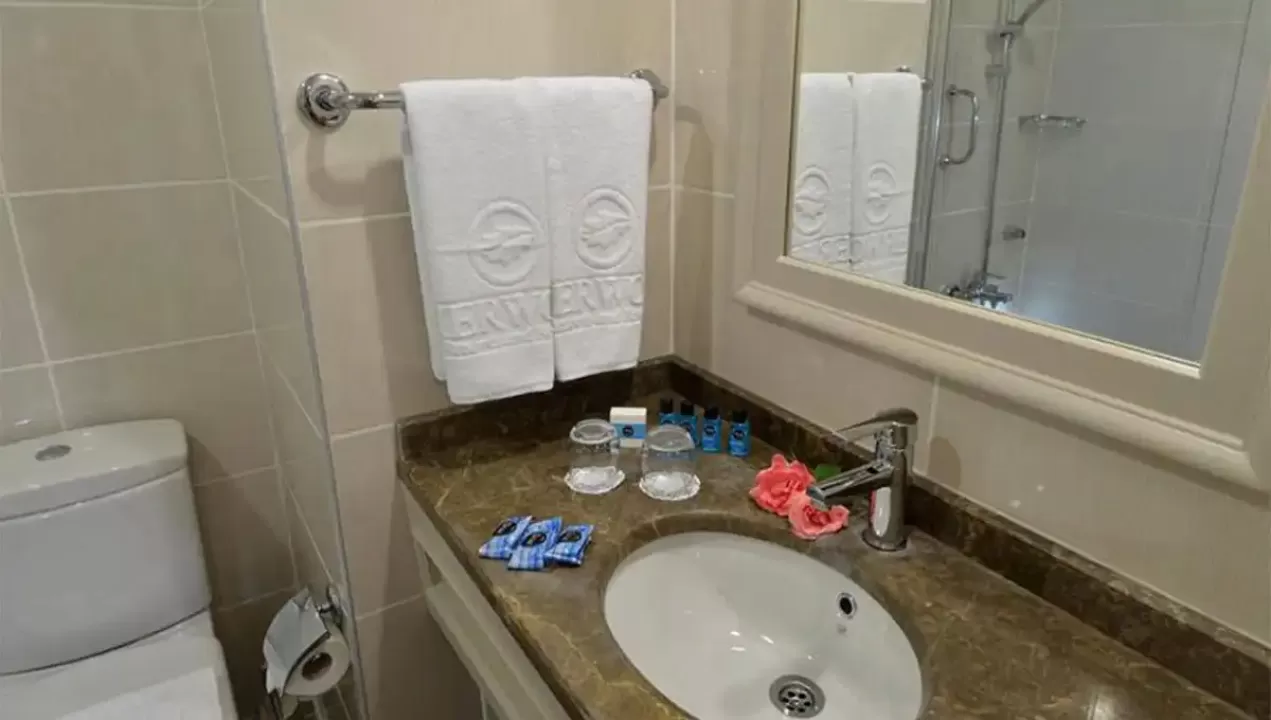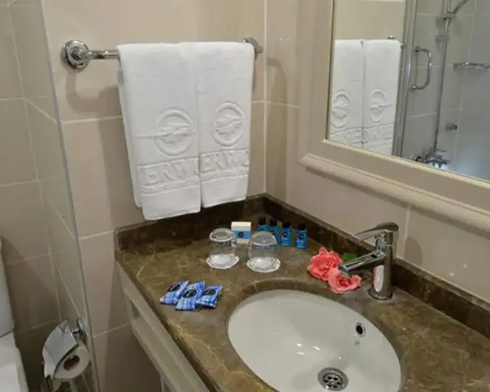 kupatilo sa tušem, fenom i telefonom, centralna klima (radi u zavisnosti od vremenskih uslova), direktan telefon, mini bar (negazirana i gazirana voda i sokovi po dolasku, voda se dopunjuje svakodnevno), sef, keramičke pločice na podu, LCD-SAT-TV, muzički kanali, Wi Fi internet