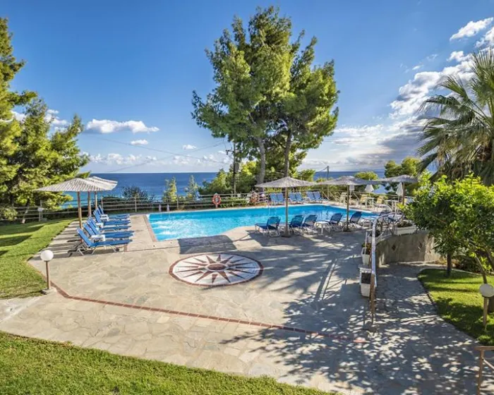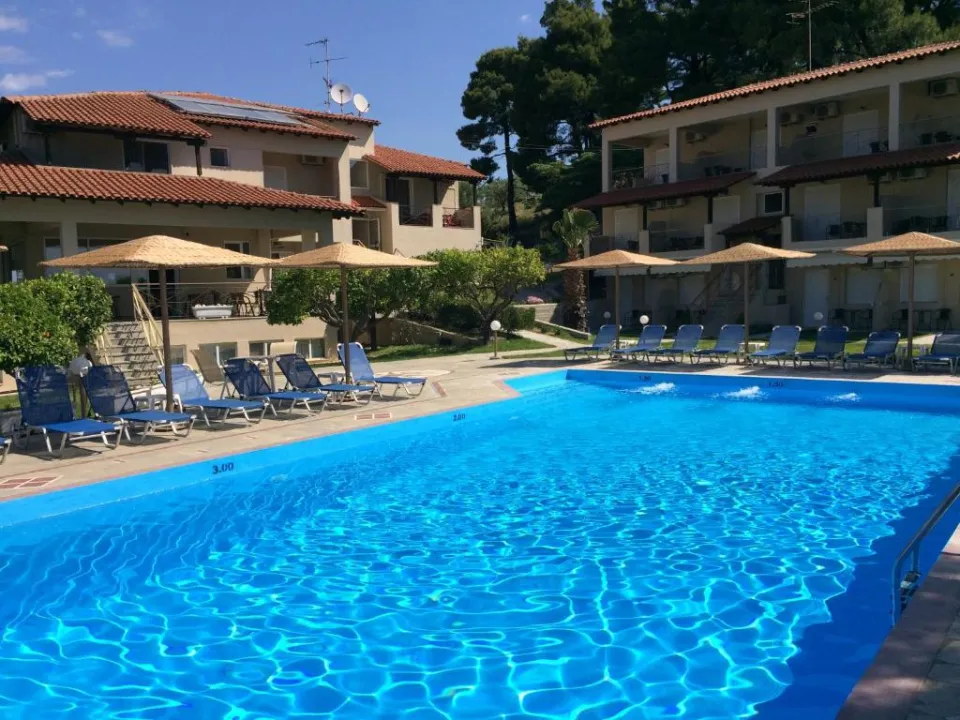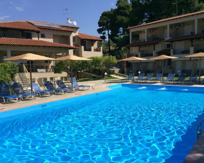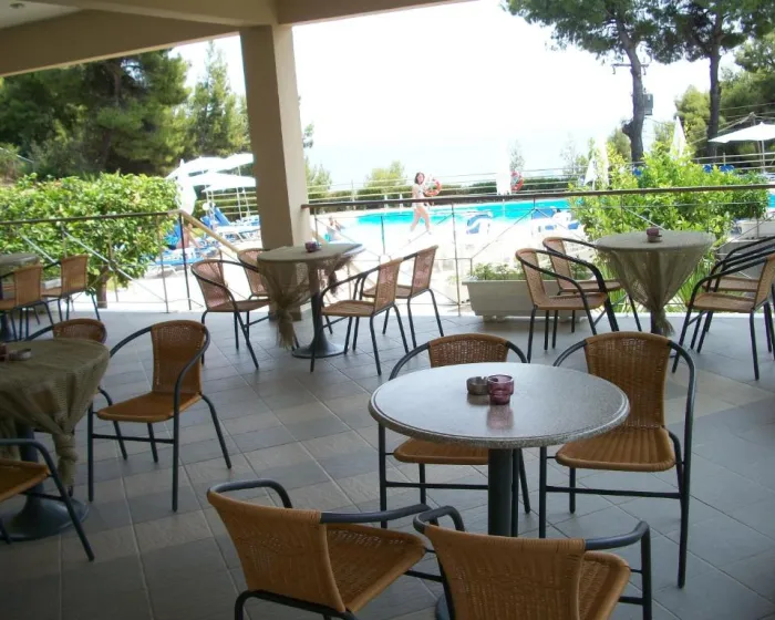 Hotel Thea Possidi se nalazi na oko 400 metara udaljenosti od centra letovališta Possidi, a isto toliko je udaljen i od uredjene plaže mesta. Smešten je na malom uzvišenju iznad pomenute plaže, i u potpunosti okružen gustom borovom šumom, garantujući miran odmor svojim gostima. U svom sastavu ima neveliki broj soba, koje mogu ustostiti do četiri osobe, bar-restoran kao i otvoreni bazen.
