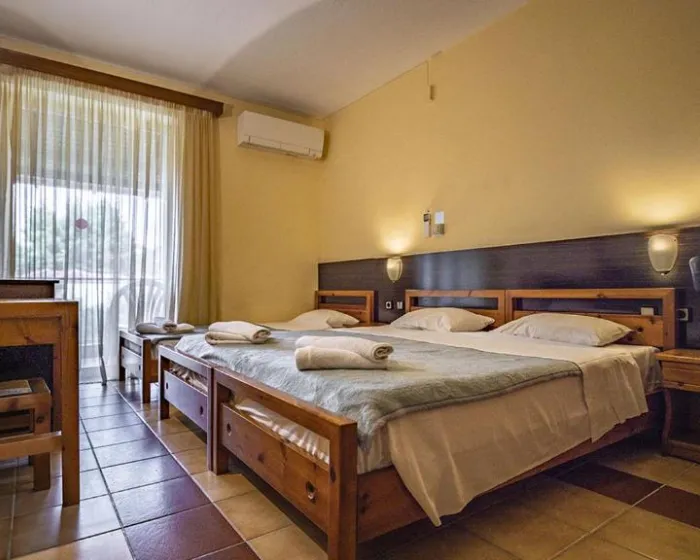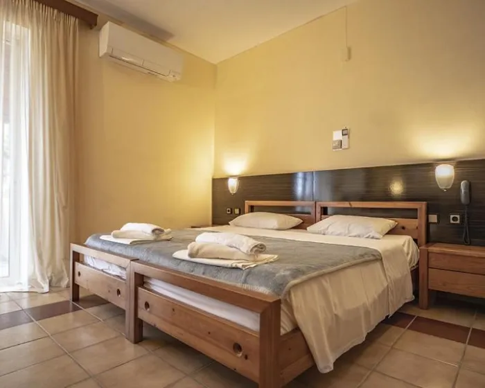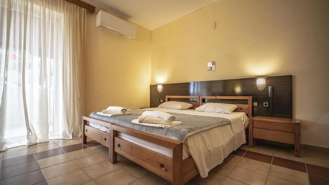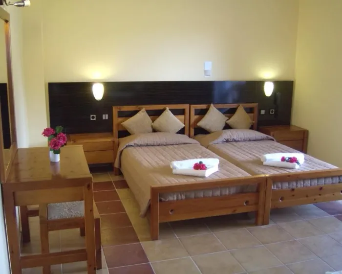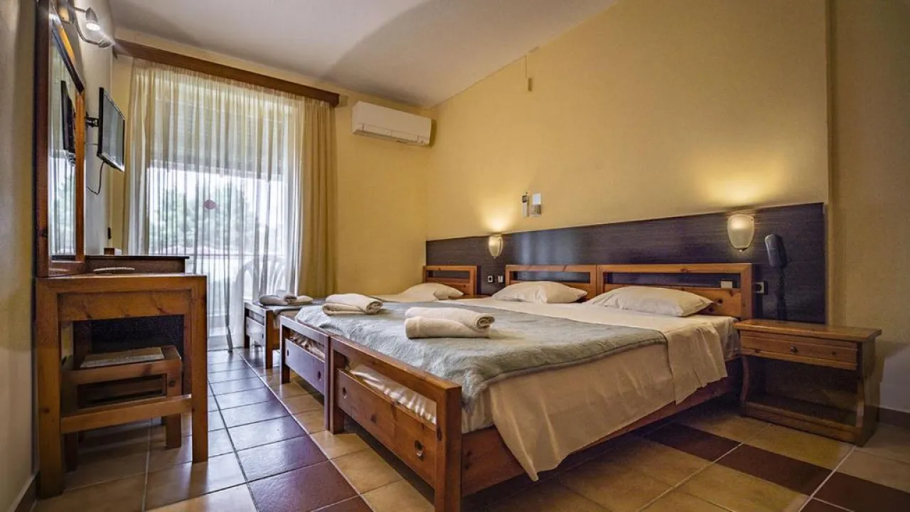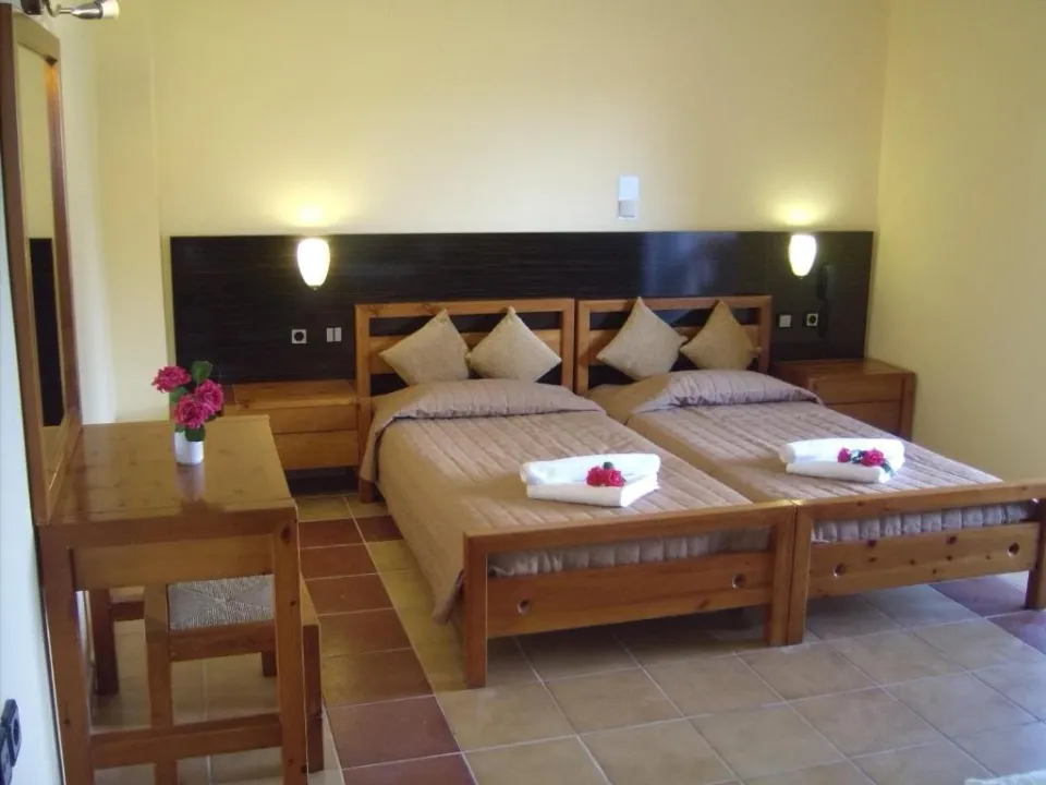 Sve sobe u hotelu Thea imaju balkon ili popločano dvorište sa pogledom na planinu ili na Egejsko more. Opremljene su klima-uredjajem, flat-screen TV-om i frižiderom. Sobe sadrže sopstveno kupatilo sa tuš kabinom i fenom za kosu.