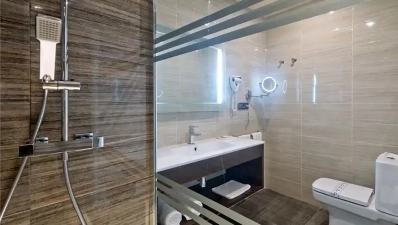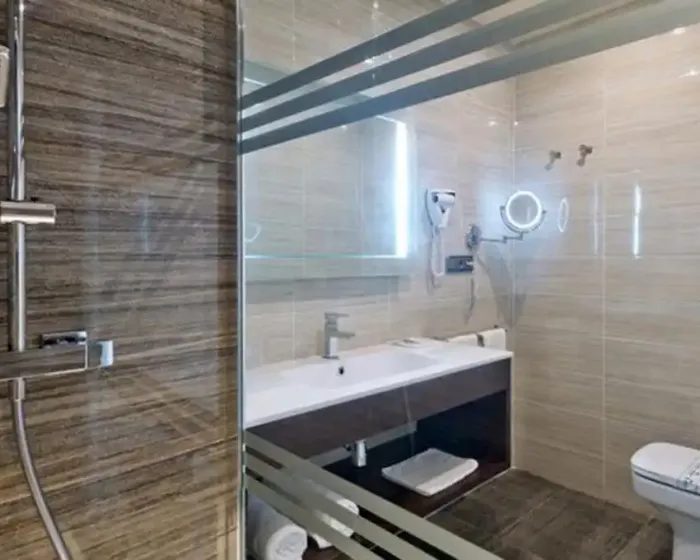 kupatilo, klima-uredjaj, telefon, SAT-TV, fen, sef (uz doplatu), mini-bar (uz doplatu), balkon sa garniturom za sedenje.