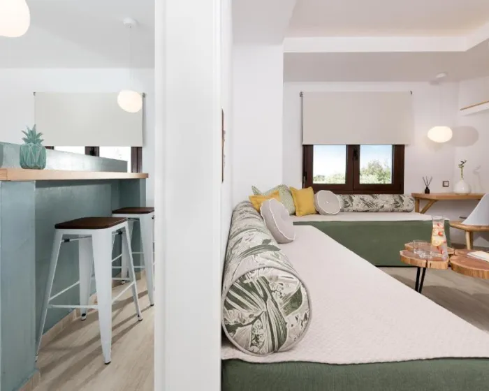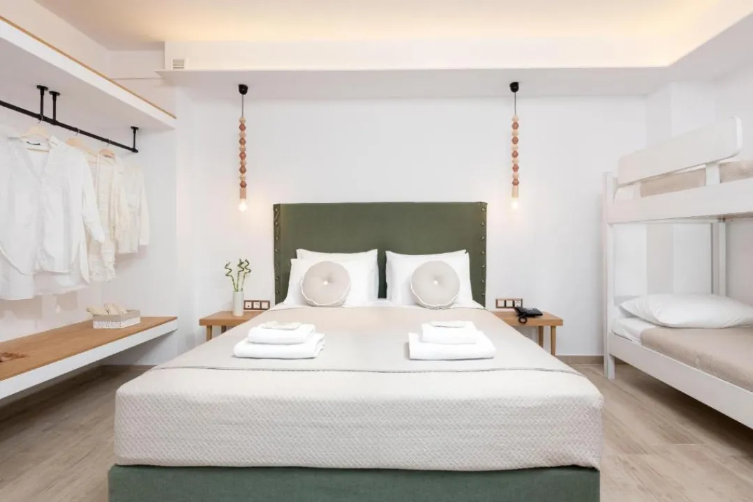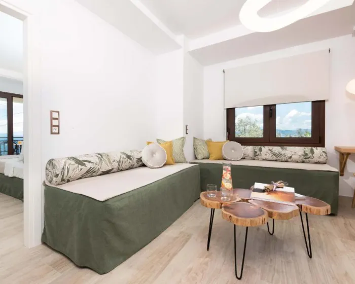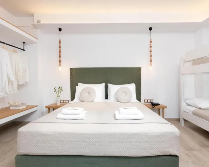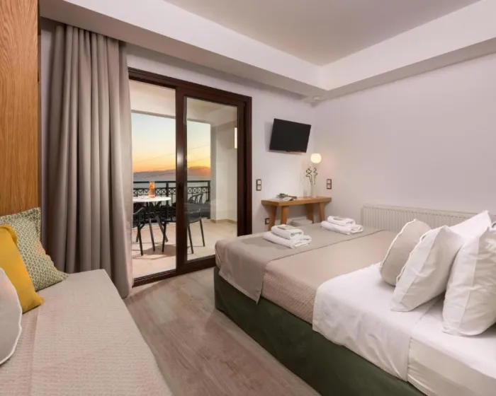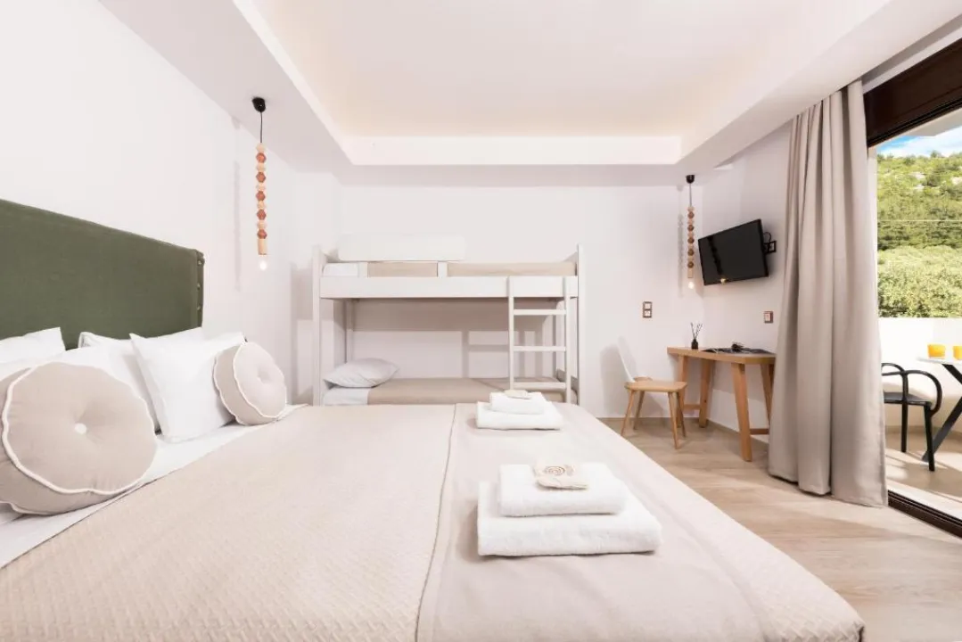 Standardna soba za 4 osobe oko 20 m², elegantno dekorisana, sa pogledom na baštu ili more, namenjena za 2-4 osobe (francuski ležaj ili dva odvojena kreveta i kreveti na sprat ili sofe).