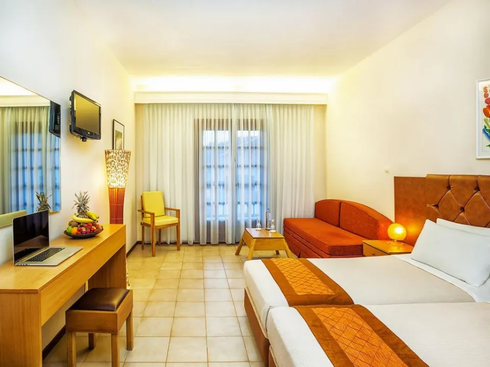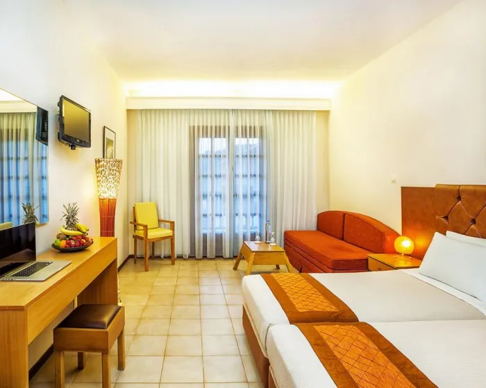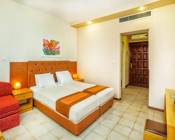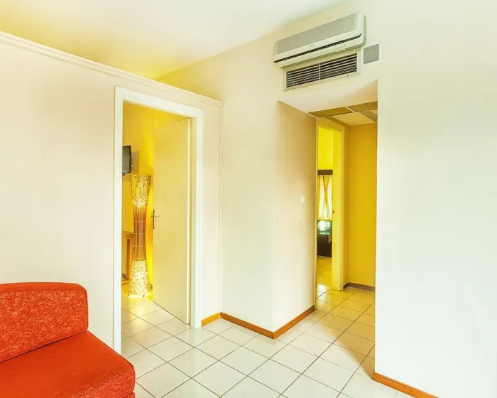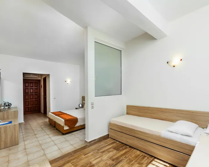 Sobe su opremljene dnevnim boravkom, kuhinjom i kupatilom. Klima uređaj i centralno grejanje osiguravaju prijatnu temperaturu. Neke sobe imaju balkon ili terasu sa pogledom na more. Sobe su opremljene bračnim krevetom ili sofom na razvlačenje, dok su odvojene spavaće sobe dostupne u pojedinim smeštajnim jedinicama. Na zahtev su dostupni dečji kreveti i dodatni ležajevi. Gostima su na raspolaganju sef i mini-bar, kao i frižider i mini frižider. Standardni sadržaji uključuju direktnu telefonsku liniju, televizor sa satelitskim/kablovskim kanalima, radio i WiFi (uz doplatu). Kupatila su opremljena tušem, kadom i hidromasažnom kadom, a sadrže fen za kosu i telefon. Hotel nudi porodične sobe pogodne za boravak sa decom.