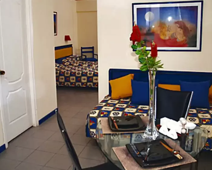 Sobe: kupatilo sa fenom, klima-uredjaj, SAT TV, telefon, frižider, sef (uz doplatu), WiFi (uz doplatu), balkon.doplata za standard sobu SV 8€ dnevno.doplata za wifi u sobi 15€ nedeljno.doplata za korišćenje sefa 18€ nedeljno.