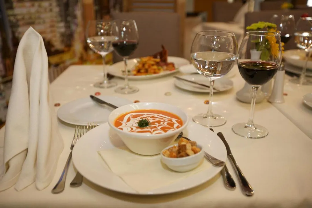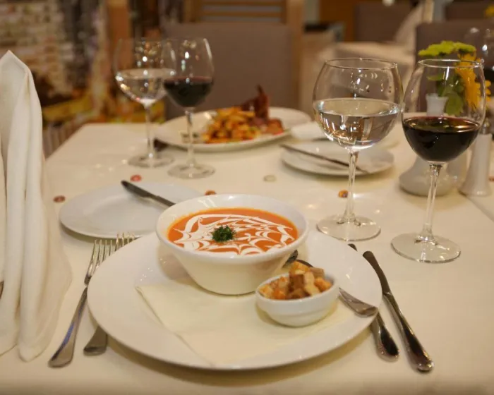 Prostor za ručavanje uključuje restoran za nepušače i lobby bar. Takođe su dostupni posebni obroci, uključujući vegetarijanska jela.