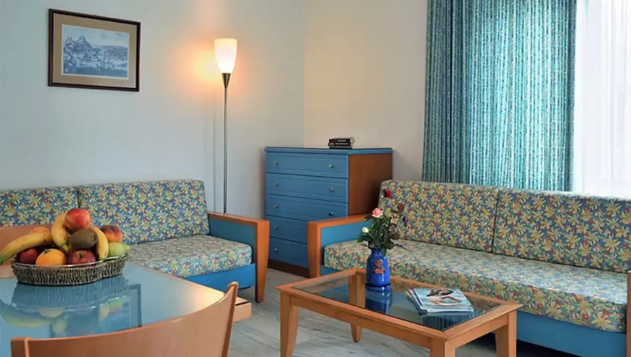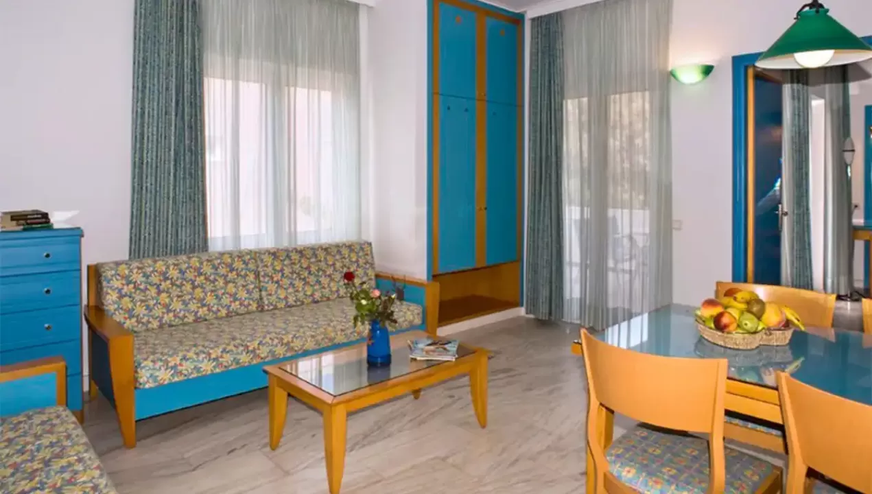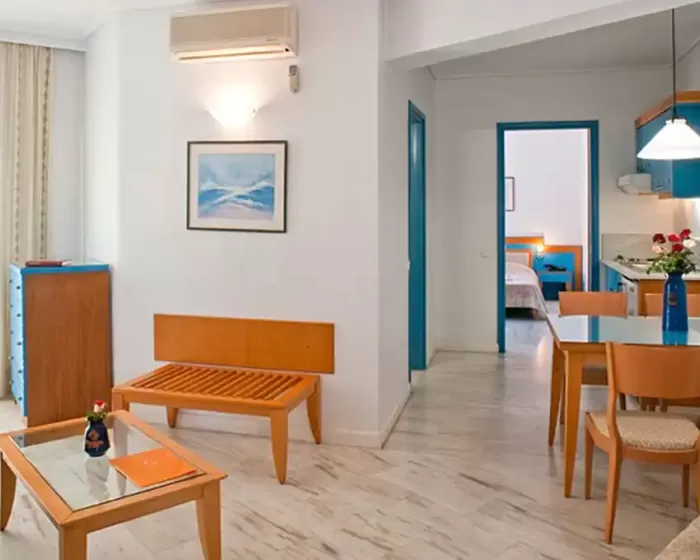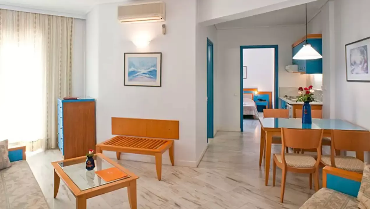 Ukupno 41 soba:  Junior Suites (~40 m²), Maisonettes 1-Bedroom (~55 m²), Suites 1-Bedroom (~45 m²), Suites 2-Bedroom (~68 m²), Mega Suites (~120 m²).U sobama: - kuhinja, klima-uredjaj, SAT TV, telefon, kada/tuš, fen, kozmetičko ogledalo, frižider, sef (uz doplatu na licu mesta), Wi-Fi internet (uz doplatu na licu mesta), balkon/terasa.Junior Suite - jedna soba, 2 odvojena kreveta, kupatilo od mermera.Maisonette - duplex, dnevni boravak i spavaća soba.Suite 1-Bedroom - dnevni boravak i odvojena spavaća soba. Smešten na prvom ili drugom spratu.Suite 2-Bedrooms - dnevni boravak i 2 odvojene spavaće sobe, 2 kupatila.Mega Suite - dnevni boravak i 4 odvojene spavaće sobe, 2 kupatila, jedno sa jacuzzi kadom a drugo sa tušem, mašina za veš, opremljena kuhinja, klima u svakoj sobi.