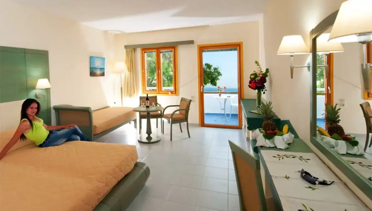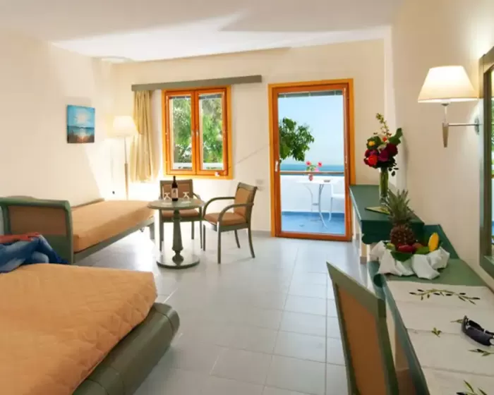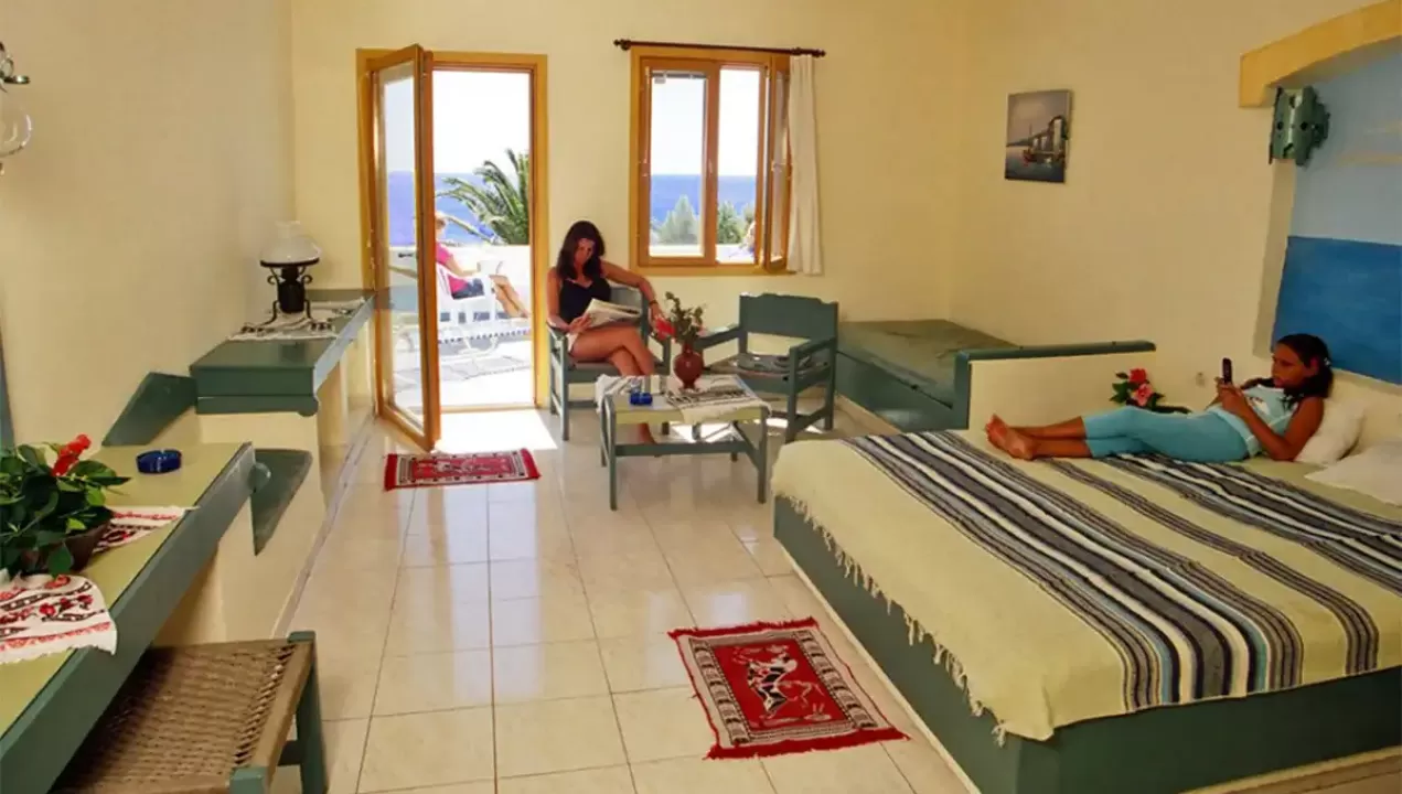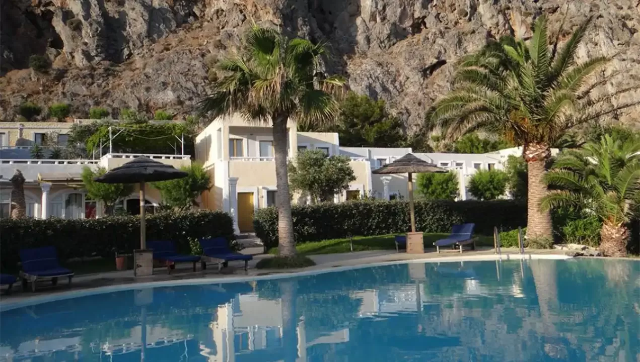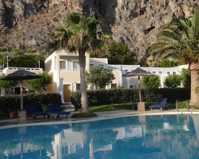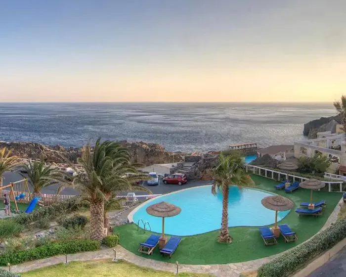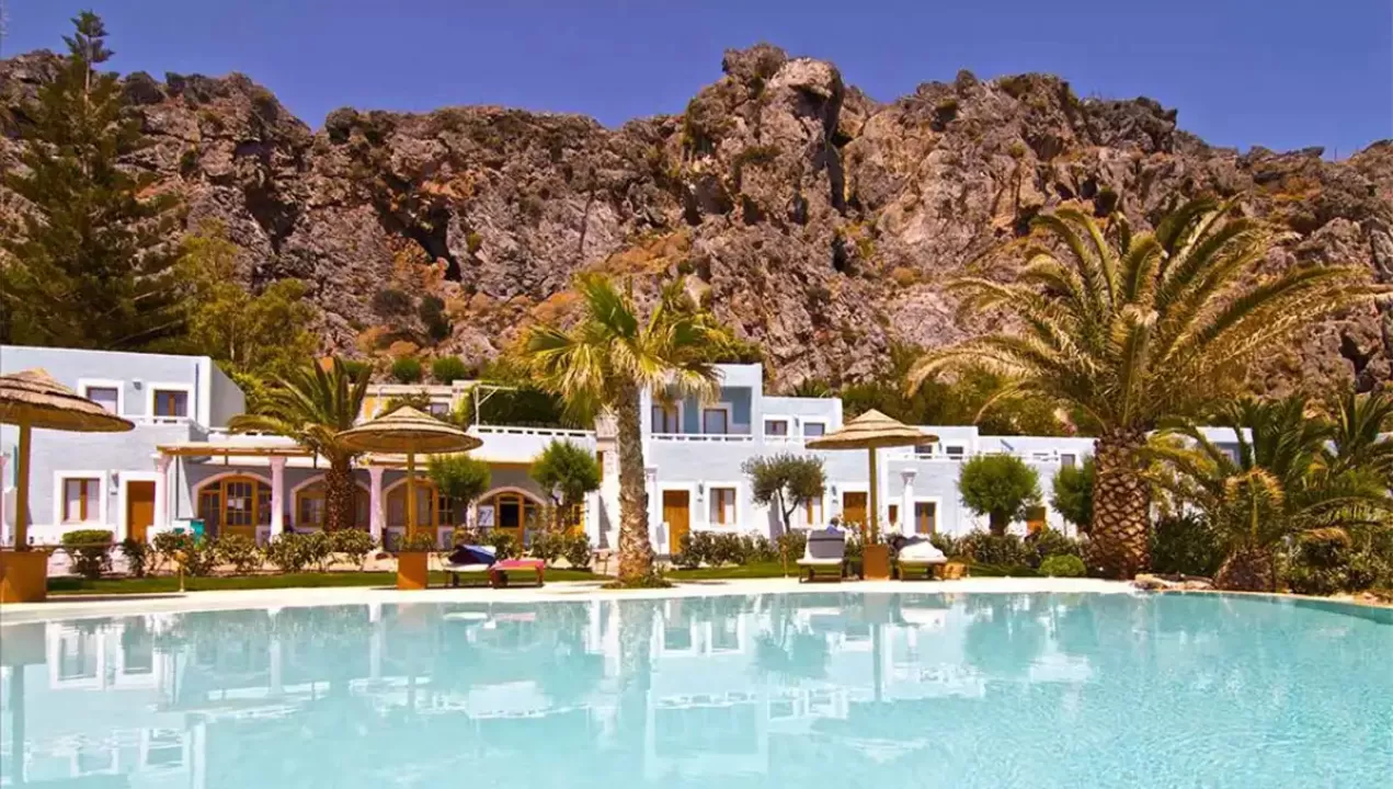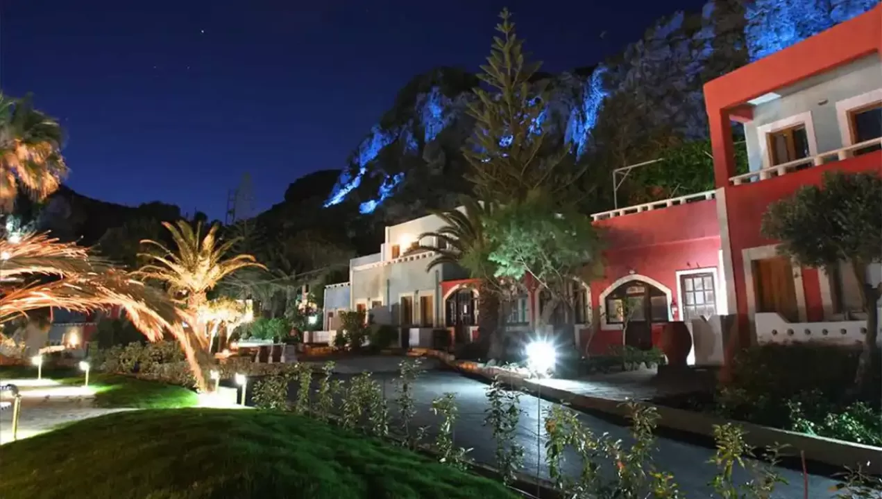 Kalypso Cretan Village Plakias Krit je izolovani kompleks na jugu ostrva, smešten na plaži Karavos, na oko 3 kilometra udaljenosti od gradića Plakias i na oko 97 kilometara od aerodroma u Hanji. Na manje od 2 kilometra udaljenosti nalazi se popularna peščana plaža Damnoni. Hotel se nalazi u živopisnom ambijentu, u bujnom rastinju sa dosta zelenila, okružen planinom i stenama, i sa direktnim izlazom na more. Mini bus vozi od hotela do gradića Plakias i do plaže Damnoni (četiri puta dnevno, uz doplatu). Preporuka za miran i relaksirajući odmor.