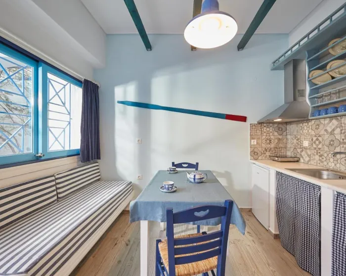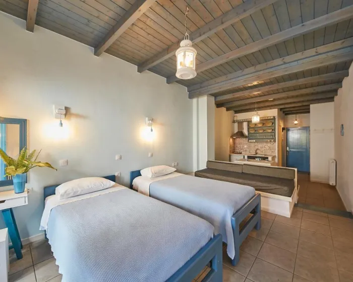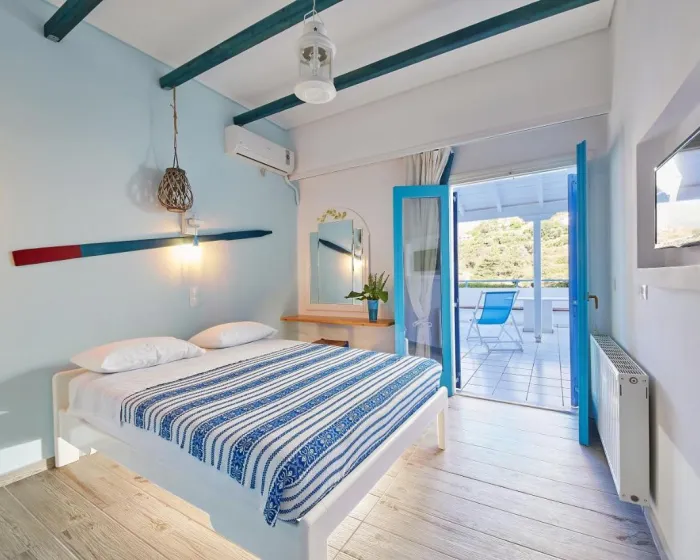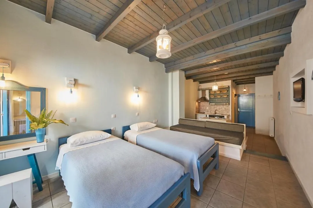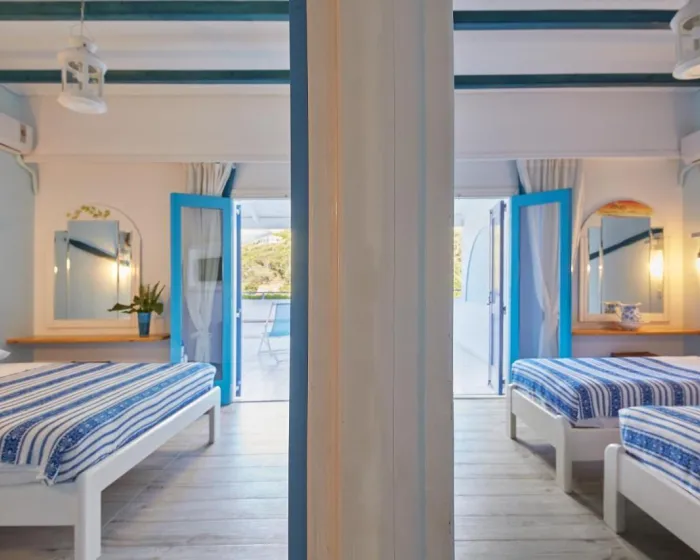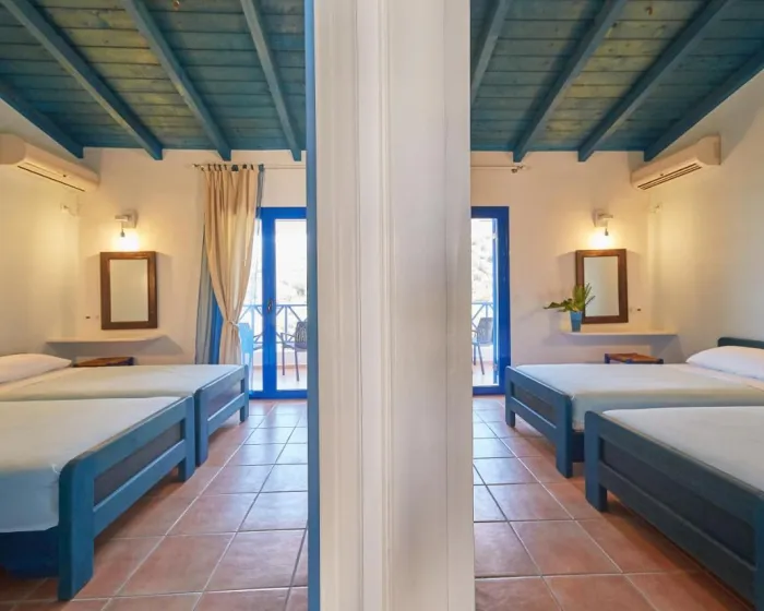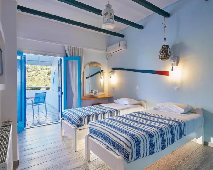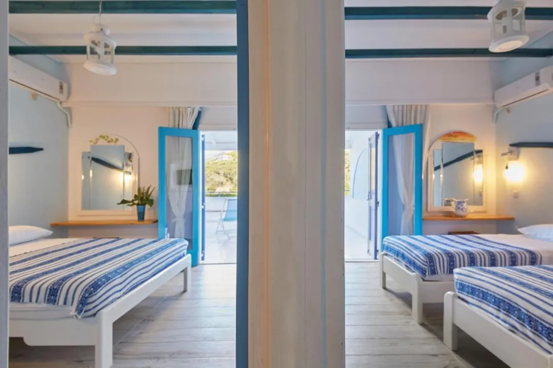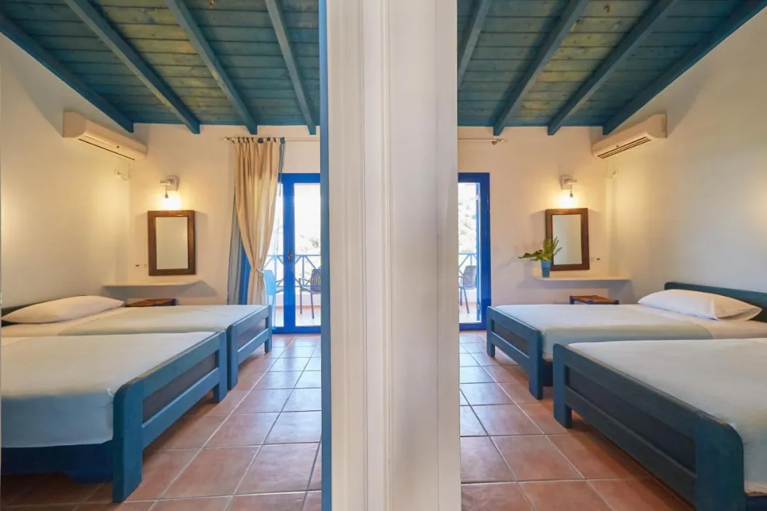 Sobe su opremljene klima uređajem. Neke imaju balkon ili terasu sa pogledom na more. U sobama se nalaze francuski krevet i sofa na razvlačenje. Na zahtev su dostupni dečiji i dodatni kreveti. Standardna oprema uključuje frižider, telefon, televizor i besplatan WiFi. Kupatila su opremljena tušem i kadom, kao i fenom za kosu. Hotel nudi sobe prilagođene osobama sa invaliditetom, porodične sobe i sobe za nepušače.