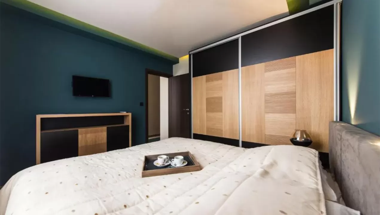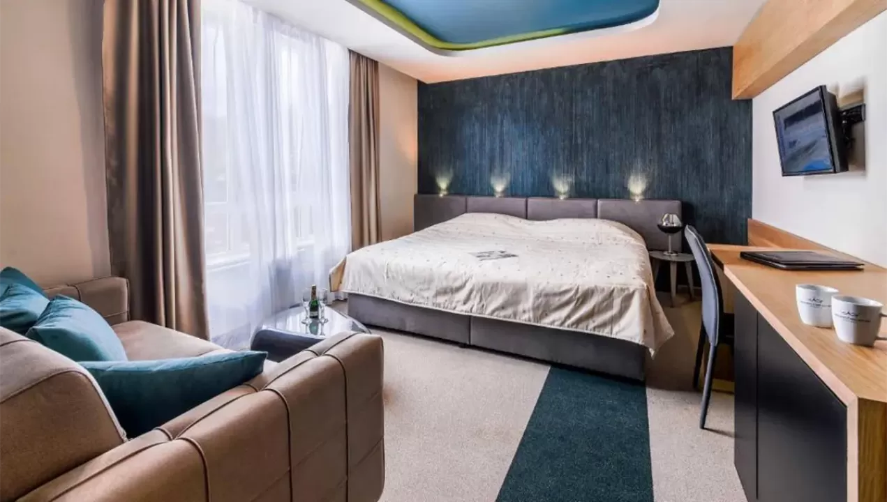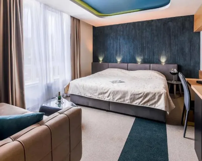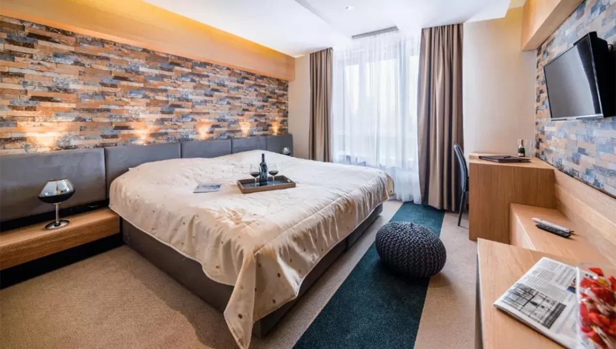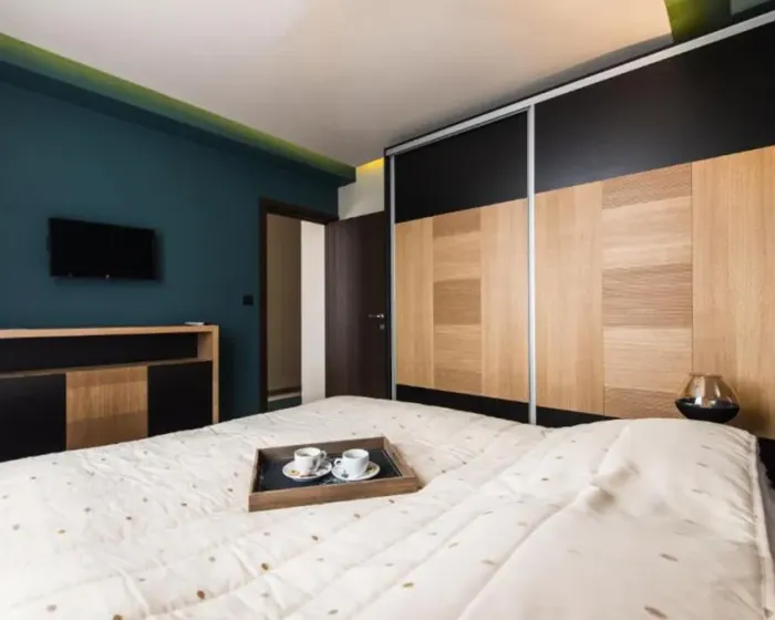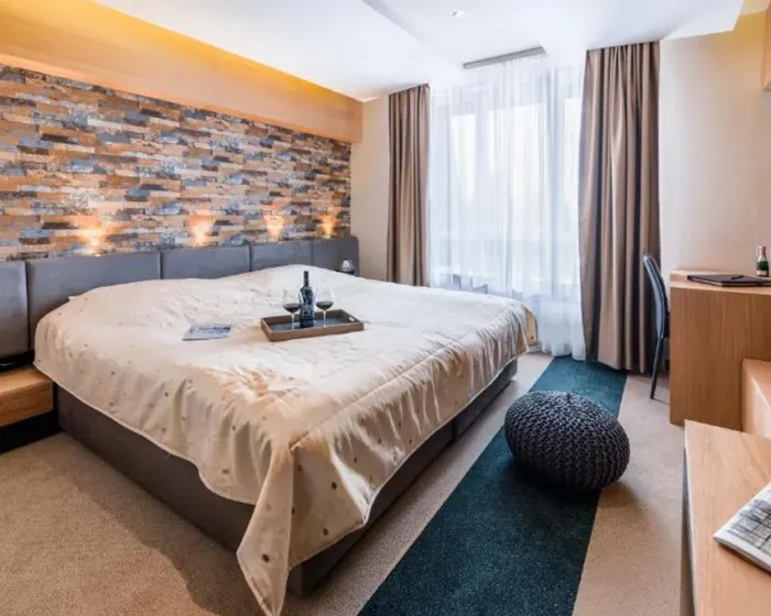 Opis soba u hotelskom delu:Soba: kupatilo (tuš, fen), bademantil, francuski ležaj, LCD TV, telefon, mini-bar, električni bokal, sef, wireless internet; pojedine sobe imaju i ugaonu garnituru za sedenje koja se razvlačiApartman za 4 osobe: kupatilo (tuš, fen), dnevna soba sa ugaonom garniturom za sedenje koja se razvlači , spavaća soba sa francuskim ležajem, bademantil, 2 LCD TV, telefon, mini-bar, električni bokal, sef, wireless internetApartman za 5 osoba: kupatilo (tuš, fen), dnevna soba sa ugaonom garniturom za sedenje koja se razvlači, spavaća soba sa francuskim ležajem i odvojenim ležajem, bademantil, 2 LCD TV, telefon, mini-bar, električni bokal, sef, wireless internetOpis apartmana u apartmanskom delu:Studio (2 osobe) - jedna prostorija sa garniturom na razvlačenje za dve osobe, kupatilo (tuš, fen), kompletno opremljena kuhinja sa električnim šporetom, frižiderom, posuđem, priborom za jelo,sto za ručavanje, LCD TV , wireless internet.Studio (3 osobe) - jedna prostorija sa garniturom na razvlačenje za dve osobe, jedan singl na razvlačenje, kupatilo (tuš, fen) , kompletno opremljena kuhinja sa električnim šporetom, frižiderom, posuđem, priborom za jelo,sto za ručavanje, LCD TV, wireless internet.Apartman (4 osobe) - dnevna soba sa garniturom na razvlačenje za dve osobe, spavaća soba sa francuskimležajem (200×160) ili dva singl ležaja, kupatilo (tuš, fen), kompletno opremljena kuhinja sa električnimšporetom, frižiderom,posuđem, priborom za jelo, sto za ručavanje, LCD TV, wireless internet.Apartman (6 osoba) - dnevna soba sa garniturom za sedenje koja se razvlači za dve osobe (neki apartmani imaju i kamin u dnevnoj sobi), dve spavaće sobe, jedna sa francuskimležajem, a druga sa dva singl ležaja, kupatilo (tuš, fen), kompletno opremljena kuhinja sa električnim šporetom, frižiderom, posuđem, priborom za jelo, sto za ručavanje, LCD TV, wireless internet.LUX varijanta apartmana podrazumeva toplu vezu sa bazenom i SPA centrom.
