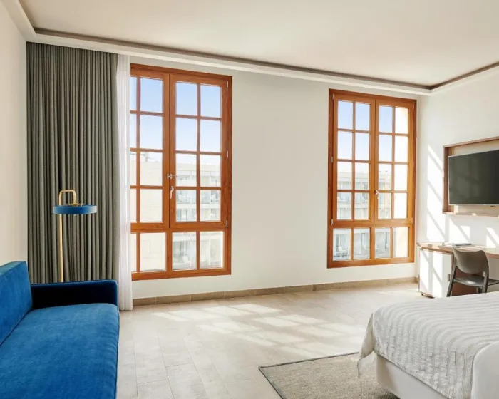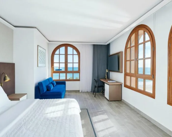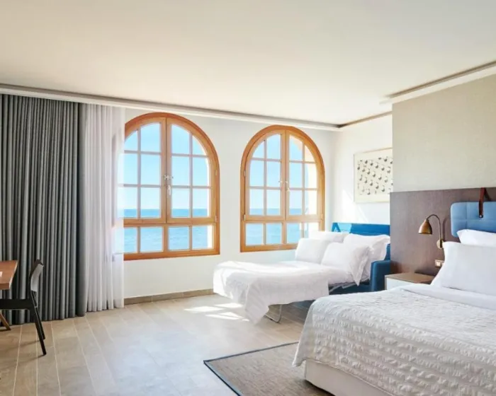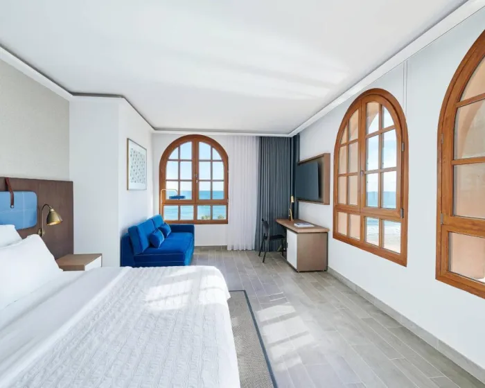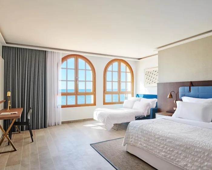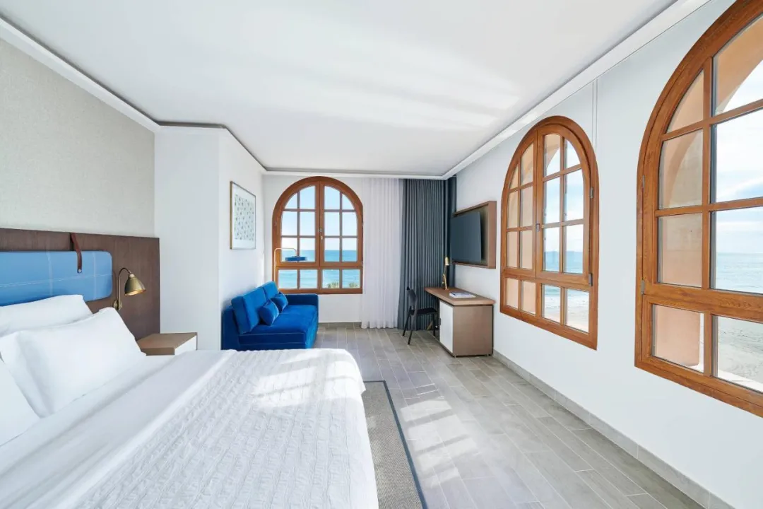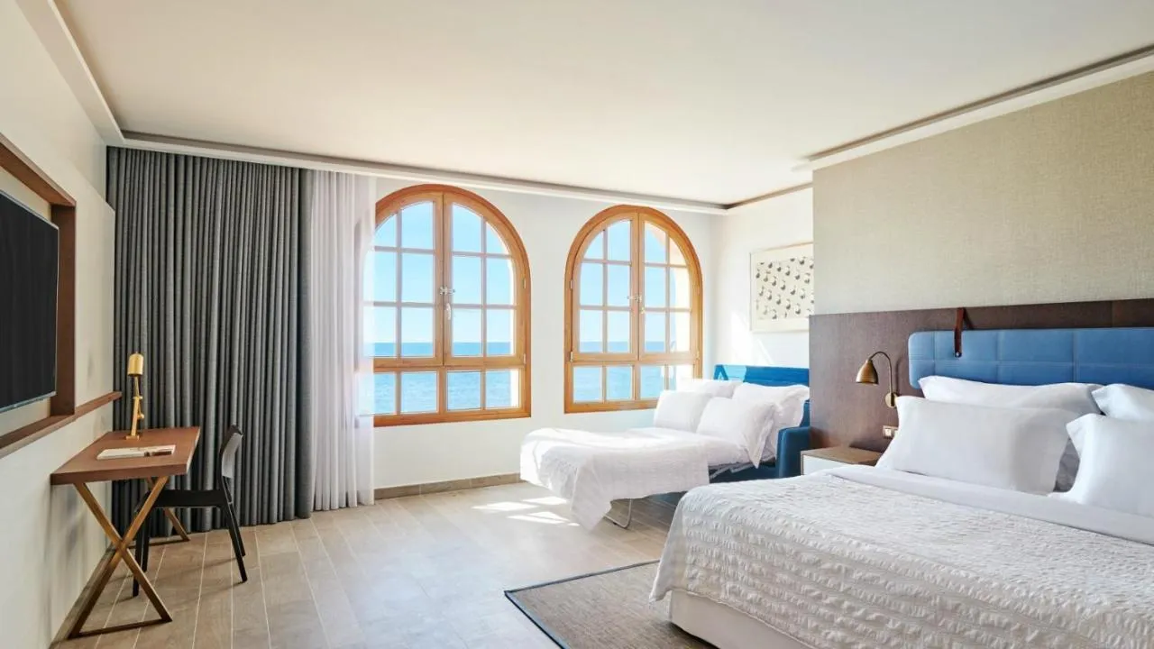 Sobe su opremljene klima uređajem i centralnim grejanjem. U većini soba gosti mogu uživati u pogledu na more sa balkona ili terase. Sobe imaju bračni krevet ili krevet king size. Dodatni kreveti mogu biti zatraženi. Sef, mini bar i radni sto su takođe dostupni. Daska za peglanje je obezbeđena za praktičnost gostiju. Direktna telefonska linija, televizor sa satelitskim/kablovskim kanalima, radio, stereo uređaj i WiFi (bez dodatne naknade) su takođe obezbeđeni. Gosti mogu koristiti uslugu noćnog obrtanja kreveta. Papuče su uključene. Kupatila su opremljena tušem, kadom i bideom. Fen, bade mantili i telefon su dostupni za svakodnevnu upotrebu. Sobe prilagođene osobama u kolicima sa pristupačnim kupatilima takođe su dostupne. Hotel ima porodične sobe i sobe za nepušače.