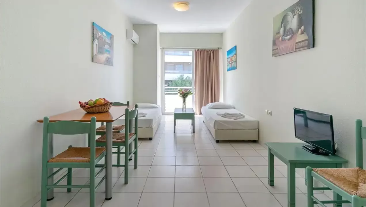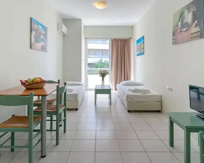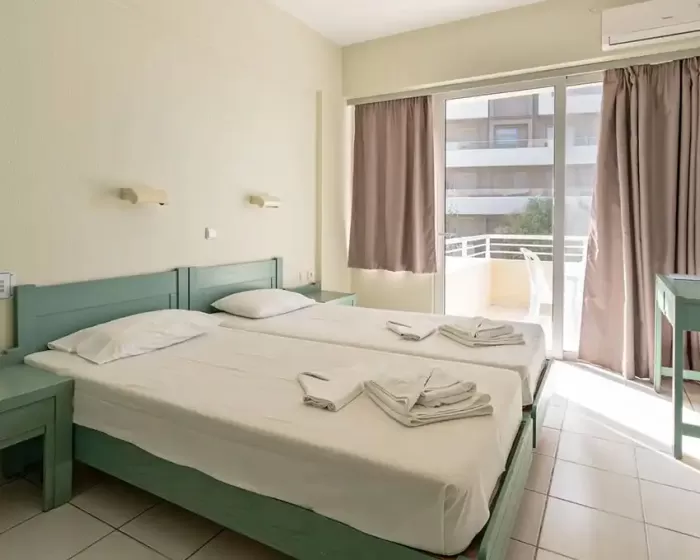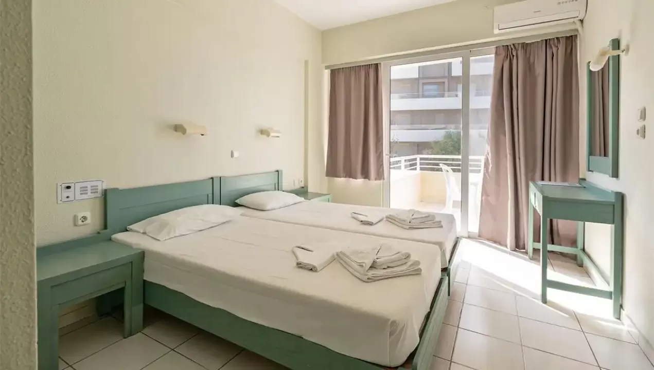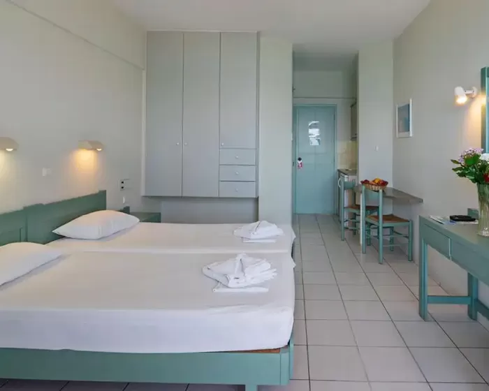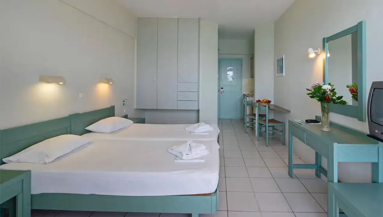 Ukupno 18 soba:Studio Promo (~ 22-25 m²), Studio SV ili SSV (~ 22-25 m²), Family Room SSV (~ 32 m²).U sobama: klima uredjaj, Wi-Fi , čajna kuhinja (posudje), kuvalo za vodu, frižider, trpezarijski sto, TV, sef (uz doplatu), kupatilo (kada / tuš), sušilo za kosu, balkon.Studio Side Sea View (~ 22-25 m²) Otvoreni plan, dva odvojena i jedan sklopivi krevet.Studio Sea View (~ 22-25 m²) Otvoreni plan, dva odvojena i jedan sklopivi krevet.Studio Promo (~ 22-25 m²) Otvoreni plan, dva odvojena kreveta.Family Room Side Sea View (~ 32 m²) Odvojena spavaća soba i dnevni boravak sa čajnom kuhinjom. Dva kreveta za jednu osobu i dva kreveta.Vrsta dodatnog kreveta - sklopivi.