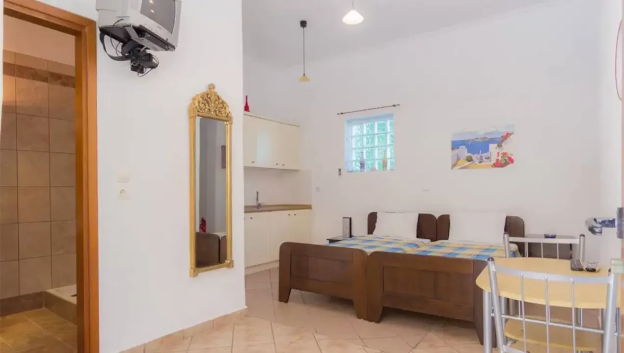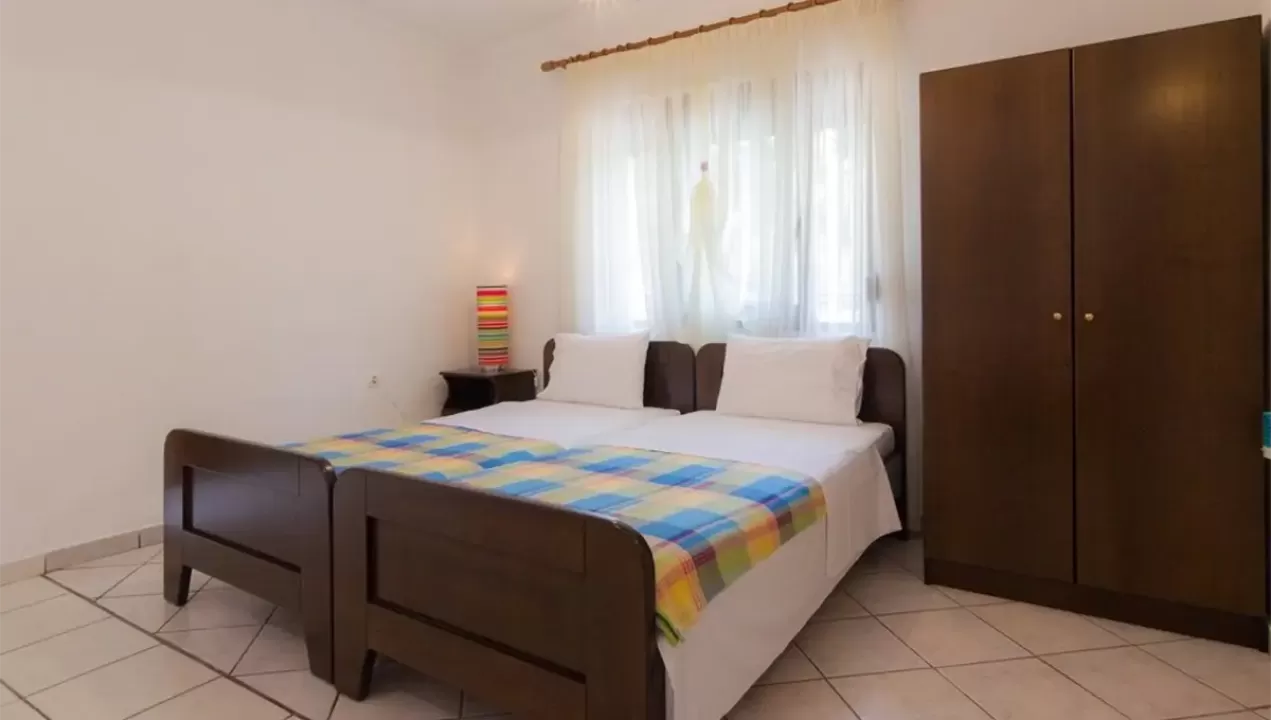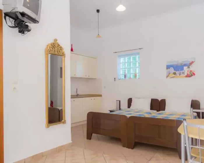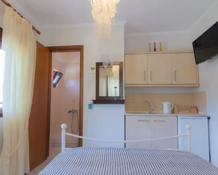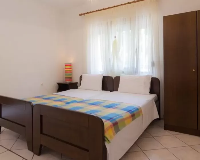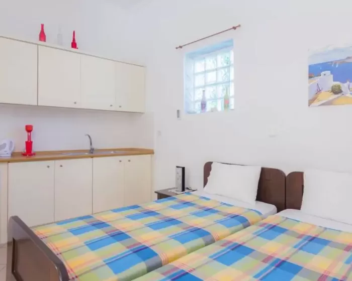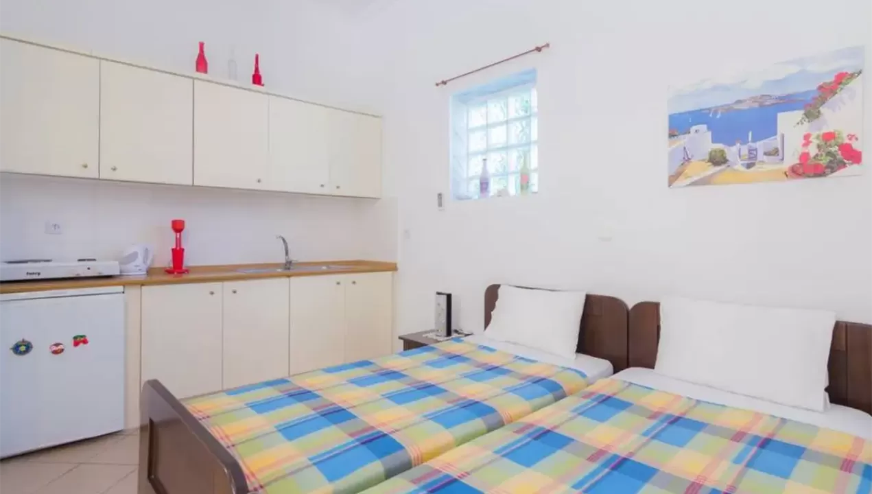 Tip smeštaja:1/2 studio - u jednoj prostoriji čajna kuhinja i jedan bračni ležaj.1/4 duplex apartman - u jednoj prostoriji jedan bračni, u drugoj prostoriji drugi bračni ležaj, odvojena kuhinja i kupatilo.U pojedinim slučajevima moguća su odstupanja mera ležaja od našeg standarda. Grčki standard za ležaj je 185 cm sa 75-80 cm, a bračni ležaj (dve osobe) 185-200 cm sa 120-155 cm.