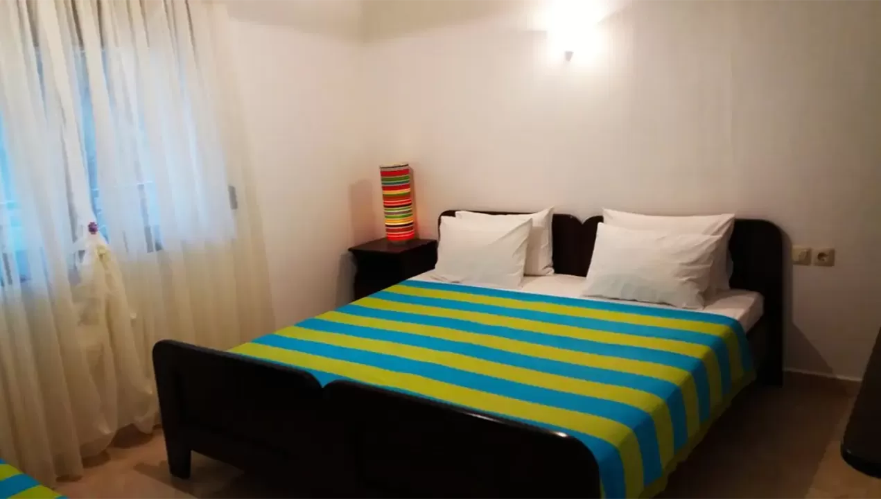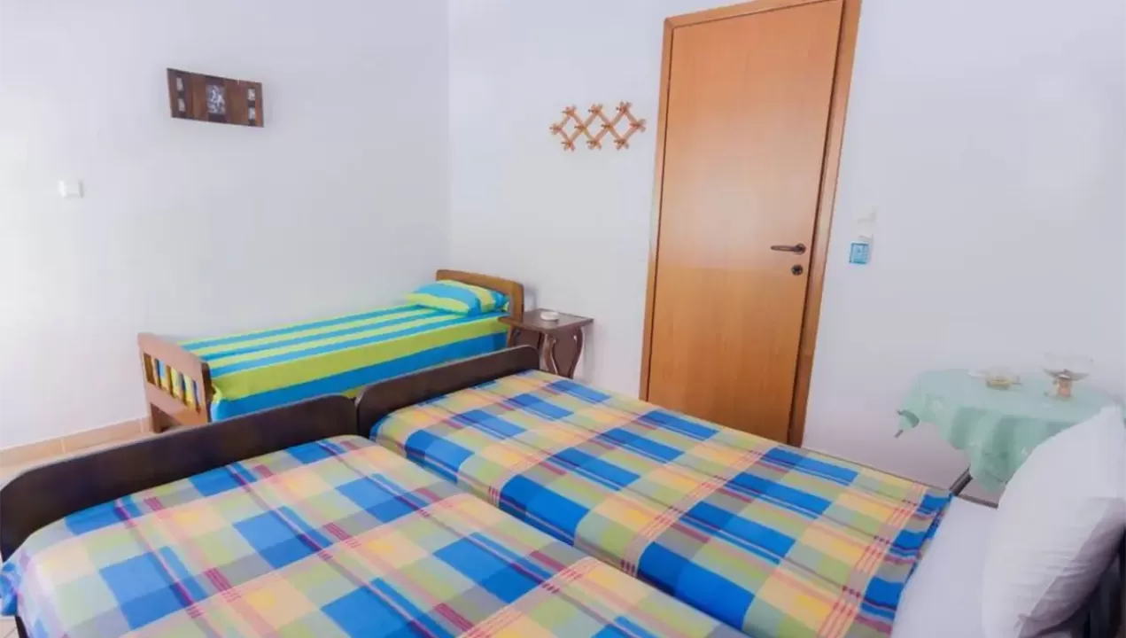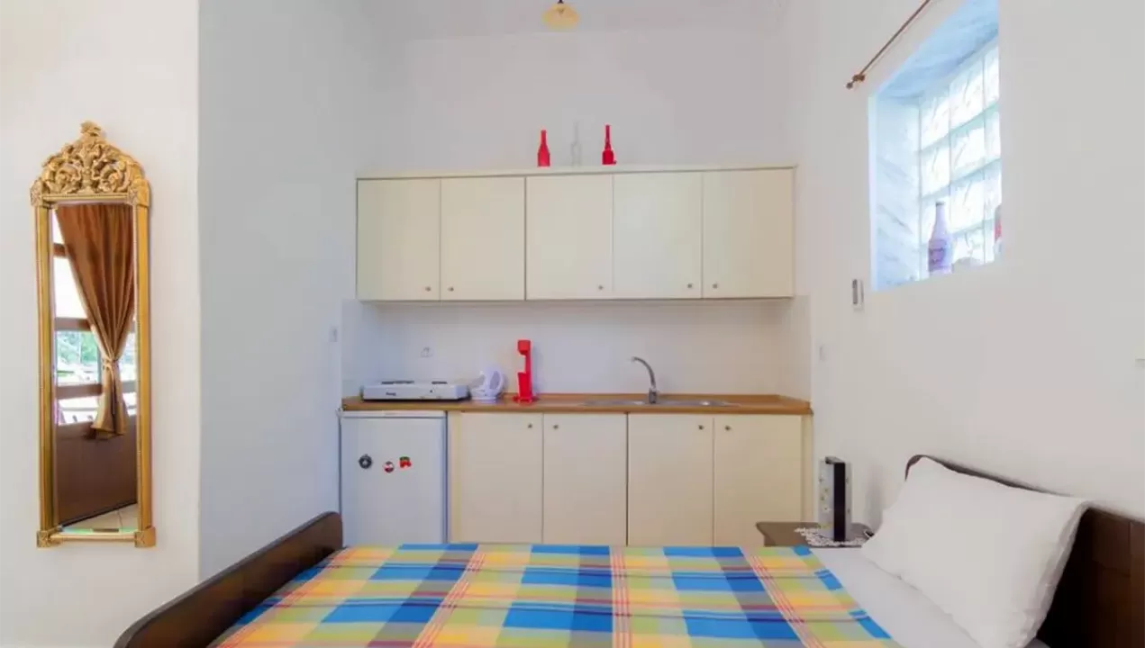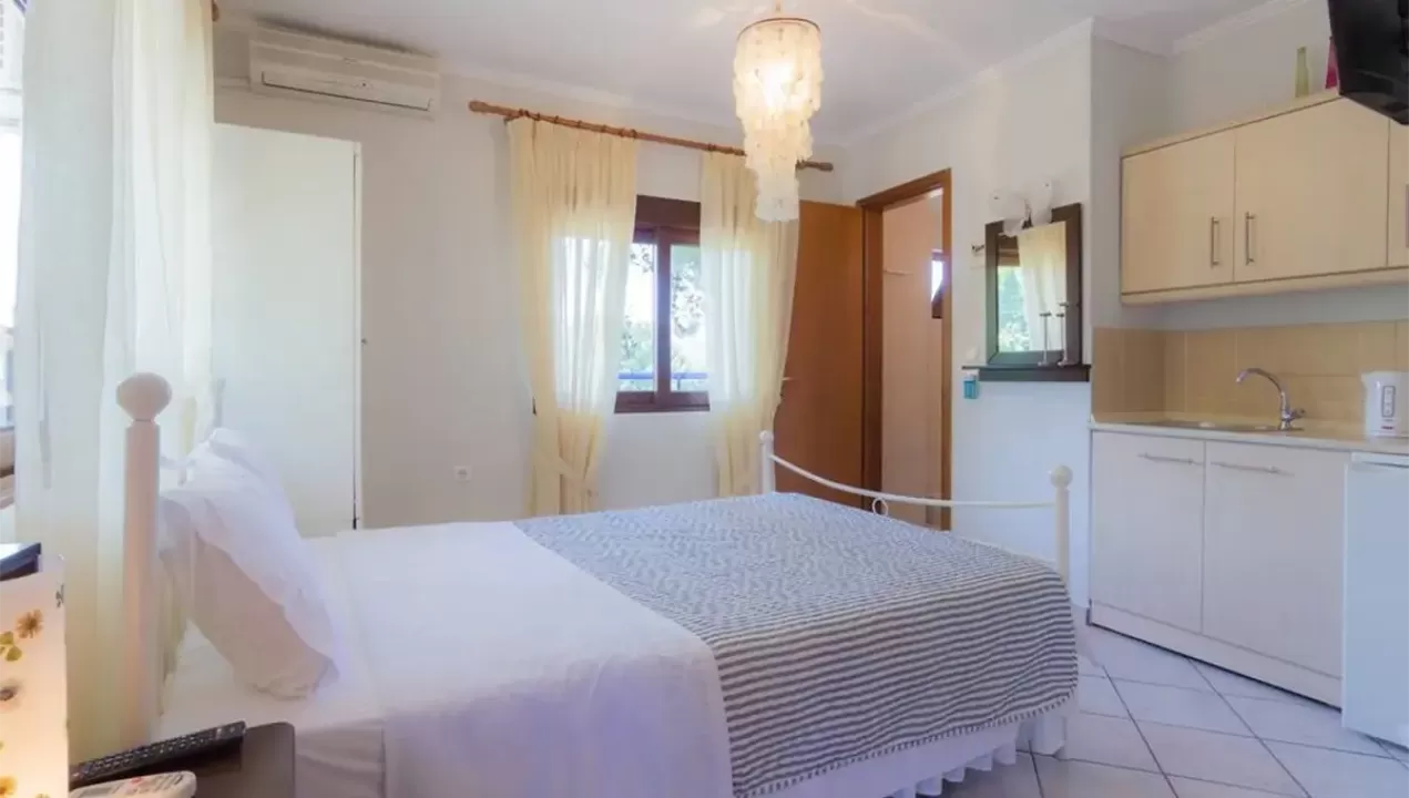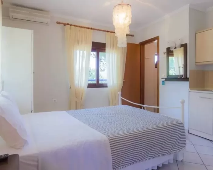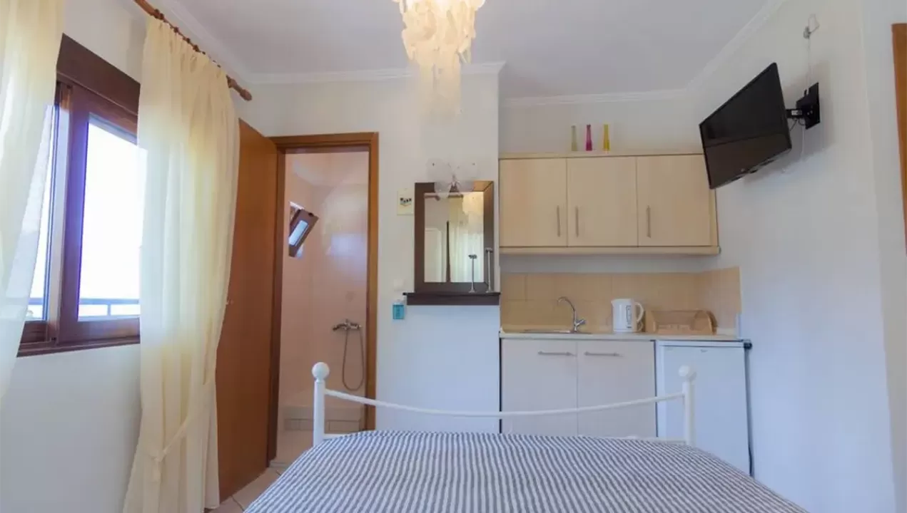 Tip smeštaja:1/2 studio - u jednoj prostoriji čajna kuhinja i jedan bračni ležaj.1/4 duplex apartman - u jednoj prostoriji jedan bračni, u drugoj prostoriji drugi bračni ležaj, odvojena kuhinja i kupatilo.U pojedinim slučajevima moguća su odstupanja mera ležaja od našeg standarda. Grčki standard za ležaj je 185 cm sa 75-80 cm, a bračni ležaj (dve osobe) 185-200 cm sa 120-155 cm.