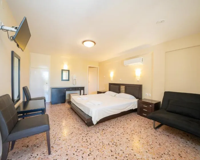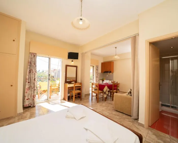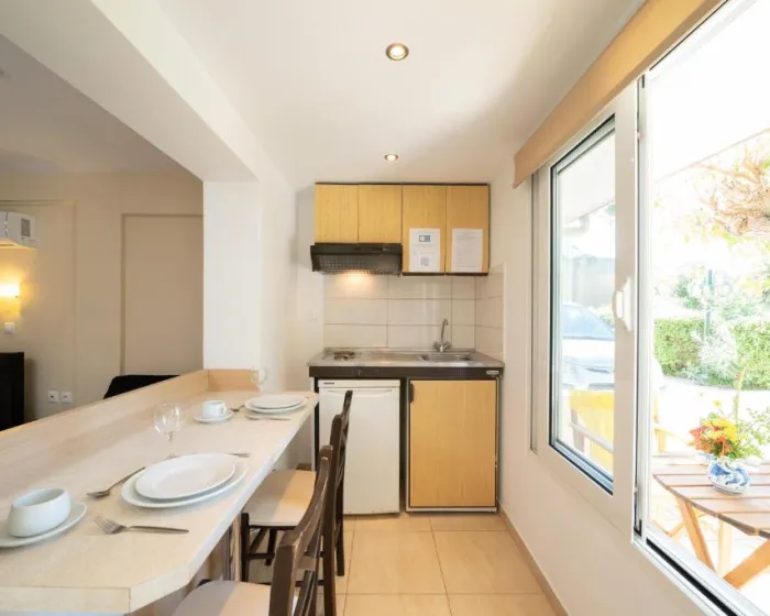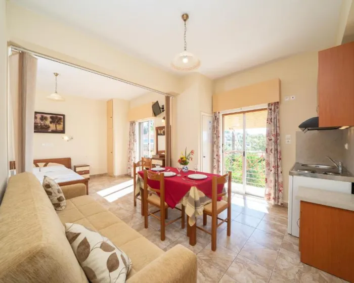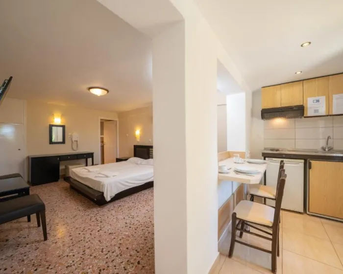 Smeštajne jedinice uključuju studije i apartmane opremljene klima-uređajem, besplatnim Wi-Fi internetom, čajnom kuhinjom sa frižiderom i sopstvenim balkonom ili terasom sa pogledom na vrt ili bazen.