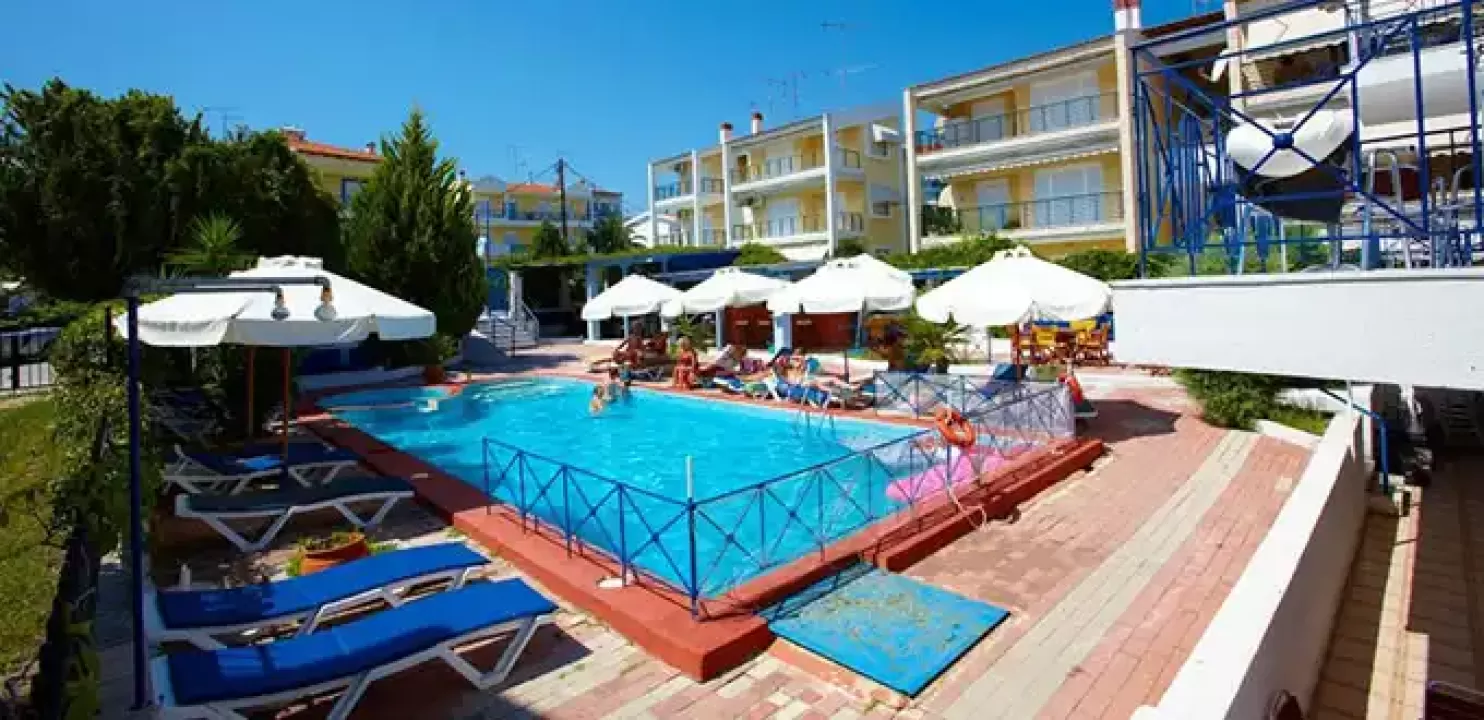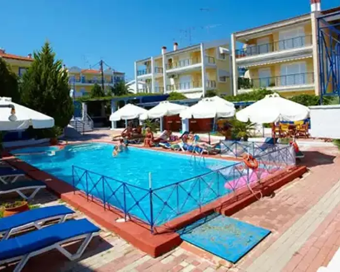 Macedonia Sky Hanioti se nalazi u mirnom delu Haniotija, na oko 450 metara od centra mesta i na oko 300 metara od plaže. U sklopu aparthotela je dvorište sa bazenom, ležaljkama i garniturama za sedenje, kao i mala bašta. Svi apartmani su namenjeni za smeštaj do 4 osobe.  Mogućnost doplate polupansiona.