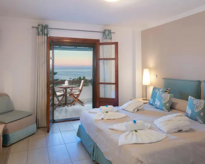 Sobe su opremljene klima uređajem i centralnim grejanjem. U većini jedinica, balkon sa pogledom na more pruža idealno mesto za opuštanje. Sobe imaju bračni krevet i sofu na razvlačenje. Dodatni kreveti mogu biti zatraženi. Na raspolaganju su sef i minibar. TV i WiFi (bez dodatne naplate) pružaju sve što je potrebno za udoban odmor. Fen za kosu i telefon su na raspolaganju u kupatilima za svakodnevnu upotrebu. Hotel ima porodične sobe i sobe za nepušače.
