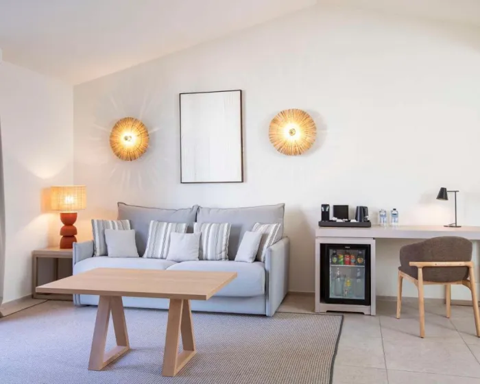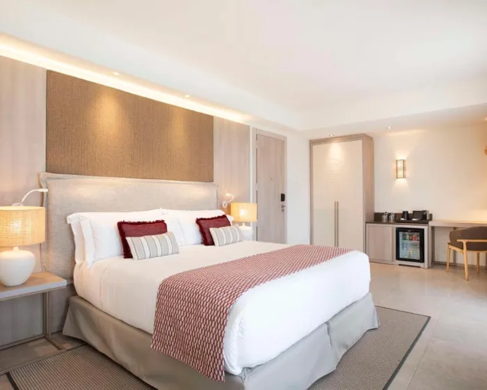 Sobe su opremljene klima uređajem i centralnim grejanjem. U većini jedinica, gosti mogu uživati u pogledu na more sa balkona ili terase. Gostima je zagarantovan dobar san u bračnom krevetu. Dodatni kreveti ili dečiji krevetići mogu biti obezbeđeni na zahtev. Na raspolaganju su i sef i minibar. Gosti će takođe pronaći aparat za čaj/kafu među standardnim sadržajima. Set za peglanje je obezbeđen radi gostove praktičnosti. Takođe su obezbeđeni telefon, TV, alarm i WiFi. Kupatila su opremljena tušem i bideom. Fen, bade mantili i telefon su dostupni za svakodnevnu upotrebu. Sobe prilagođene za osobe sa invaliditetom sa kupatilima prilagođenim za invalidska kolica su takođe dostupne. Odmaralište ima 55 porodičnih soba i 199 soba za nepušače.