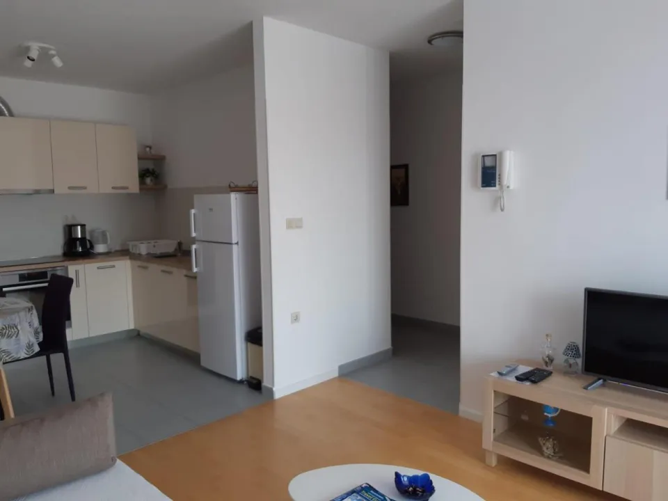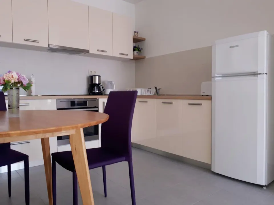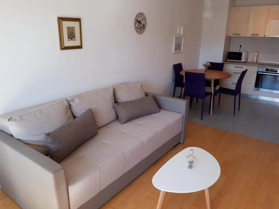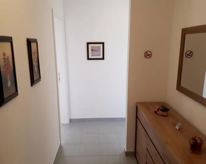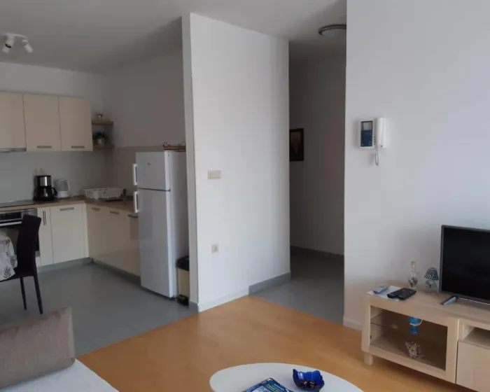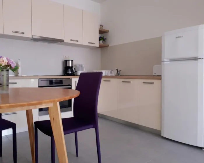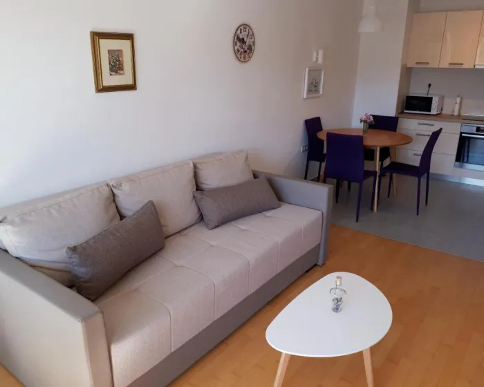 Klimatizovani apartman sastoji se od 1 spavaće sobe, dnevnog boravka, potpuno opremljene kuhinje sa mašinom za sudove i aparatom za kafu, i 1 kupatila sa bideom i fenom za kosu. Peškiri i posteljina obezbeđeni su u apartmanu. Radi dodatne privatnosti, smeštaj ima privatni ulaz.