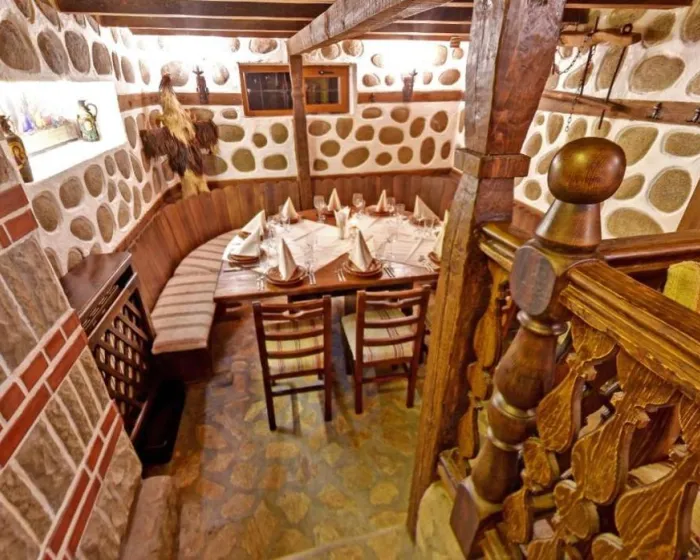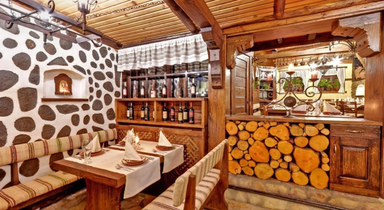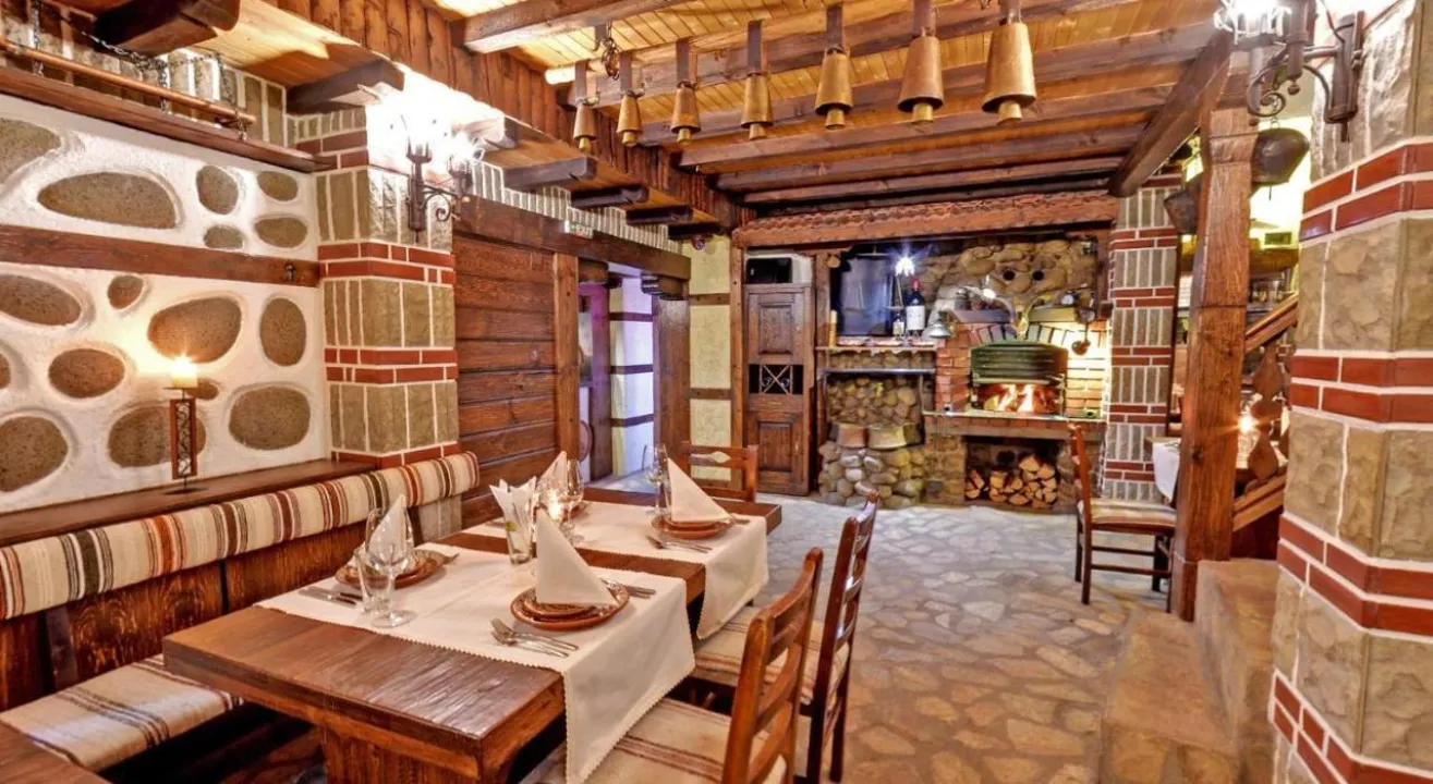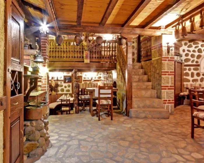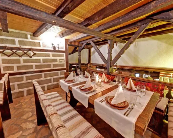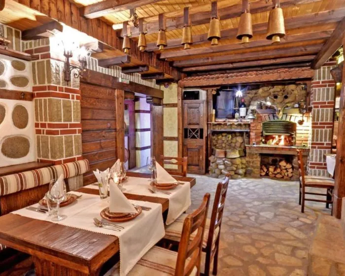 U ušuškanoj taverni u ponudi su regionalna i nacionalna jela, neka od kojih se pripremaju na otvorenom uglju. Lokalne opcije su takođe dostupne za doručak, uključujući domaći jogurt, džem i borovnice i jagode iz obližnje šume.