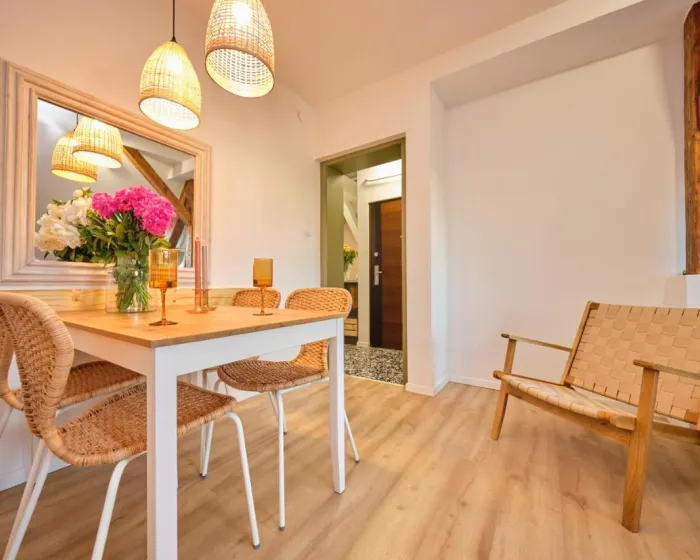 Klimatizovani apartman se sastoji od 1 spavaće sobe, dnevnog boravka, potpuno opremljene kuhinje sa mašinom za pranje sudova i ketlerom, i 1 kupatila sa kadom ili tušem i fenom za kosu. Peškiri i posteljina su dostupni u apartmanu. Smještaj je za nepušače.