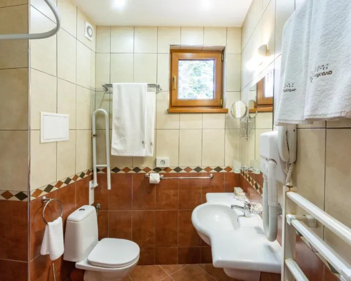SAT-TV, telefon, internet, mini-bar, kupatilo sa kadom, fen, terasa.