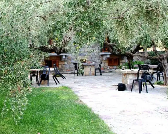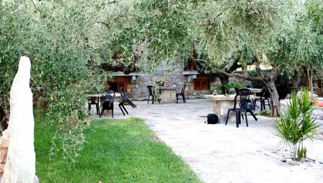 lepo uredjeno dvorište sa garniturama za sedenje.