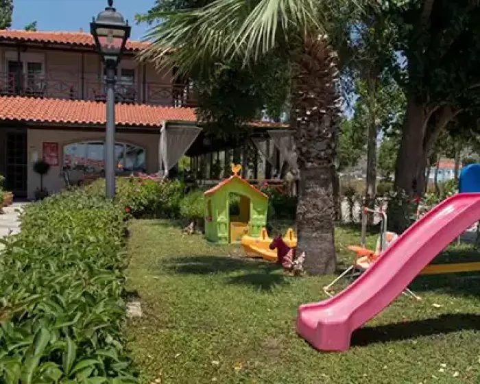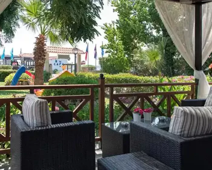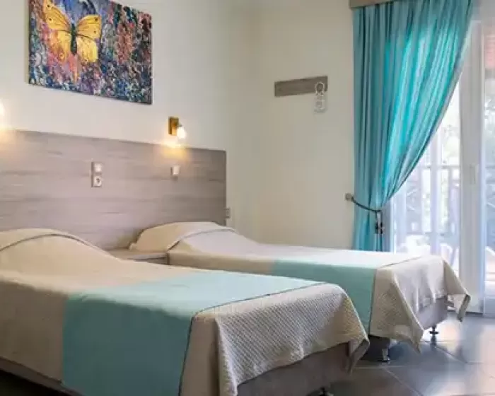 Sobe: mini kuhinja opremljena osnovnim posudjem za kratku pripremu laganih obroka uz vremenski minimalno kuvanje, klima (uz doplatu), kupatilo, balkon sa pogledom na more ili baštu, sef (uz doplatu), TV, Wi-Fi.