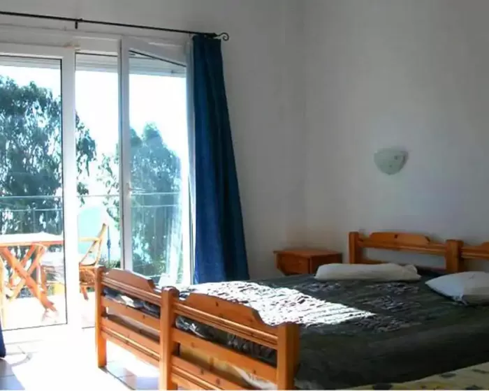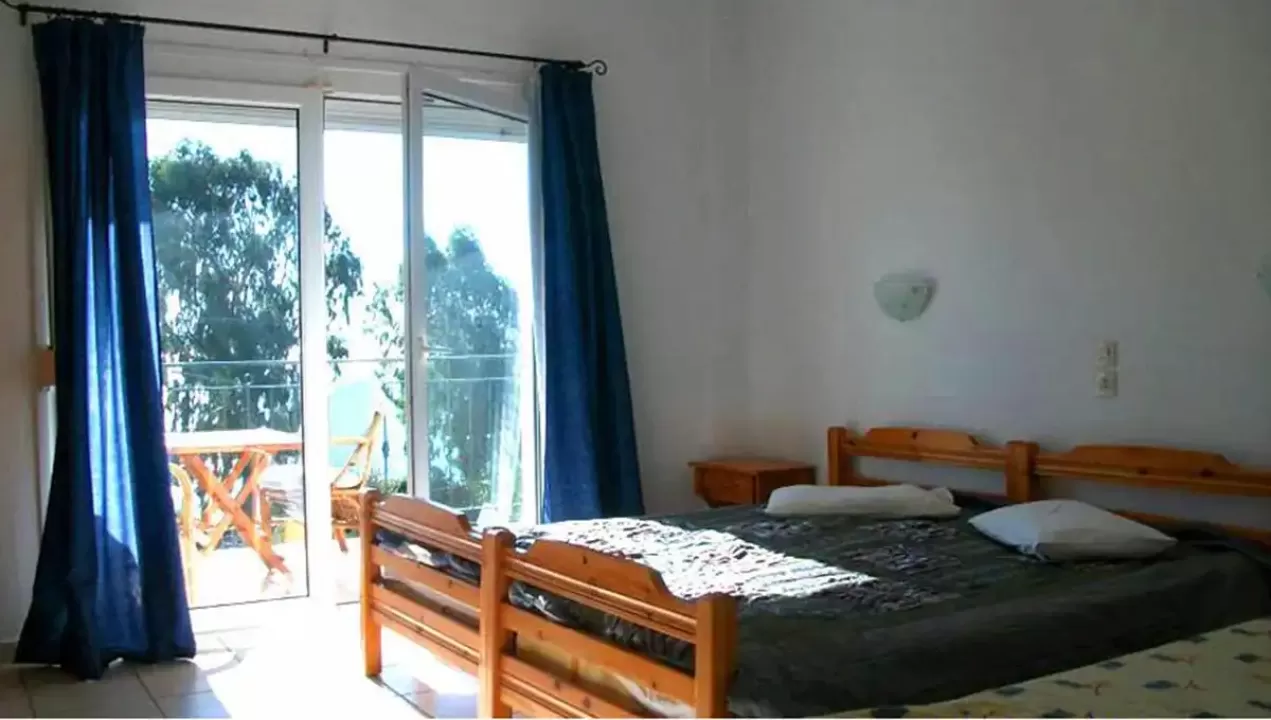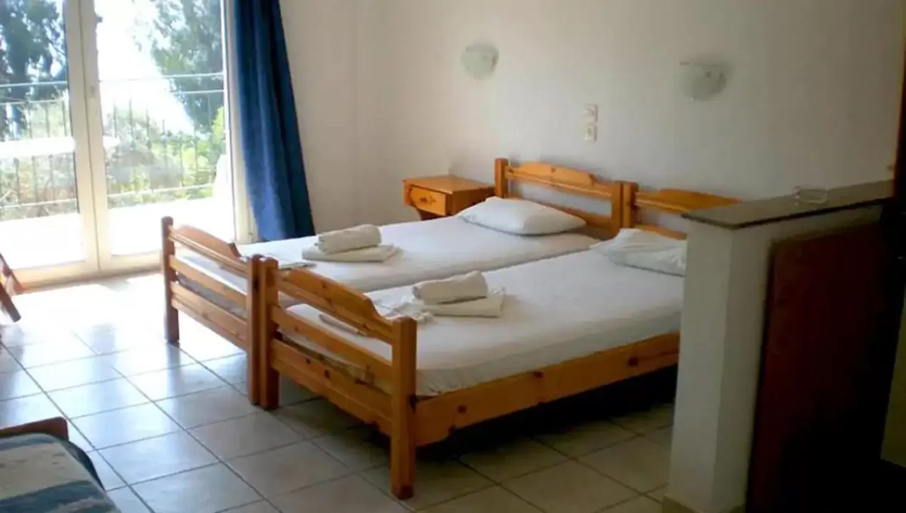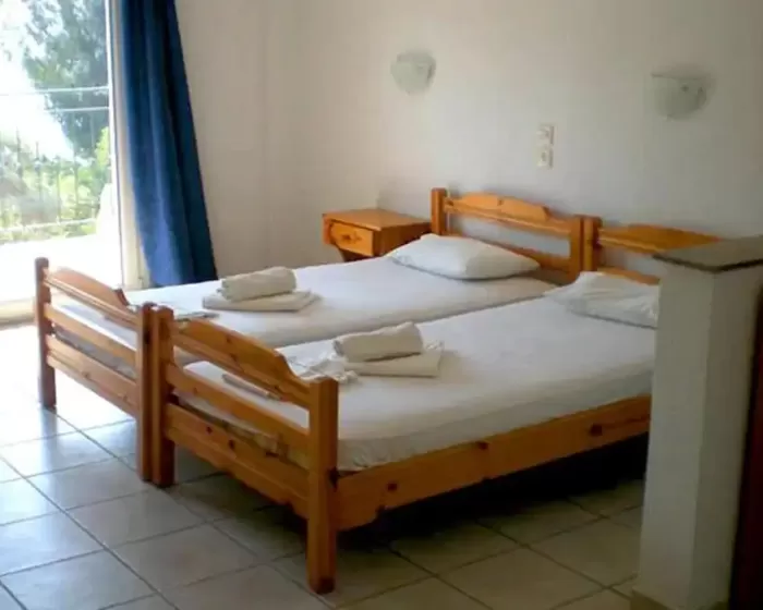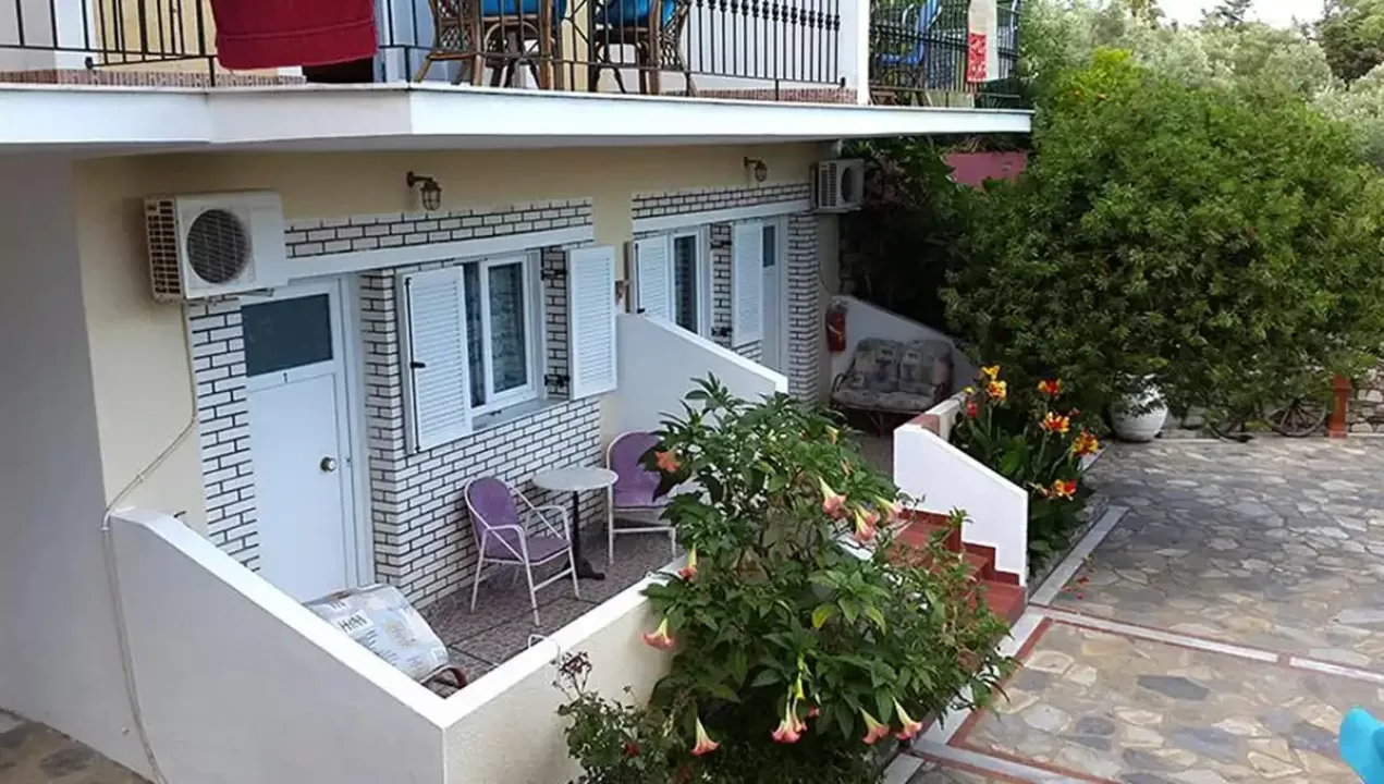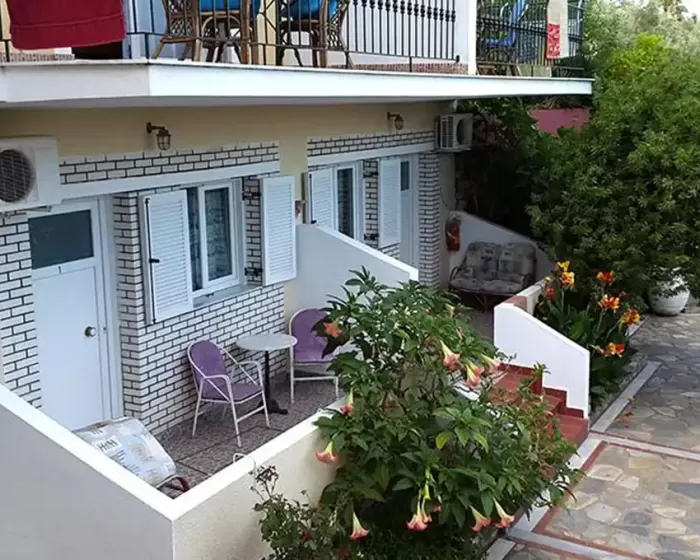 Vila Noula se nalazi u lepom mediteranskom vrtu, na idealnoj lokaciji, oko 1,5 km od centra grada, preko puta plaže Megali Amos. Do centralnog dela ove prelepe plaže je udaljena oko 350 m. Studiji vile Noula su smešteni u prizemlju i imaju kompletno opremljenu čajnu kuhinju u okviru sobe, kupatilo (tuš/WC), TV, terasu, kao i klima uredjaj čije se korišćenje doplaćuje na licu mesta (5 € dnevno po smeštajnoj jedinici). Ova doplata nije obavezna. Vila Noula ima peškire, besplatan Wi-Fi internet, kao i mogućnost sopstvenog parkinga. Najbliži mini market je udaljen oko 250 m, a restoran oko 650 m. Vila je idealna za mlade zbog blizine grada, ali i za porodice, jer je plaža u neposrednoj blizini, a veliki vrt i dvorište su na raspolaganju deci.