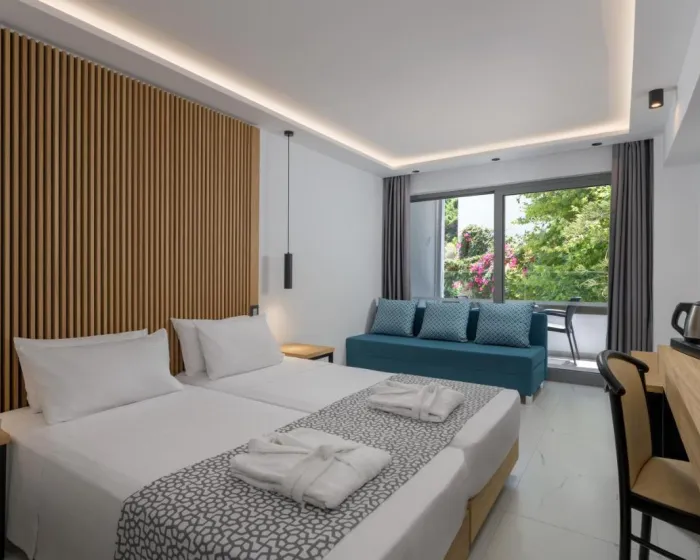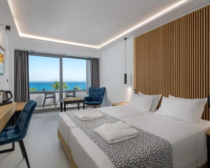 Klima uređaj i centralno grejanje osiguravaju da sobe održavaju udobne temperature. Većina jedinica uključuje balkon sa pogledom na more, gde gosti mogu da se opuste i zadrže se malo. Sve sobe su popločane i imaju bračni krevet, krevet king size ili krevet queen size. Kreveti za decu i dodatni kreveti mogu se zatražiti za mlađe goste. Takođe su dostupni sef i mini bar. Dodatni sadržaji uključuju frižider i čajnu/kafenu stanicu. TV, radio i WiFi (bez dodatne naplate) pružaju sve neophodno za udoban odmor. Kupatila su opremljena tušem i kadom, kao i fenom za kosu. Hotel ima porodične sobe i sobe za nepušače.