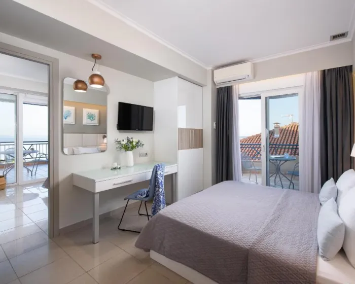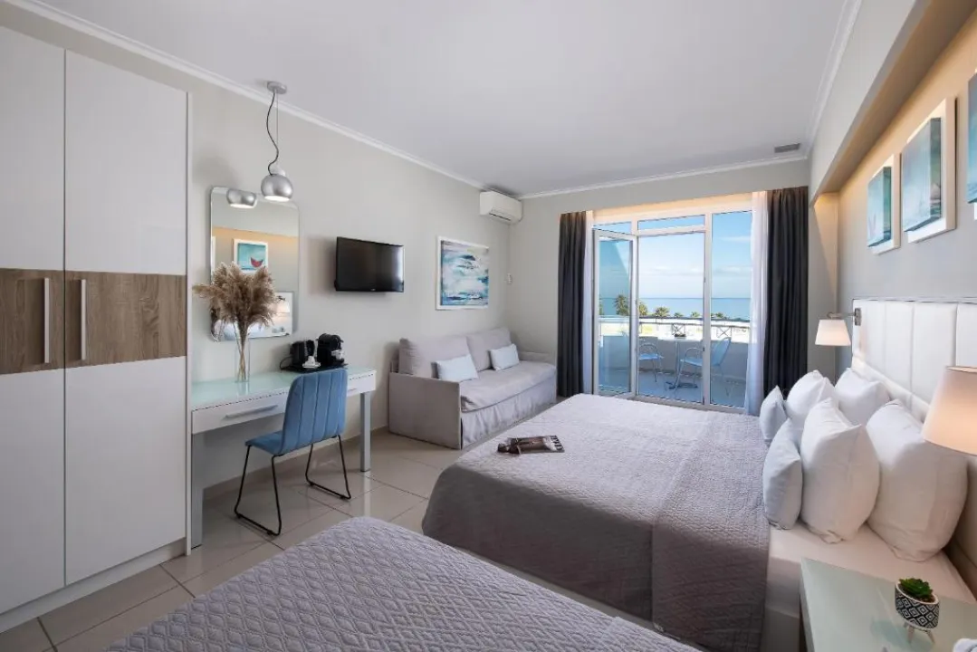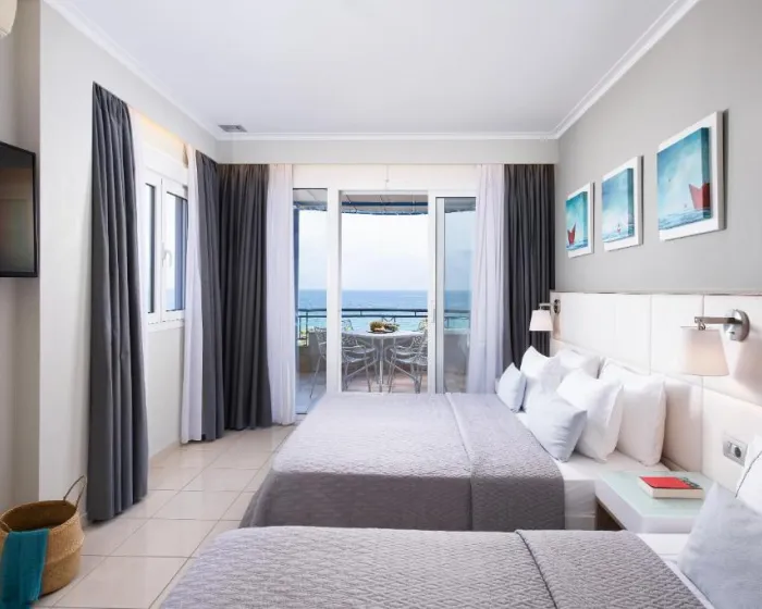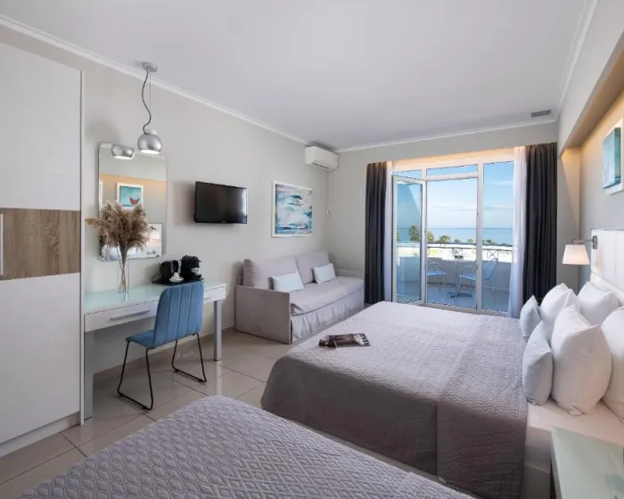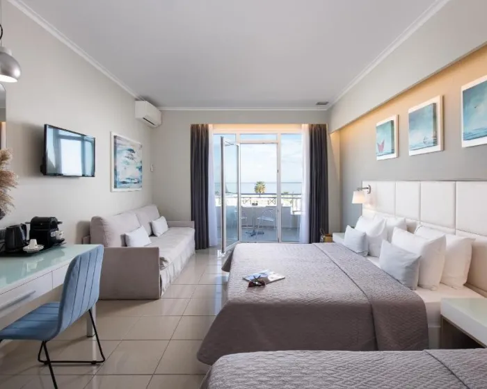 Junior suite oko 35m², sa direktnim pogledom na more, sastoji se od jednog prostora, francuski ležaj ili dva odvojena kreveta i sofa, namenjeno za 2-4 osobe