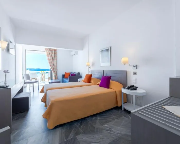 Klima uređaj i podesiva centralno grejanje osiguravaju udobnu temperaturu u sobama. Gosti mogu uživati u pogledu na more s balkona ili terase. Sobe imaju bračni krevet i sofu. Dodatni kreveti mogu biti zatraženi. Sef, mini bar i radni sto su takođe dostupni. Dodatne karakteristike uključuju frižider i aparat za kafu/čaj. Posteljina za peglanje je obezbeđena radi gosteove praktičnosti. Telefon, TV i WiFi (bez dodatne naplate) su takođe obezbeđeni. Gosti mogu iskoristiti uslugu večernje usluge spremanja sobe. Papuče su uključene. Kupatila su opremljena tušem i kadom, kao i fenom za kosu. Porodične sobe su dostupne za roditelje sa decom.