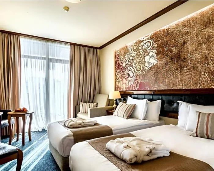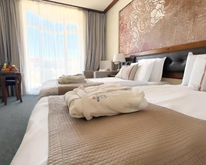 Dvokrevetna ECO soba za 2-3 osobe (2+1) bez balkona: soba manjih dimenzija od standardne, bez terase,francuki ležaj sa pomoćnim ležajem ili foteljom na rasklapanje. Namenjena smeštaju maksimalno 3 odrasle osobe ili 2 odrasle osobe i jednog deteta.