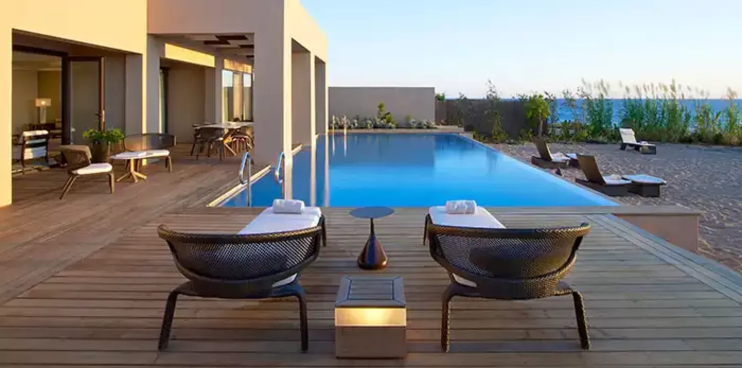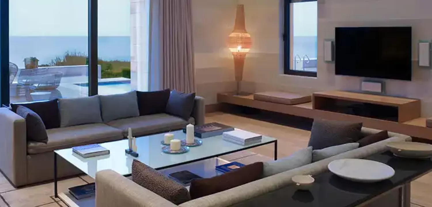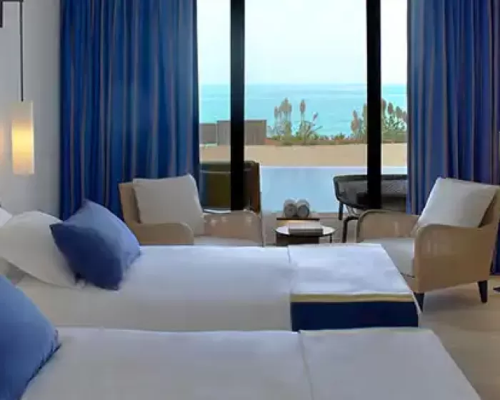 Maksimalan broj osoba u sobi je odredjen tabelom i stavkom \"Max Osoba\".Ukupno 289 soba, 23 Suite i 9 vila.Deluxe Garden View (~43m²) & Deluxe Sea View Rooms (~43m²), Premium Deluxe Sea View Rooms (~43m²), Infinity Rooms (~43m²), Premium Infinity Rooms (~43m²), Ionian Exclusive Grand Suites (~82 m²), Ionian Exclusive Grand Infinity Suites (~82 m²), Ionian Exclusive Grand Infinity Sea Suite (~82 m²), Vila Master Infinity (~142 m²), Grand Infinity Suite и soba Premium Infinity, Vila Ithomi и Sapienza (192 m²), Royal Villa Methoni (~630 m²), Royal Villa Koroni (~660 m²).U sobama: klima, mini-bar (uz doplatu na licu mesta), LCD TV (42\"), telefon, wifi internet(uz naknadu na licu mesta), sef, fen, mermerno kupatilo (kada, tuš, bade mantili i papuče, vaga), nameštena terasa.Deluxe Garden View (~ 43 m²) & Deluxe Sea View Room (~, 43 m²) - nameštena terasa sa pogledom na baštu i maslinjake odmarališta ili na golf teren i more.Premium Deluxe Sea View Room (~43 m²) - prva linija od mora, predivan pogled na more.Infinity Room (~43 m²) - privatni bazen (23 m²), pristup nameštenoj terasi, pogled na bašte i maslinjake odmarališta ili na golf teren i more.Premium Infinity Room (~43 m²) - prva linija od mora, privatni bazen (23 m²), prostrana nameštena terasa, pogled na more.Ionian Exclusive Grand Suite (~82 m²) - jedinstveni dizajn, lep pogled na baštu ili na golf teren i more. Ekskluzivno uredjena spavaća soba i dnevni boravak, kućni bioskop, velika terasa sa kaminom, Nespresso aparat za kafu. Kupatilo (tuš). Batler, na zahtev.Ionian Exclusive Grand Infinity Sea Suite (82 m²) - privatni bazen (23-35 m²), predivan pogled na baštu ili na golf teren i more, moderno uredjena spavaća soba i dnevni boravak, kućni bioskop, velika terasa sa kaminom, Nespresso aparat za kafu. Kupatilo (tuš). Batler, na zahtev.Premium Grand Infinity Suite (~82 m²) - prva linija od mora, privatni bazen (23-35 m²), velika terasa sa kaminom, predivan pogled na more. Spavaća soba, veliki dnevni boravak, kućni bioskop, aparat za kafu Nespresso. Kupatilo (tuš). Batler, na zahtev. Villa Master Infinity (~142 m²) - prelepa vila na plaži. Spavaća soba, kabinet, privatni otvoreni prostor, terasa sa ležaljkama oko bazena (48 m²). Dnevni boravak sa prostorom za sedenje, trpezarija, kamin, kućni bioskop, mala kuhinja. U spavaćoj sobi veći krevet. Kupatilo (pored spavaće sobe), toaletni stočić, kada, tuš, kozmetičko ogledalo. Usluga batlera.Ville Ithomi i Sapienza (~192 m²) - izlaz na more. Prostrana peščana zona sa bazenom (70 m²). 2 spavaće sobe, dnevni boravak, prostran prostor za sedenje, trpezarija, podovi od tvrdog drveta, kućni bioskop. Od svih soba - izlaz na veliku terasu sa ležaljkama, malom kuhinjom. U jednoj spavaćoj - veliki bračni krevet, u drugoj 2 odvojena kreveta. U svakom kupatilu, toaletni stočić, kada, tuš, kozmetičko ogledalo. Usluga batlera.Royal Villa Koroni (660 m²) - u blizini plaže. Tri spavaće sobe. Lift, prostrane terase sa luksuznim nameštajem, pristup privatnom bazenu (72 m²). U dve spavaće sobe veći bračni krevet, u trećoj 2 odvojena kreveta. Svaka spavaća soba ima kupatilo i prostrani garderober. Spavaća soba na gornjem spratu ima djakuzi, prostranu terasu sa panoramskim pogledom na plažu Dunes Beach. Visoki plafoni, veliki ravni ekrani, napredni multimedijalni sistemi i luksuzne sofe, trpezarija za 14 osoba, kuhinja, privatna teretana, parno kupatilo, soba za osoblje. Usluga batlera.Sve sobe su za nepušače (pušenje je moguće na terasi).Mogućnost povezivanja soba i apartmana (na zahtev).Royal Villa Methoni(~630 m²) - lepa vila sa 3 spavaće sobe u blizini plaže. Velike terase sa pristupom privatnom bazenu (75m²) i velikoj peščanoj zoni. Dve glavne spavaće sobe sa velikim bračnim krevetom, a u trećoj spavačoj sobi 2 odvojena kreveta. Svaka spavaća soba ima kupatilo i prostrani garderober. Spavaća soba na gornjem spratu ima djakuzi, prostranu terasu sa panoramskim pogledom na plažu Dunes Beach. Visoki plafoni, veliki ravni ekrani, napredni multimedijalni sistemi i luksuzne sofe, trpezarija, kuhinja, privatna teretana, parno kupatilo, soba za osoblje. Usluga batlera.Sve sobe su za nepušače (pušenje je moguće na terasi).Mogućnost povezivanja soba i apartmana (na zahtev)