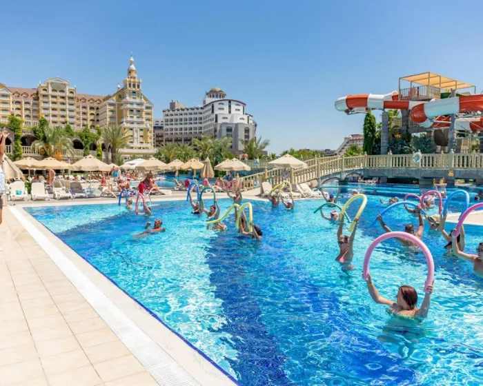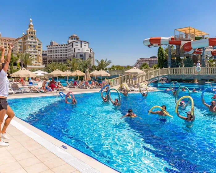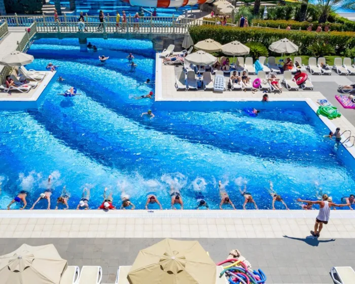 Prostrani prostor bazena, koji uključuje 2 spoljna bazena, odlično je mesto za opuštanje i osveženje. Čak i u hladnim danima, plivanje je uvek opcija na unutrašnjem bazenu. Deca mogu da se igraju u jednom od 3 dečija bazena. Čista relaksacija u đakuziju (bez dodatne naplate), zabava na toboganu i osvežavajući napici u baru pored bazena - gosti će doživeti koliko bogat i raznovrstan može biti dan proveden u vodi. Ležaljke i suncobrani su dostupni na sunčanoj terasi. Za goste koji žele da ostanu aktivni, dostupni su tenis, kuglanje i odbojka na plaži. Ponuđeni vodeni sportovi uključuju vodene aerobike (bez dodatne naplate). Takođe se nude različite unutrašnje sportske aktivnosti, kao što su teretana, stoni tenis, pikado, kalistenika i aerobik ili, uz nadoknadu, bilijar i kuglanje. Postoji wellness zona sa spa centrom, saunom, parnom kupkom i hamamom i, uz dodatnu naknadu, tretmani u spa centru i masaže. Dodatne aktivnosti u slobodno vreme uključuju dečiji klub, dečiji disko, živu muziku i plesni klub.