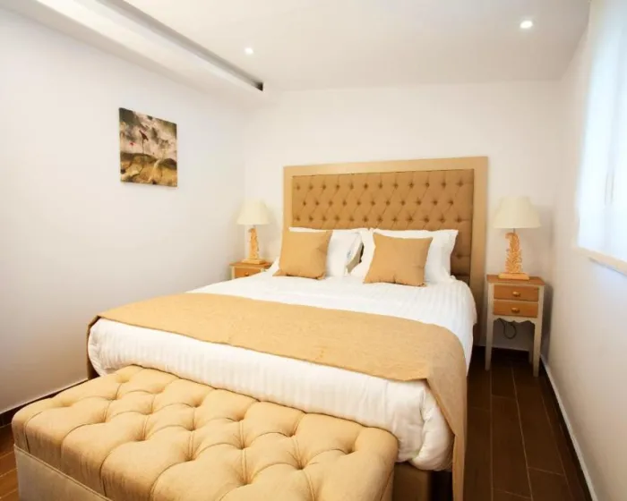 Duplex apartman salon sa kuhinjom (električni šporet sa 4 ringle) i kauč, 2 odvojene spavaće sobe (jedna sa francuskim ležajem, druga sa 2 odvojena ležaja).Po dolasku (u sobi) - voće, boca vina i boca vode.