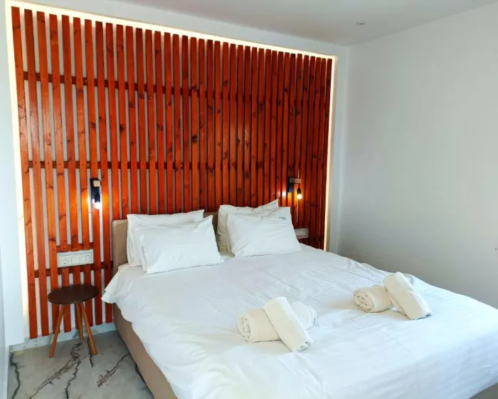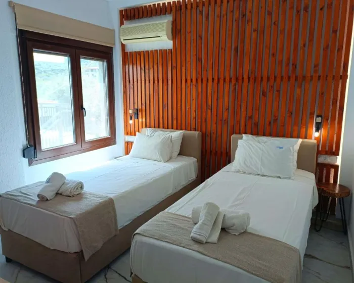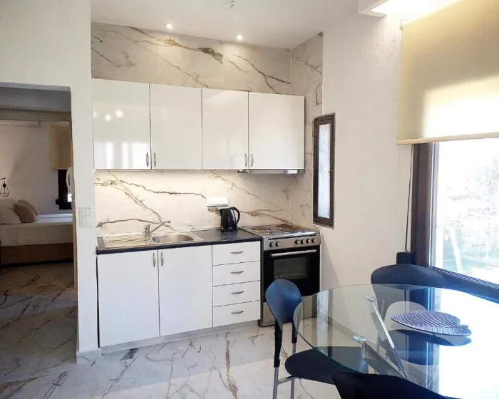 Ima 6 soba: Junior Suites(~40 m²), Apartman(~50 m²), Duplex apartman(~70 m²). U sobama: opremljena kuhinja (električni šporet sa 2 ringle, toster, aparat za kafu), kesica kafe i čaja, klima-uredjaj, mini-frižider, televizor, satelitska TV, wifi internet, kupatilo / tuš, anatomski dušeci, balkon / terasa / patio.