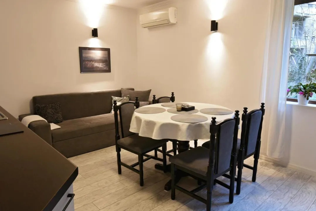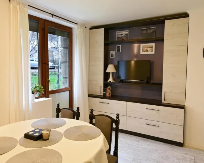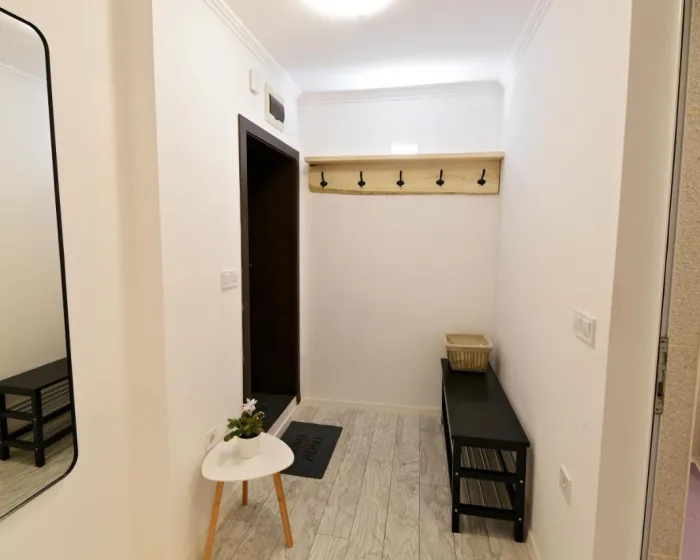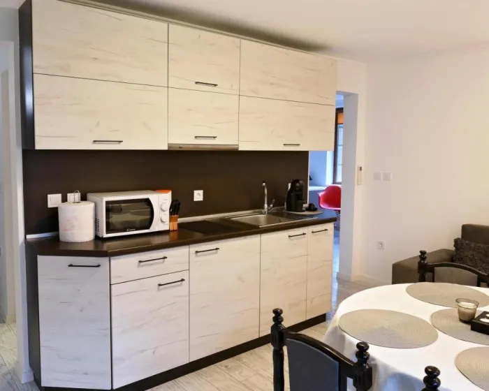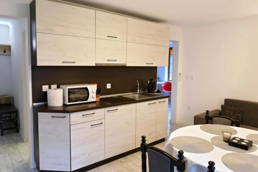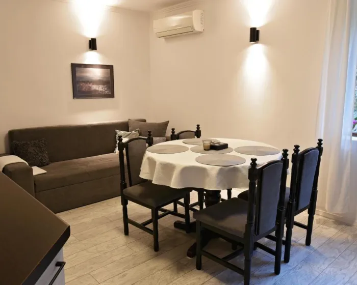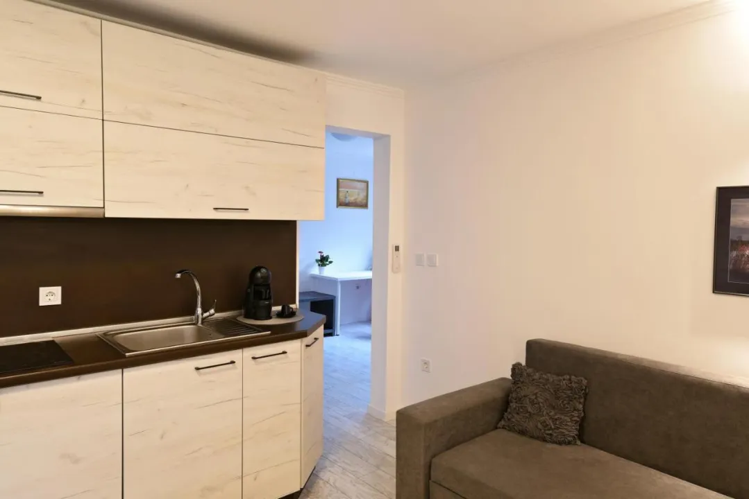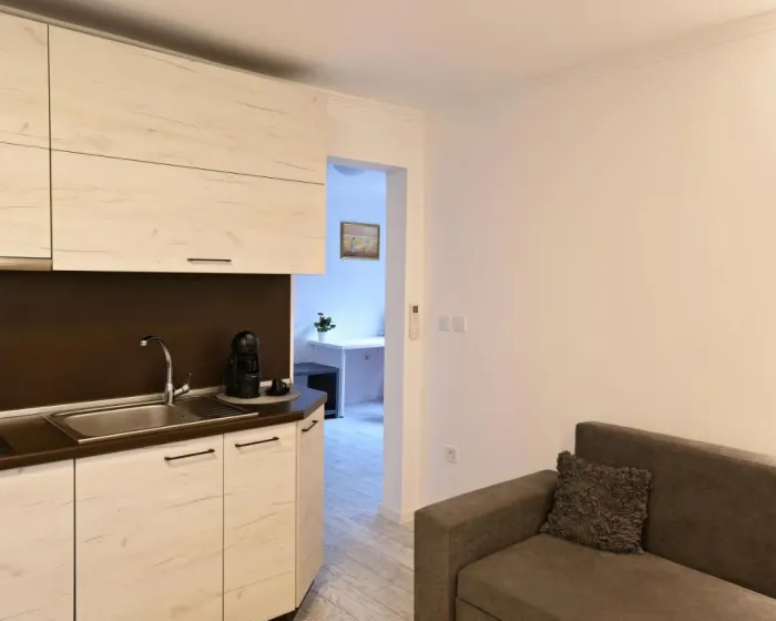Klimatizovan apartman sastoji se od 1 spavaće sobe, dnevnog boravka, potpuno opremljene kuhinje sa mikrotalasnom pećnicom i aparatom za kafu, kao i 1 kupatila sa tušem i fenom za kosu. Peškiri i posteljina su obezbeđeni u apartmanu.