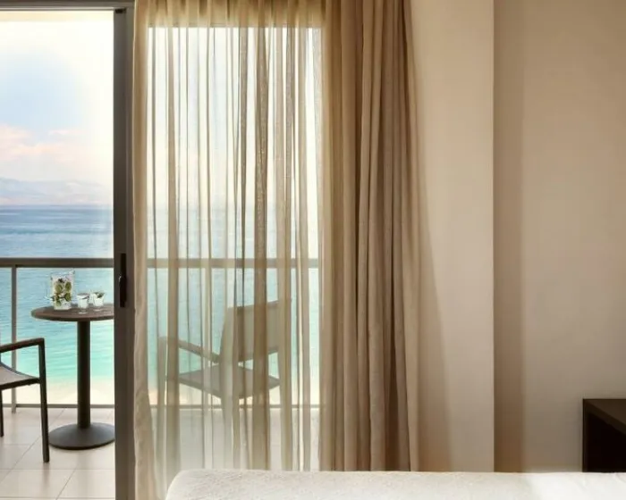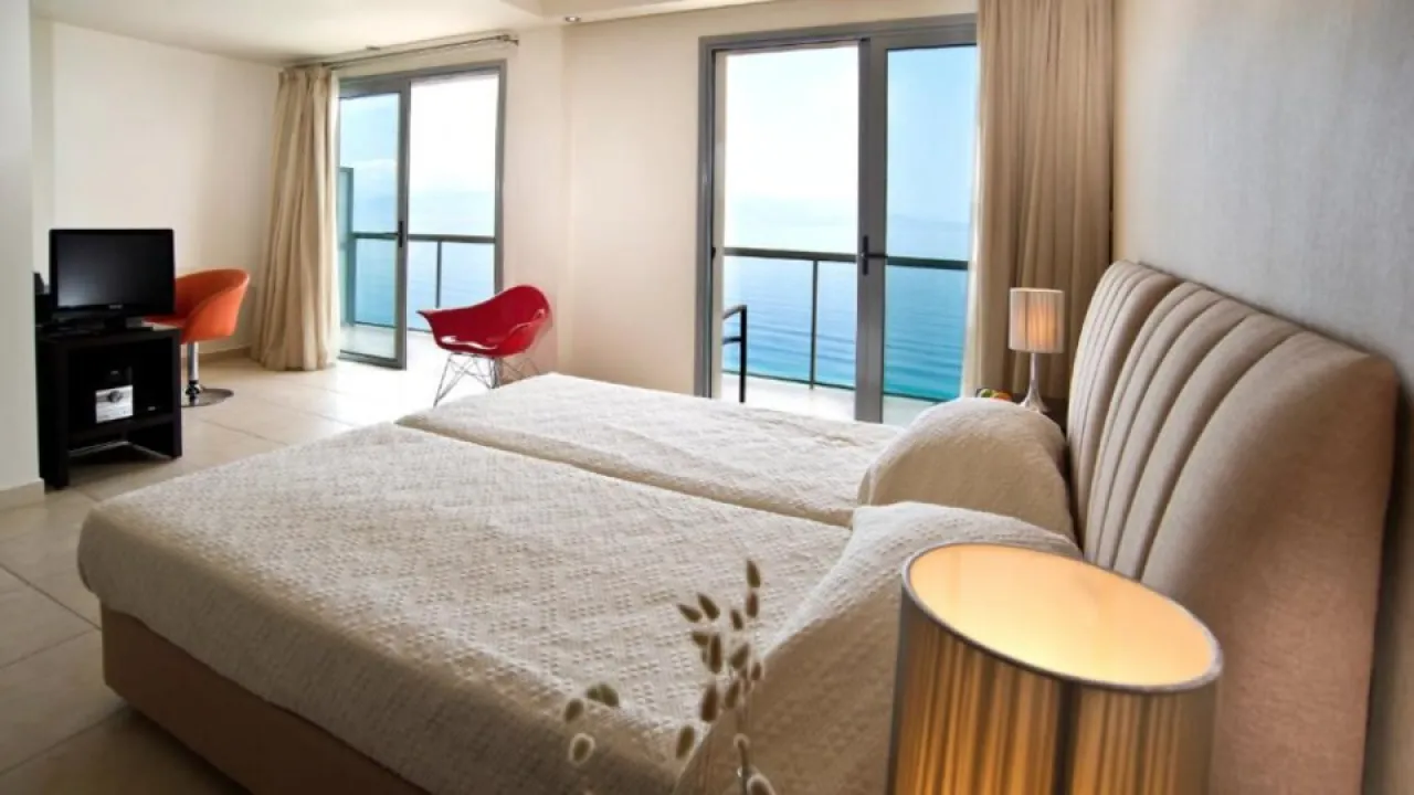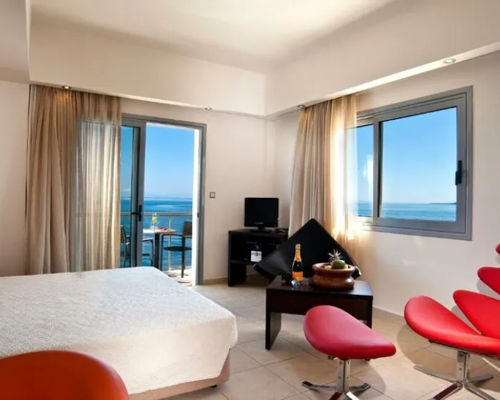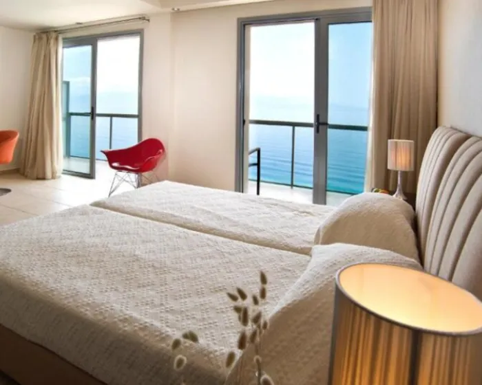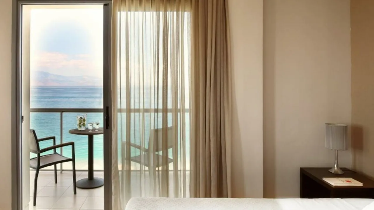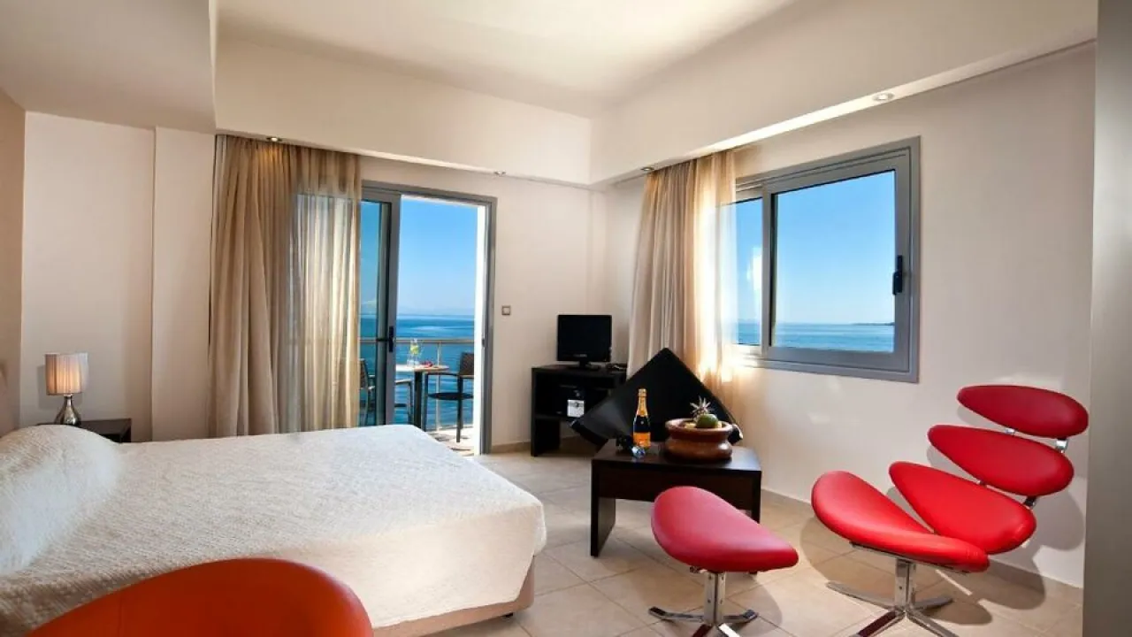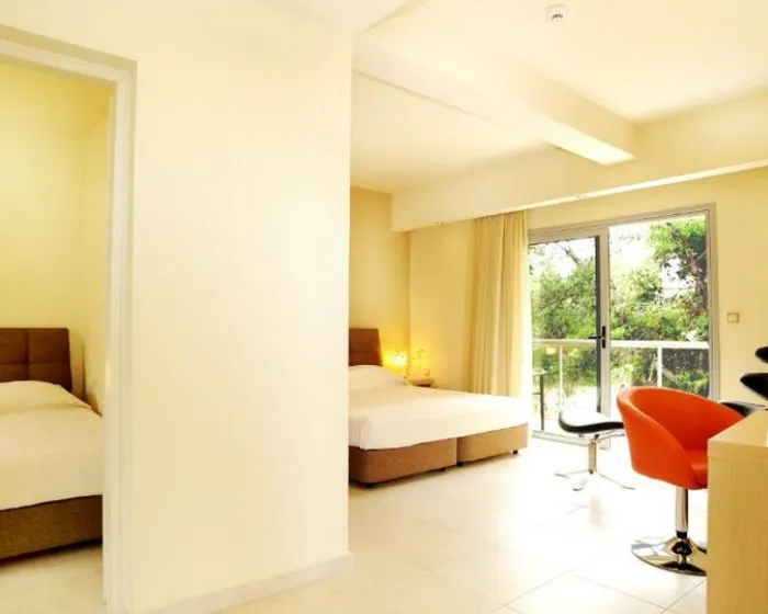 deluxe soba 27m2-34m2, maksimum 2 osobe: Pruža neograničen pogled na Korintski zaliv, hotelski bazen ili borovu šumu. „Zelene note“ koje šuma nudi, stvaraju najprikladnije uslove za romantične trenutke i opuštanje. Uređena u toplim zemljanim bojama i opremljena sa jednim bračnim krevetom ili 2 kreveta za jednu osobu.