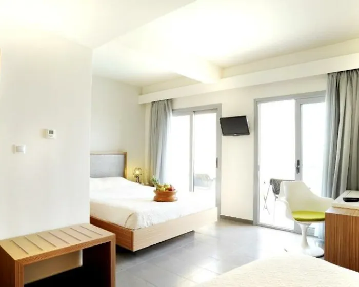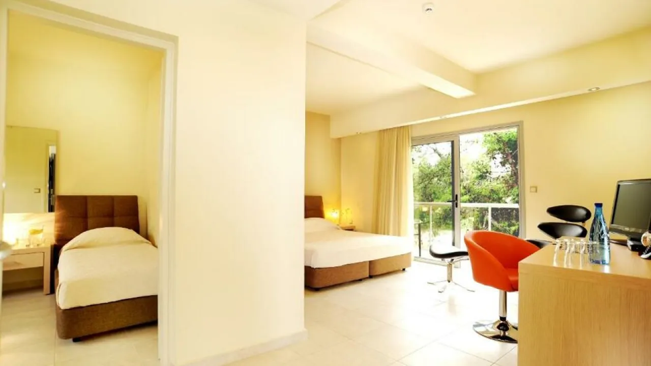 trokrevetna soba pogled bašta / more 27m2-36m2, maksimum 3 osobe: Pruža neograničen pogled na Korintski zaliv (šumu)i ova vrsta sobe je idealna za porodice sa jednim detetom ili 3 odrasle osobe. Uređene sa minimalističkim enterijerom i toplim zemljanim bojama, ove sobe su opremljene sa 1 bračnim krevetom i 1 krevetom za jednu osobu ili 3 singl kreveta.