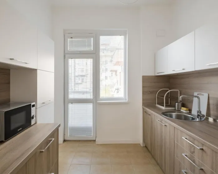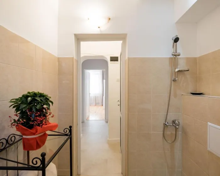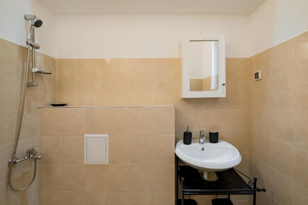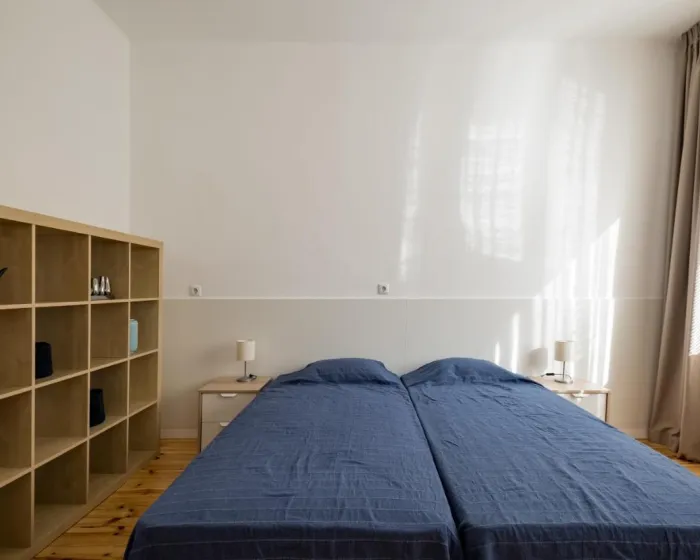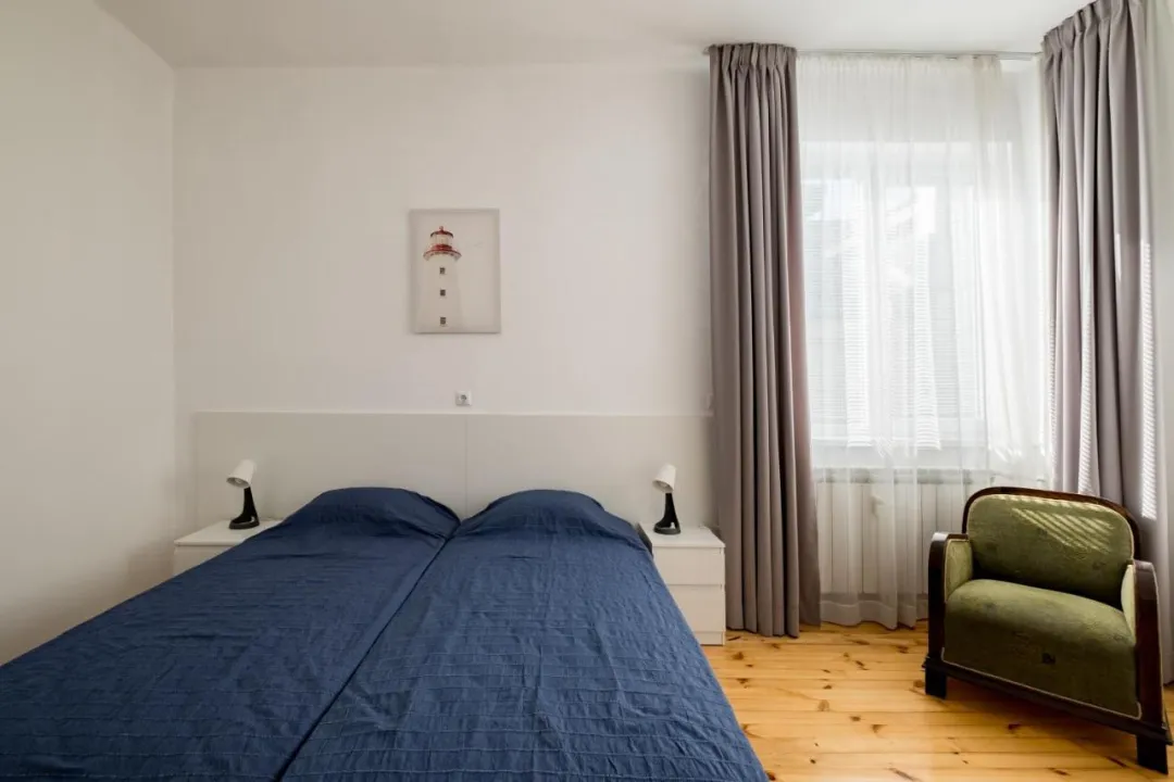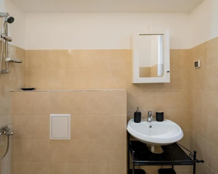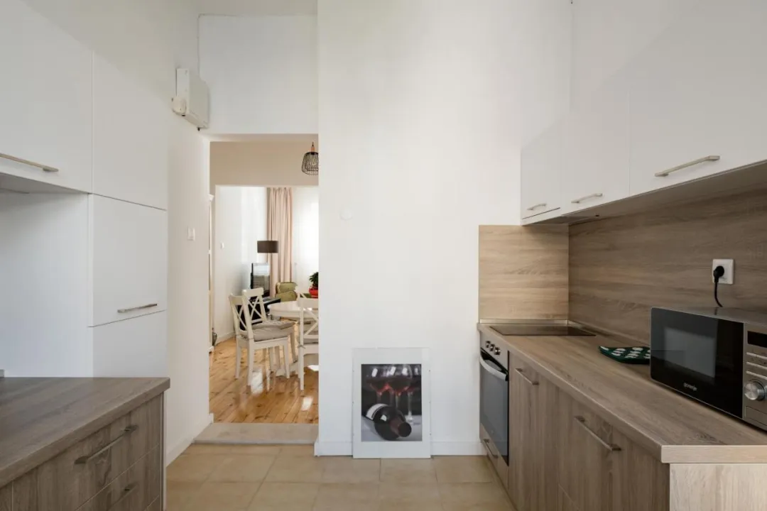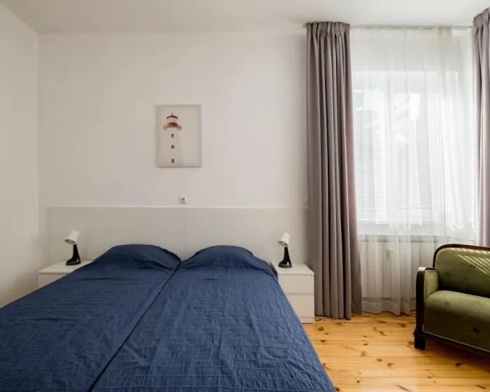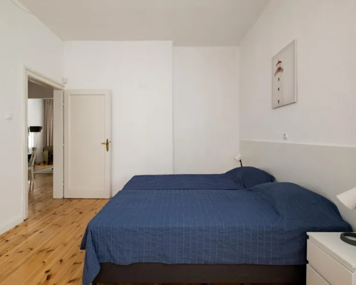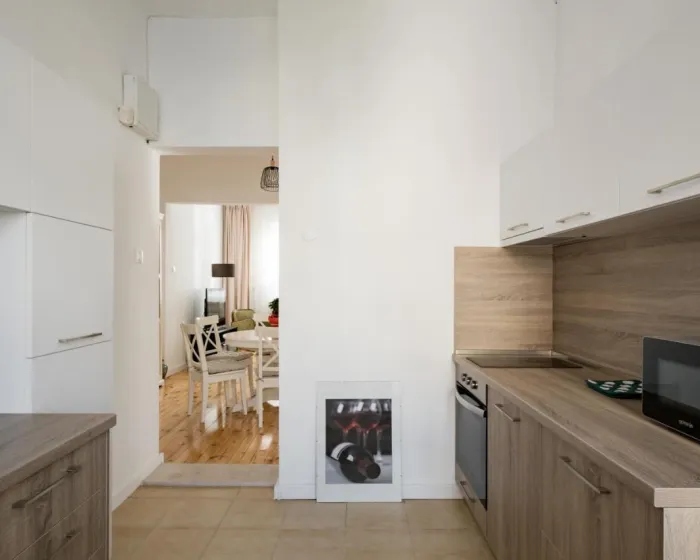 Klimatizovan stan se sastoji od 3 odvojene spavaće sobe, potpuno opremljene kuhinje sa mašinom za pranje sudova i rernom, kao i 1 kupatilo. Peškiri i posteljina su dostupni u stanu. Smeštaj je za nepušače.