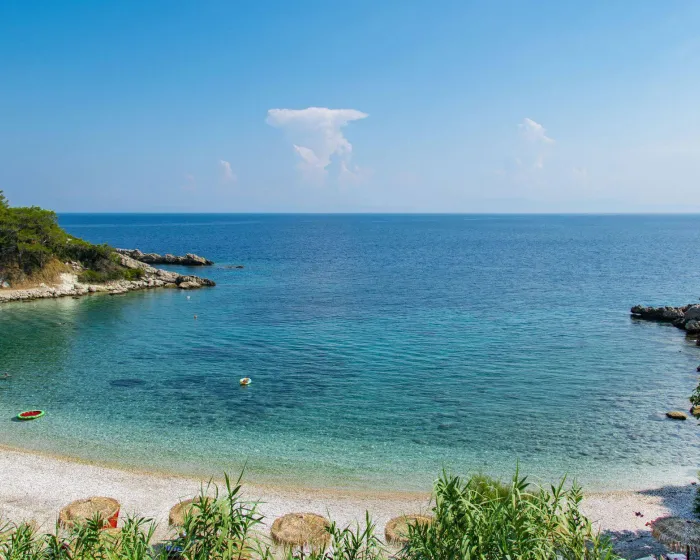 Samo nekoliko koraka niz brdo od naših vrata pronaći ćete netaknutu prirodnu plažu. Imate dve opcije kako da uživate u boravku na plaži. Možete iznajmiti ležaljke sa suncobranima ili jednostavno ležati na toplim finim kamenčićima i opustiti se uz zvuk prirode. Centar Kokkarija je udaljen samo 5 minuta hoda, gdje možete pronaći tradicionalne grčke taverne, muzičke barove, kafiće i prodavnice.