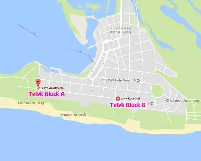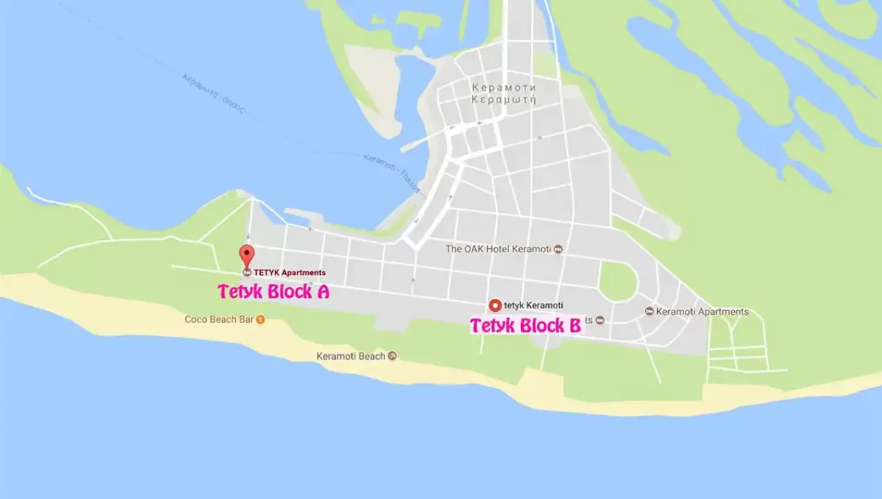 Vila Tetyk Keramoti se nalazi na oko 70 metara udaljenosti od lepe peščane plaže u Keramotiju, na oko 40 kilometara udaljenosti od grada Kavale i na oko 12 kilometara od medjunarodnog aerodroma u Kavali. U neposrednoj blizini smeštaja nalaze se svi potrebni turistički sadržaji. Usluga je najam bez ishrane.Ležaljke i suncobrani na plaži se doplaćuju.