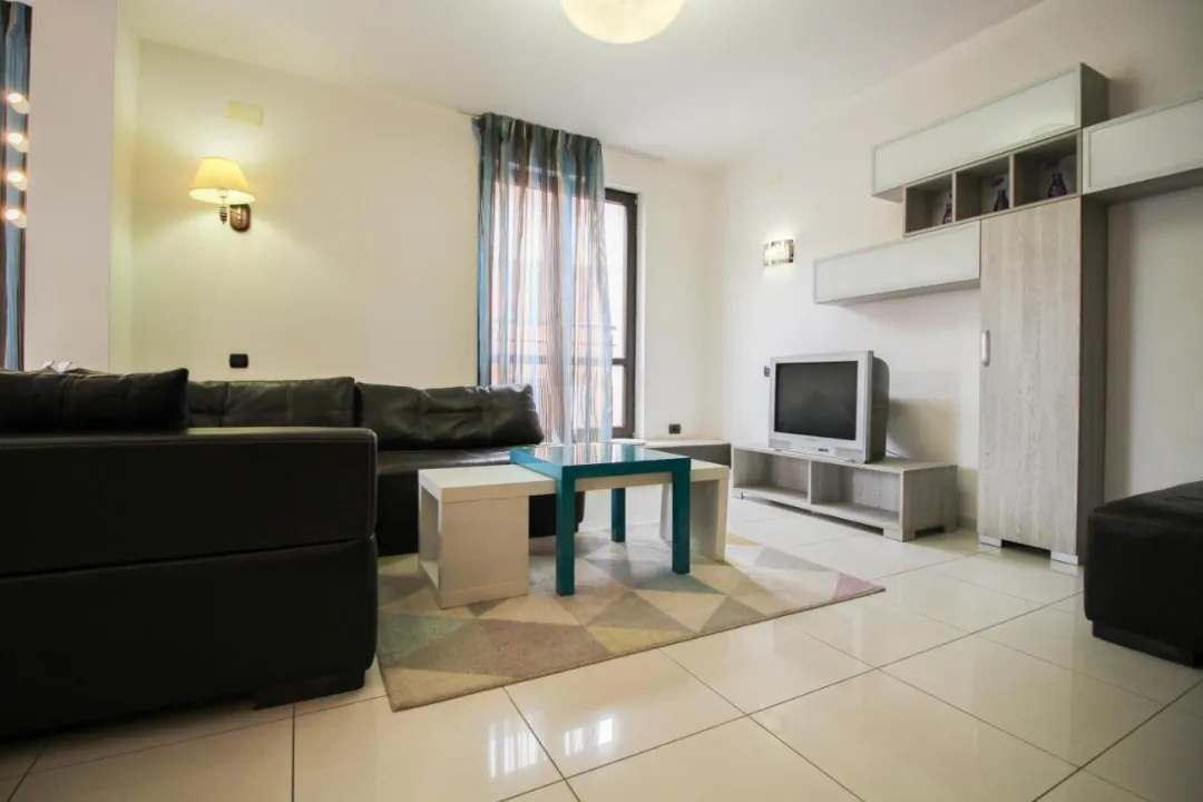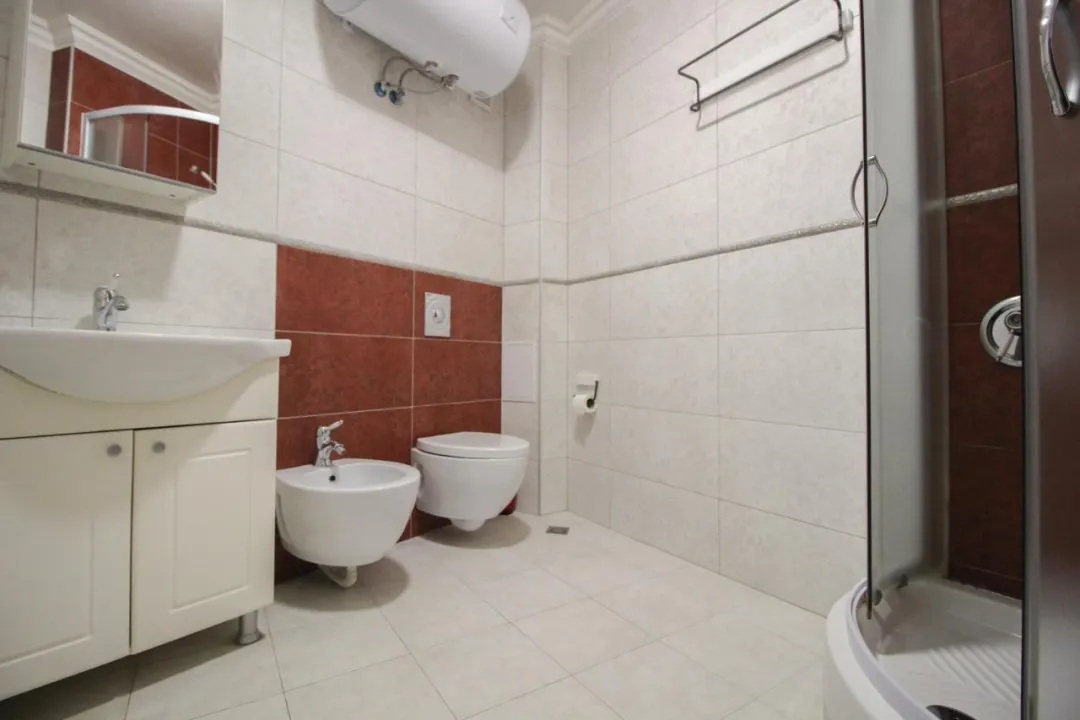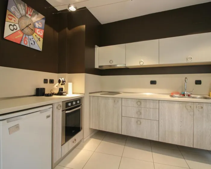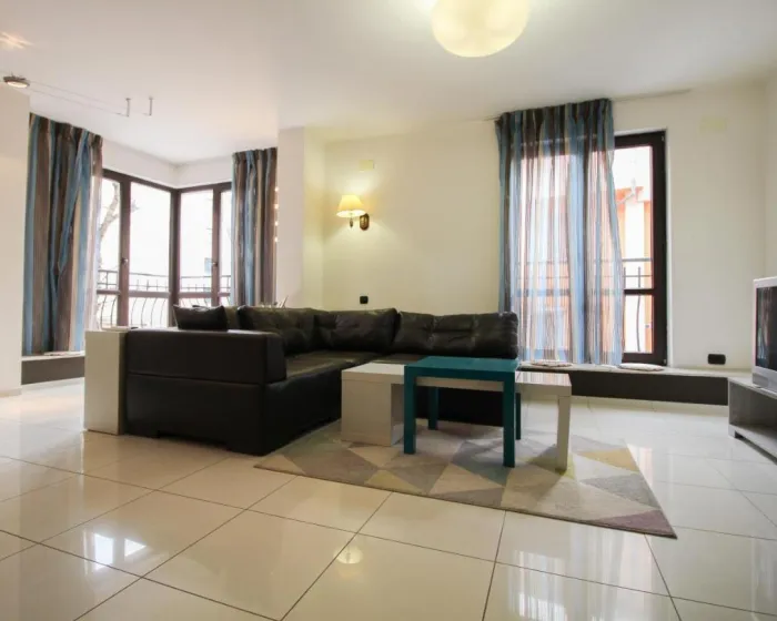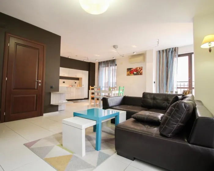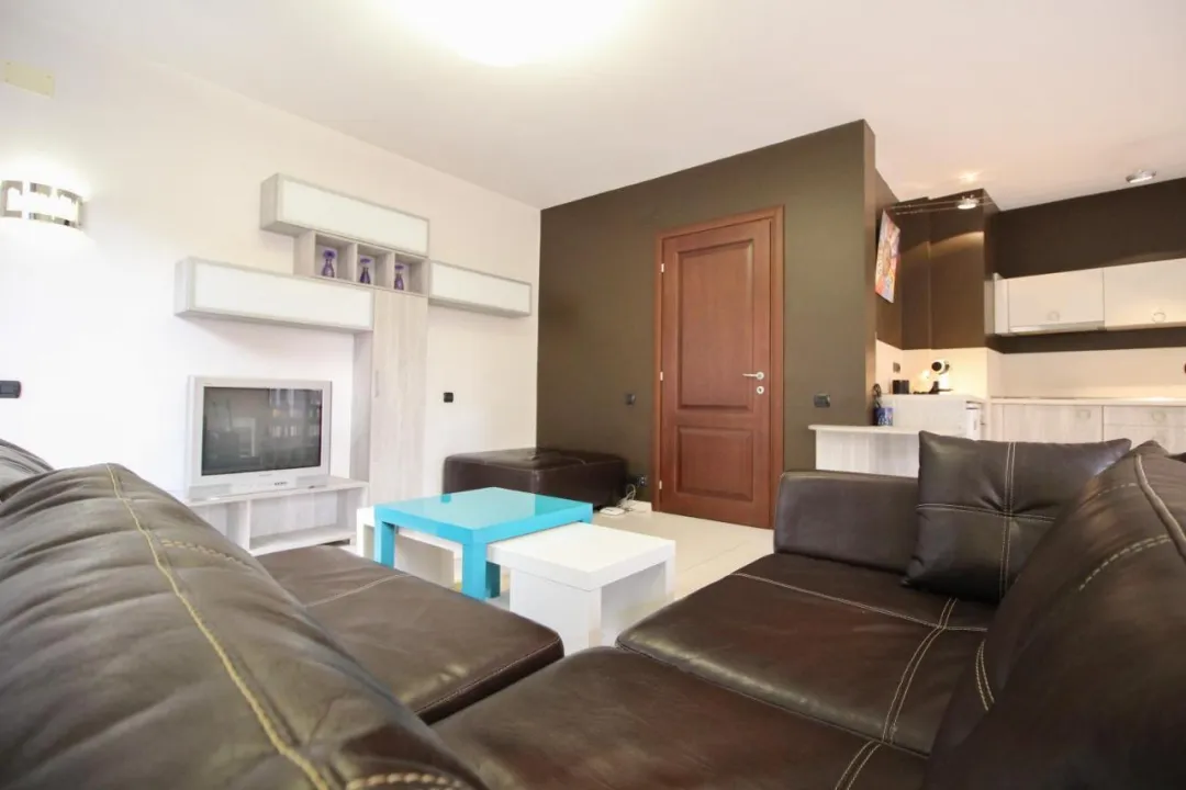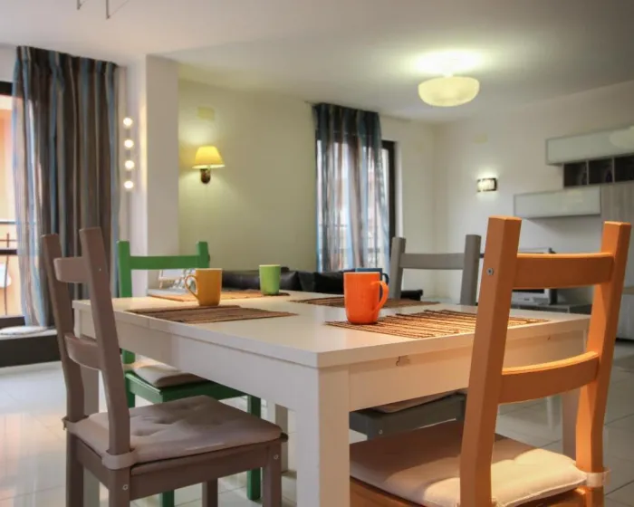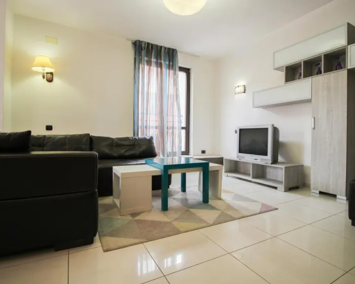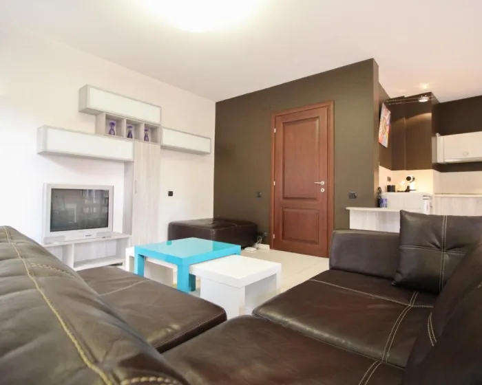 Apartman sa klima uređajem se sastoji od spavaće sobe, potpuno opremljene kuhinje u otvorenom planu sa trpezarijom, dnevnog boravka sa TV-om, i kupatila sa tušem, bideom i WC-om. Tu je takođe i veš mašina, a peškiri i posteljina su obezbeđeni.